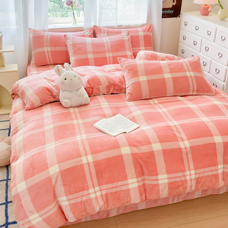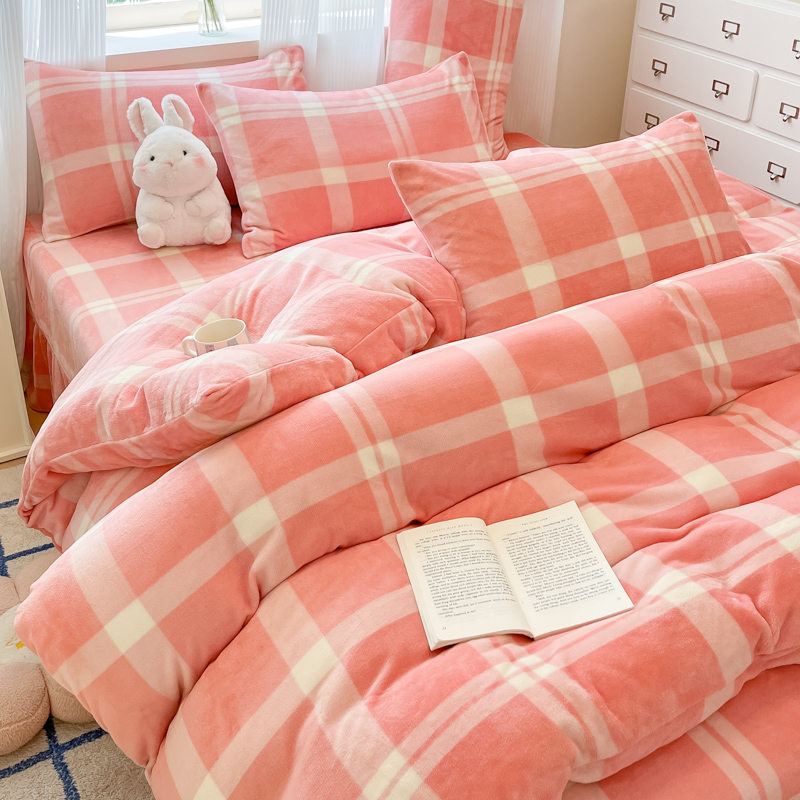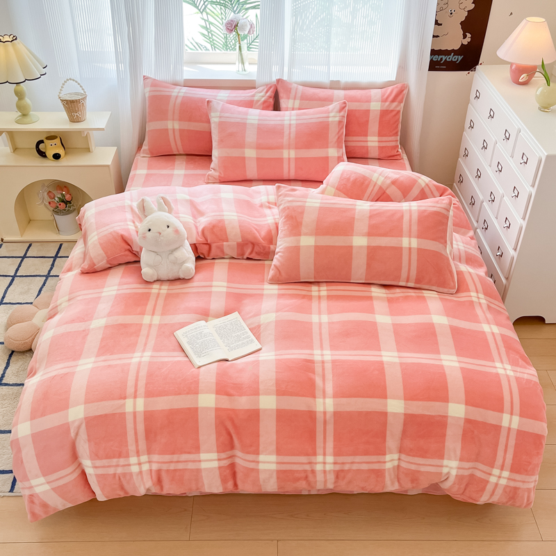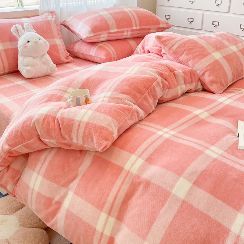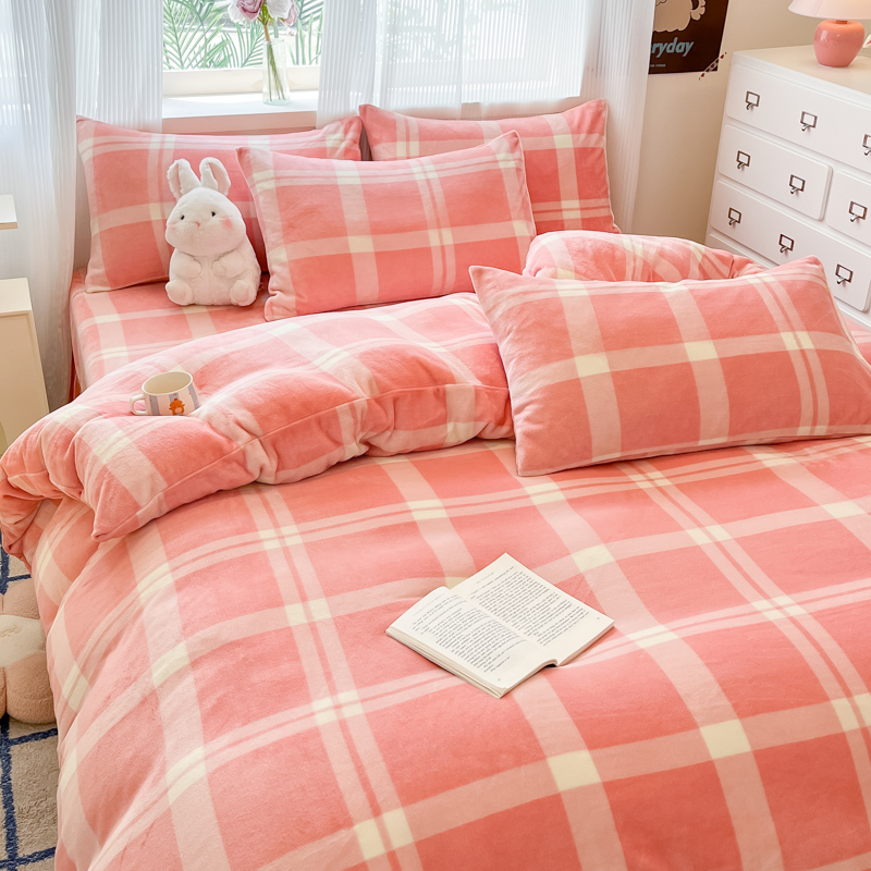 绘萱家居 2025新款高克重印花牛奶绒四件套条格-粉
