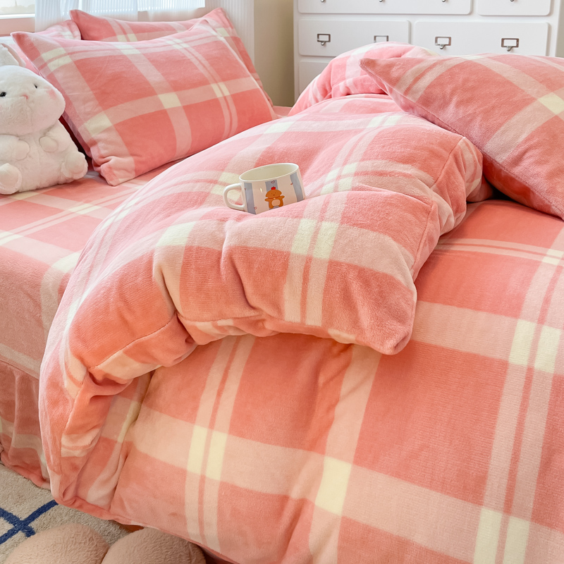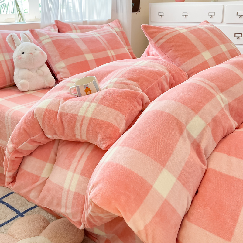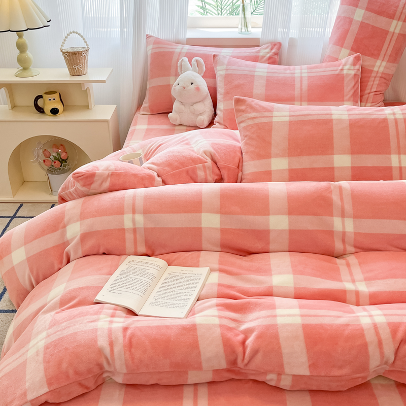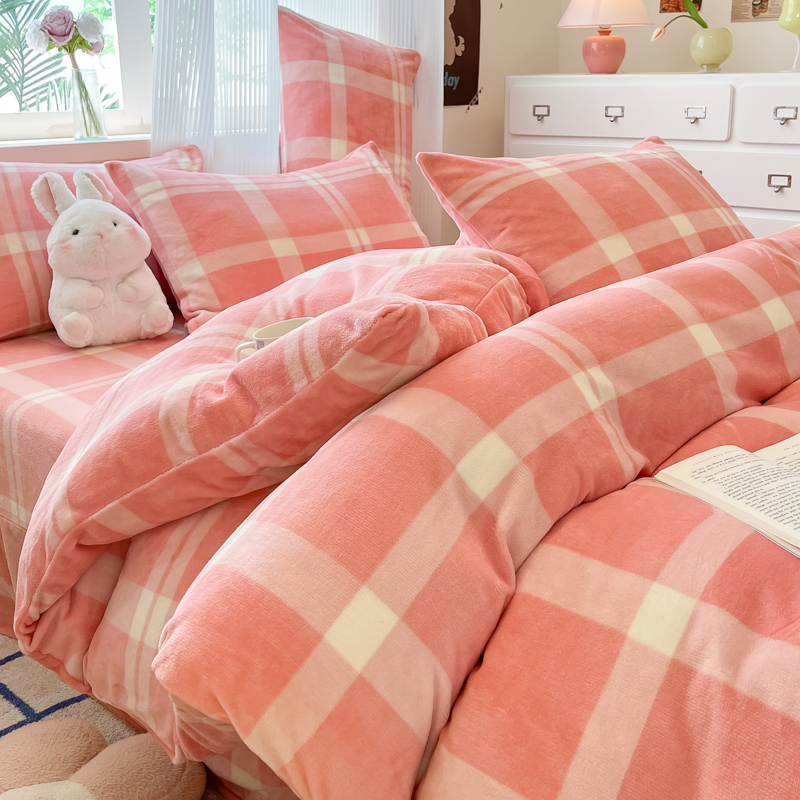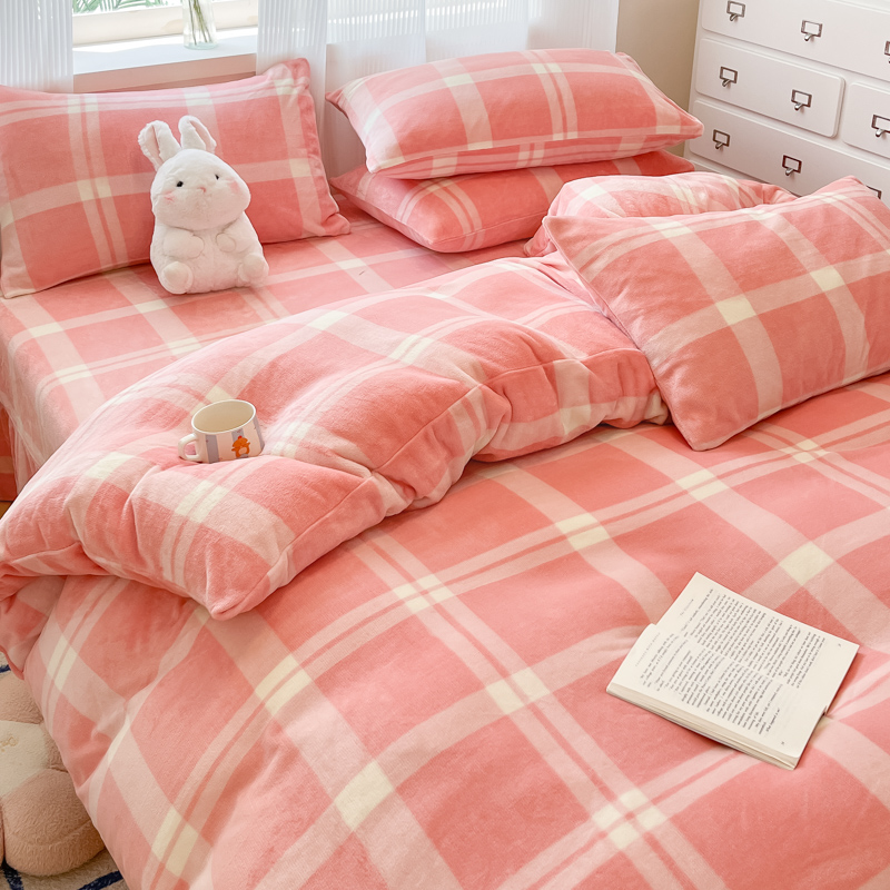绘萱家居 2025新款高克重印花牛奶绒四件套条格-粉