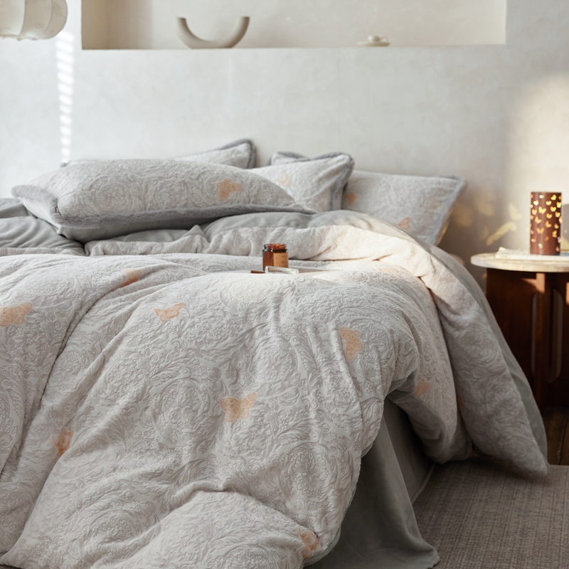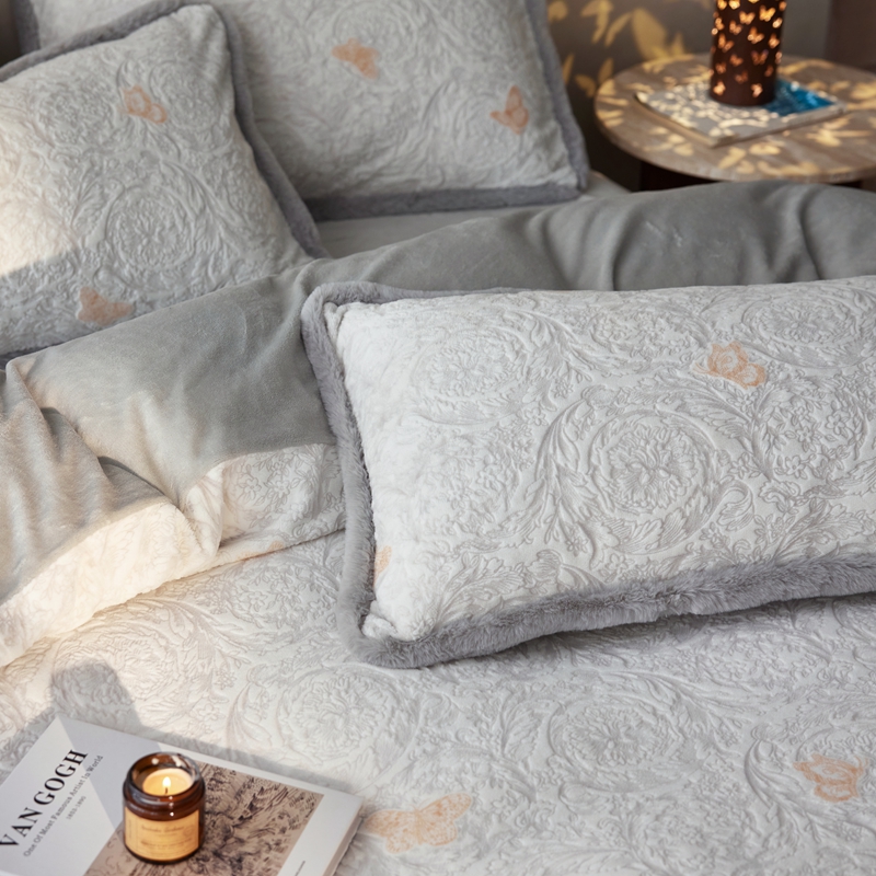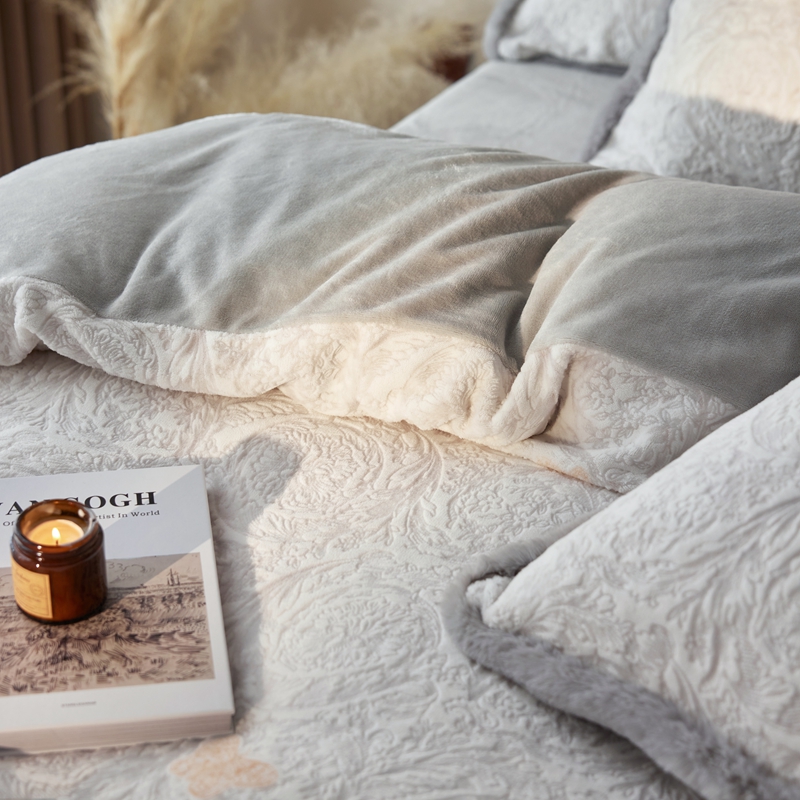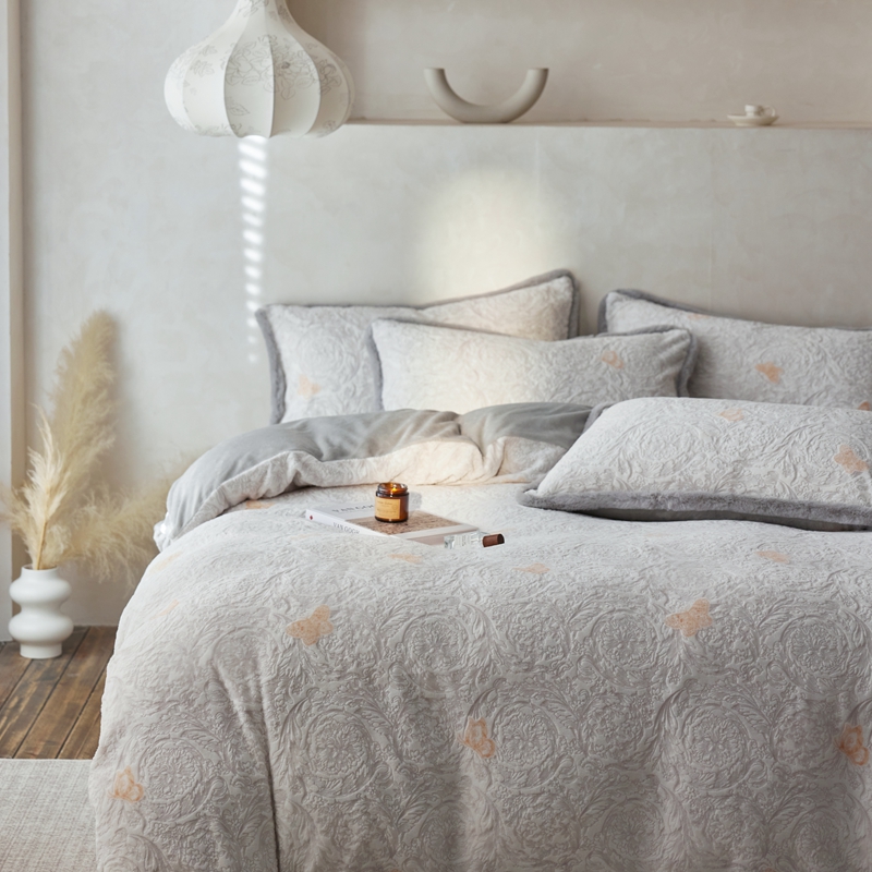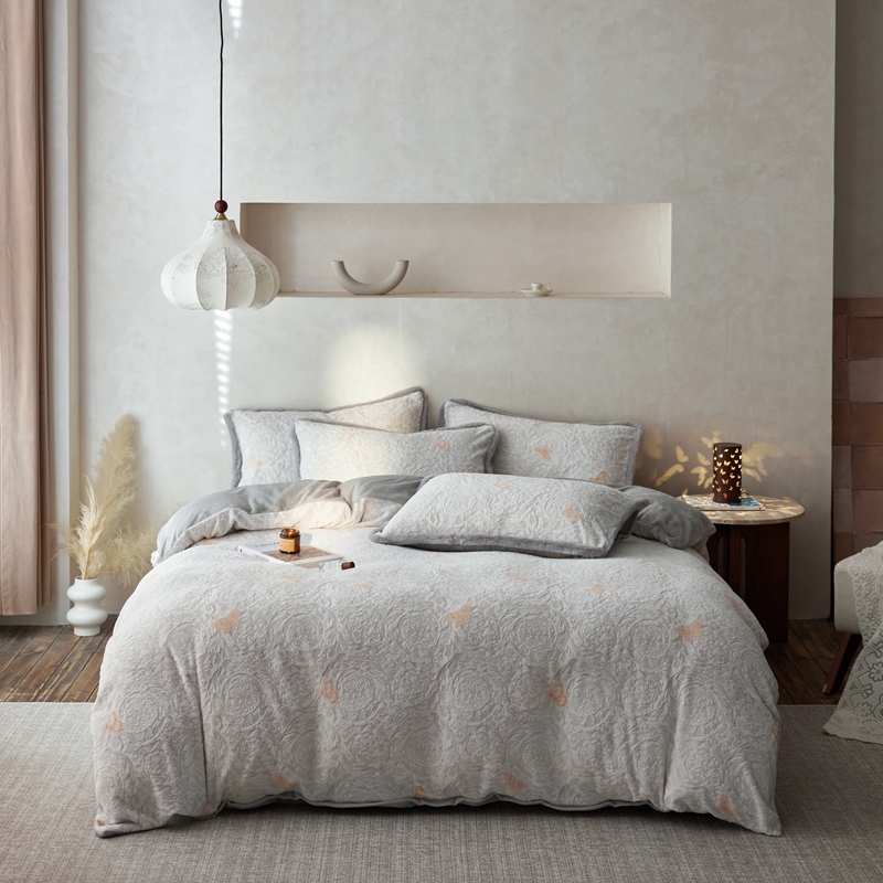 商品名称:初拾 2024新款250g牛奶绒雕花法式四件套—艾米丽(场景一) 艾丽米-浅灰