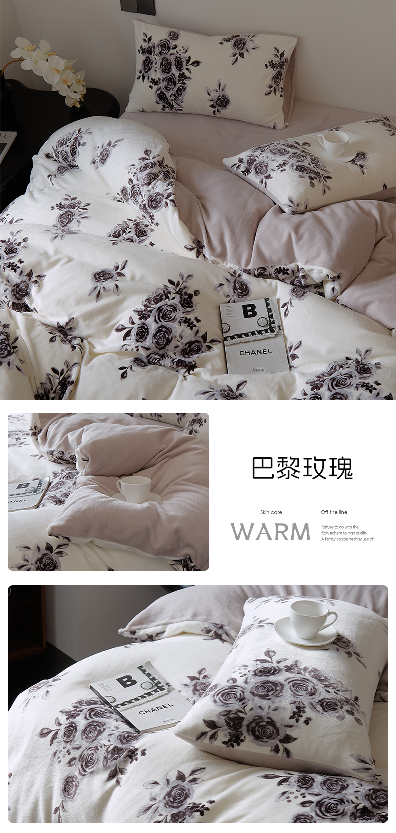 当前位置: 91家纺网 > 商品网购 > 床品套件 > 四件套 > 牛奶绒四件套 > 时光里 2024新款230克牛奶绒印花四件套 巴黎玫瑰