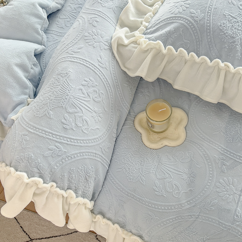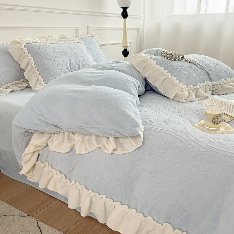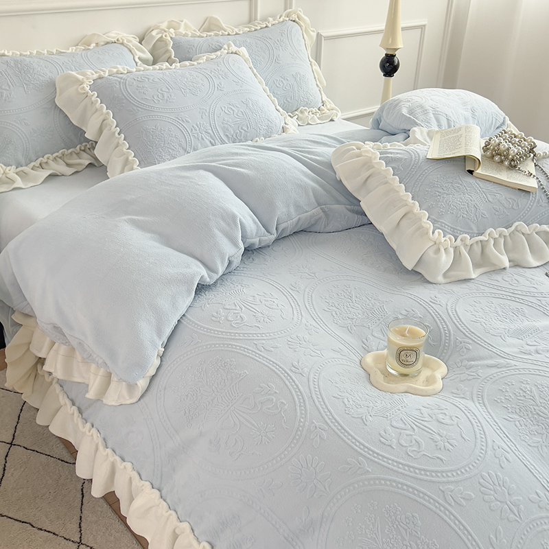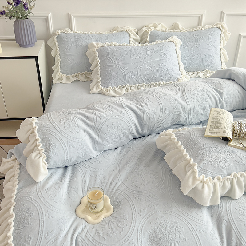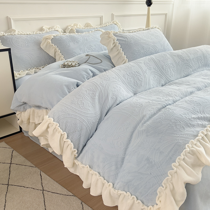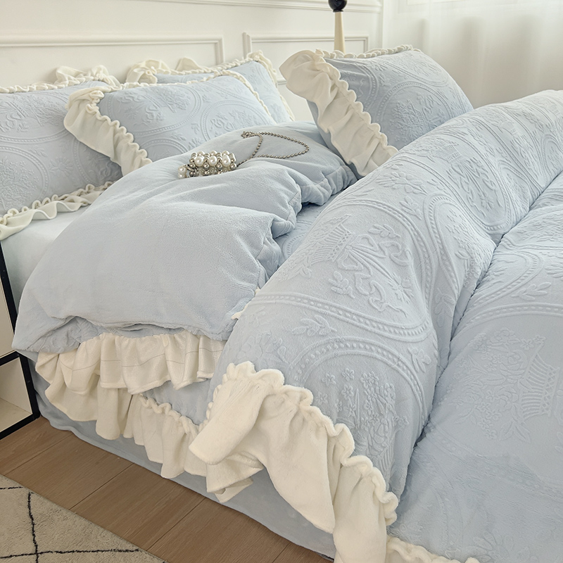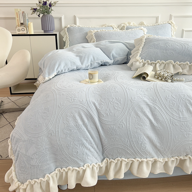 商品名称:小主驾到 2024新款雕花绒牛奶绒法式轻奢公主风四件套 浪漫主义-蓝色