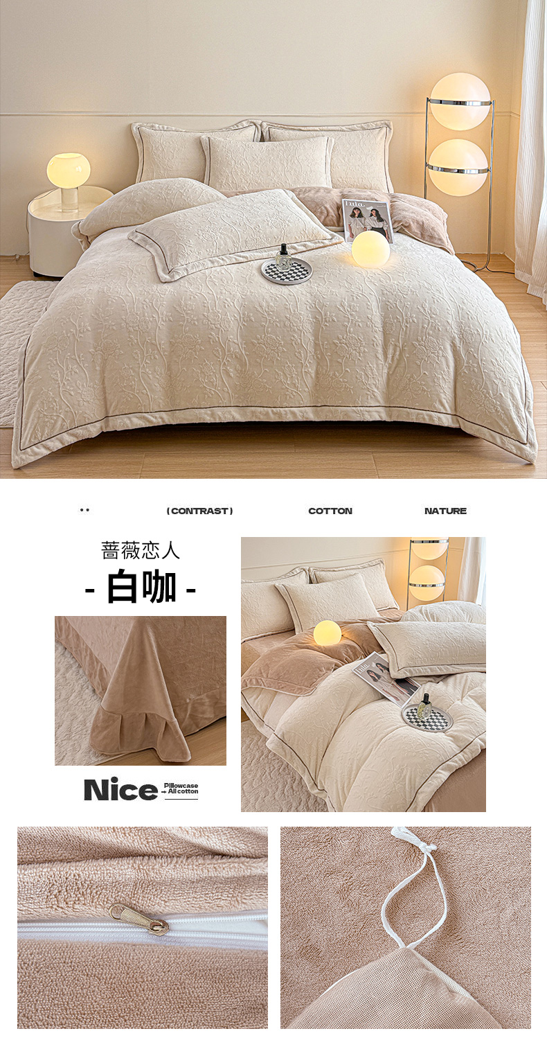 当前位置: 91家纺网 > 商品网购 > 床品套件 > 四件套 > 其它四件套 > (买家秀爆款不断货)A类母婴级牛奶绒雕花四件套珊瑚绒小香风牛奶绒四件套雪花绒四件套雕花绒四件套压线款 蔷薇恋人-白咖