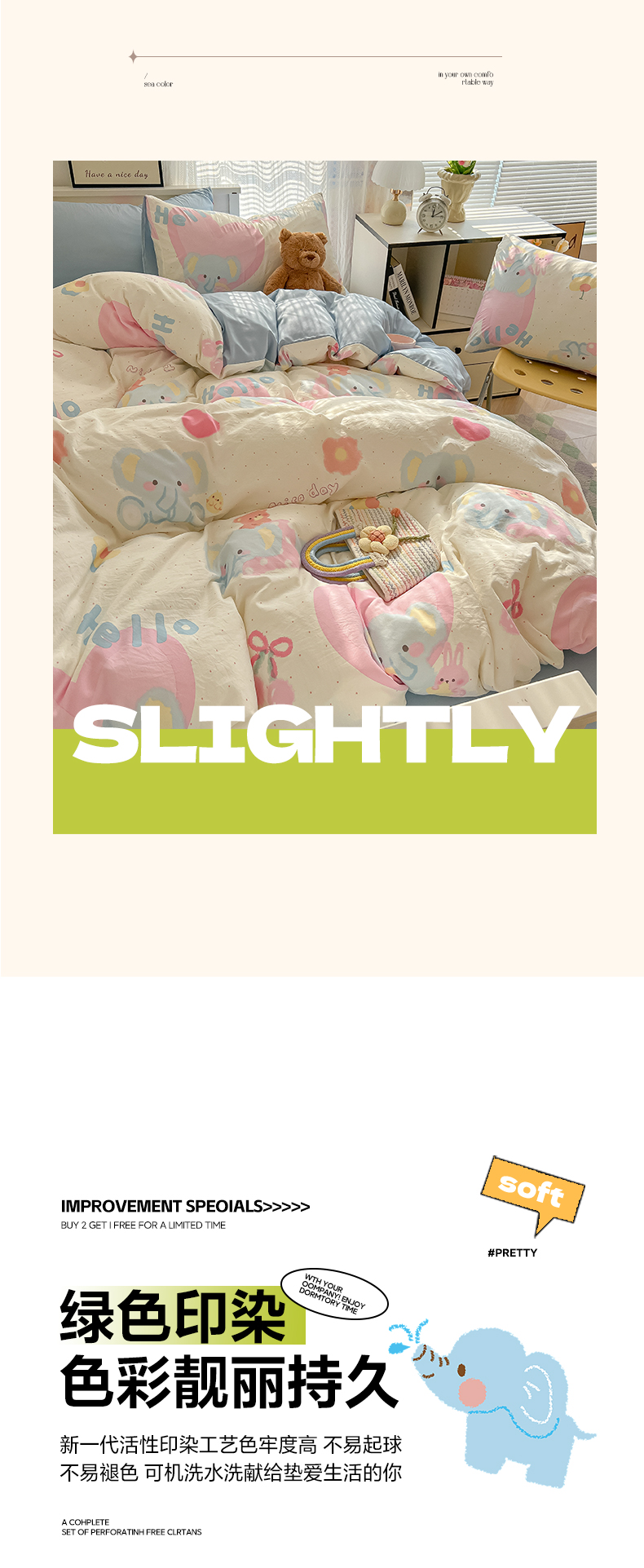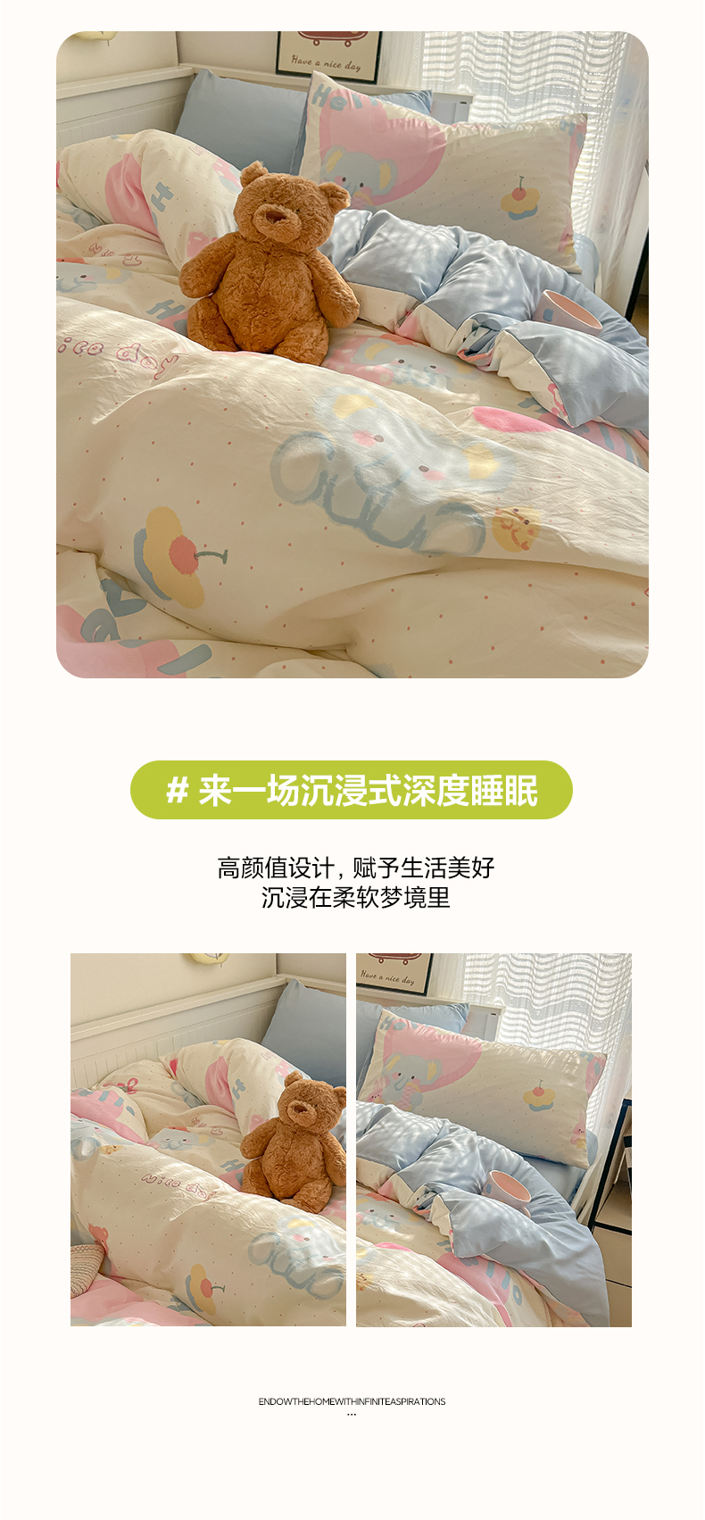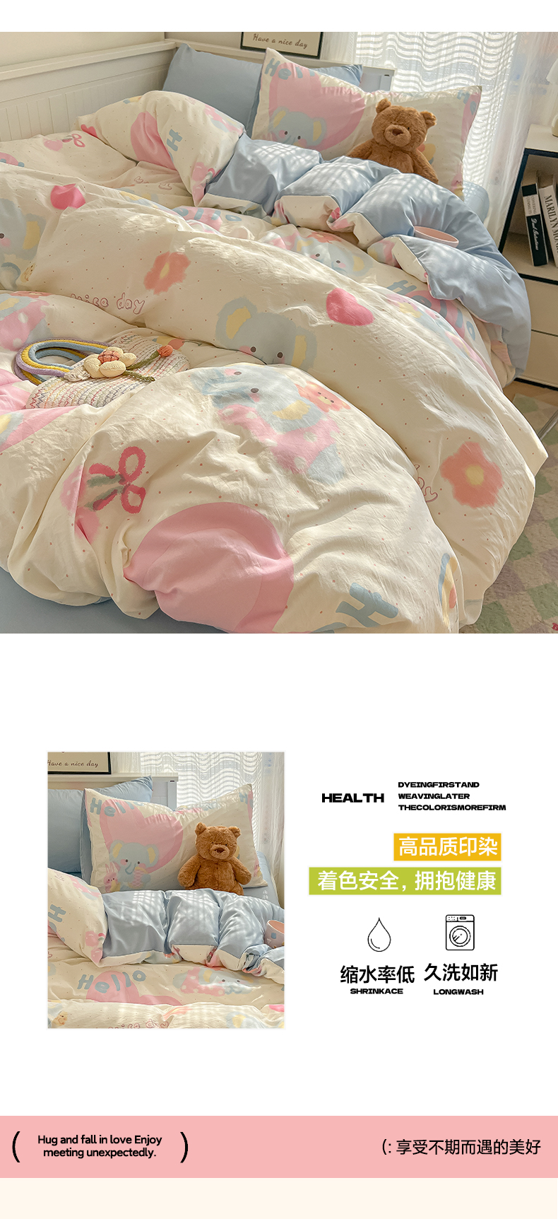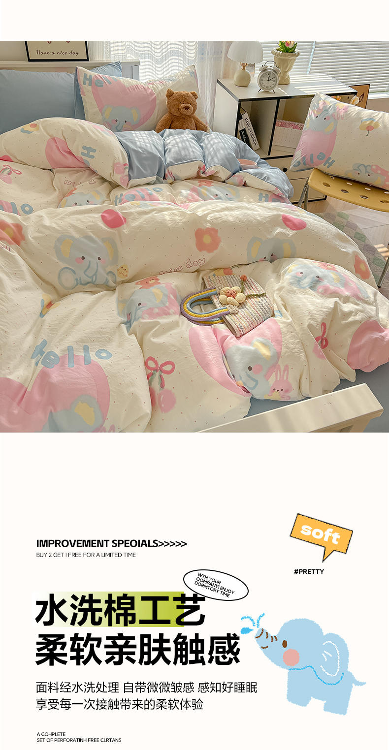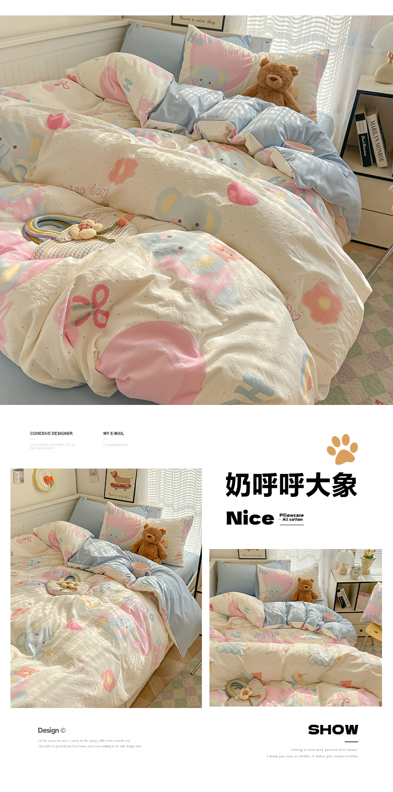 当前位置: 91家纺网 > 商品网购 > 床品套件 > 四件套 > 水洗棉四件套 > 2025新款可爱卡通AB版水洗棉印花四件套 奶呼呼大象