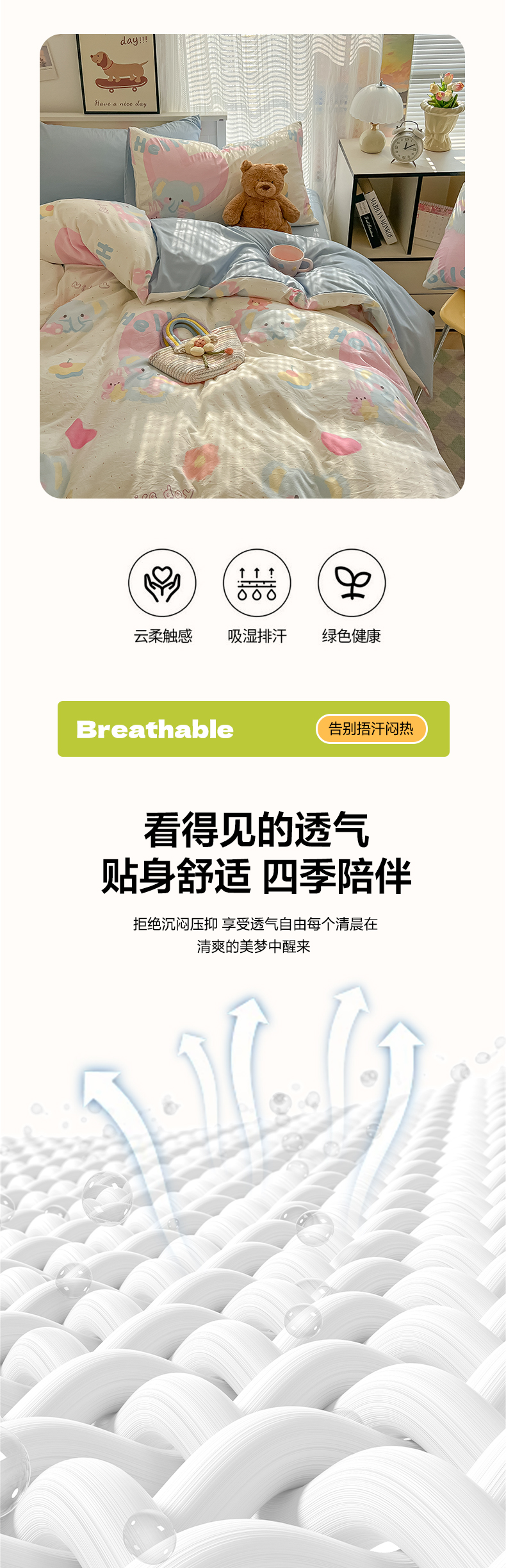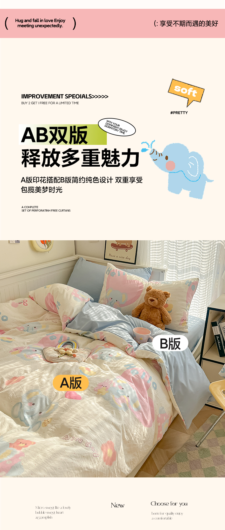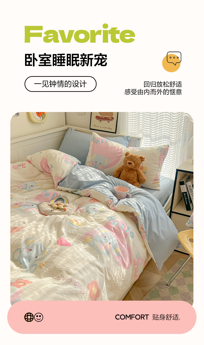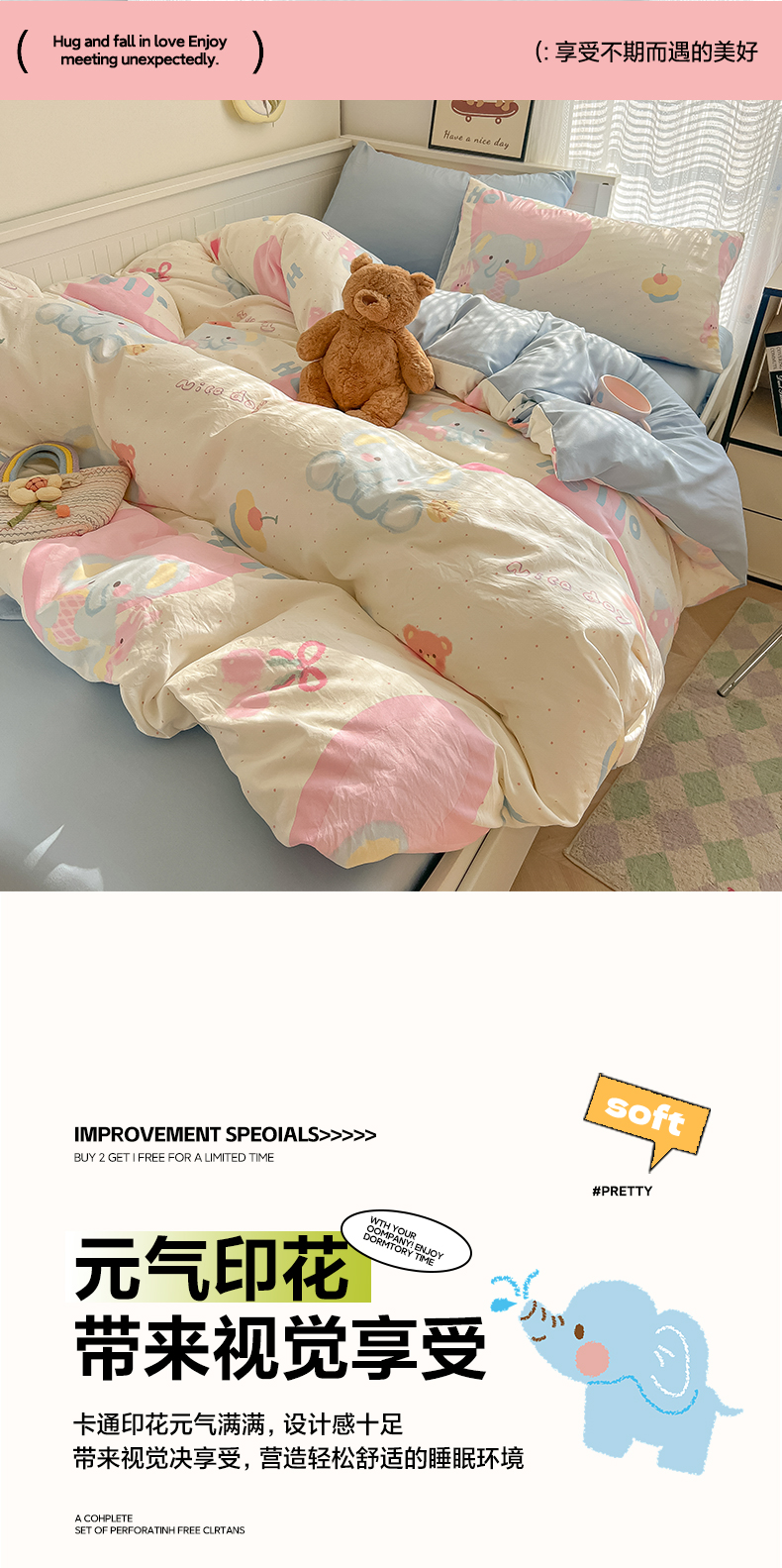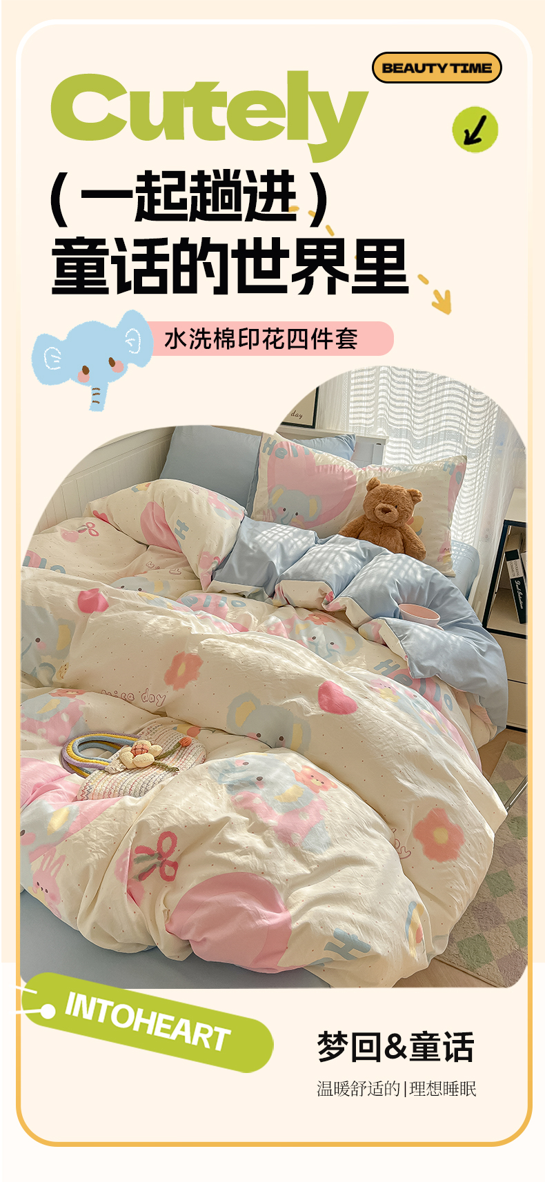 当前位置: 91家纺网 > 商品网购 > 床品套件 > 四件套 > 水洗棉四件套 > 2025新款可爱卡通AB版水洗棉印花四件套 奶呼呼大象