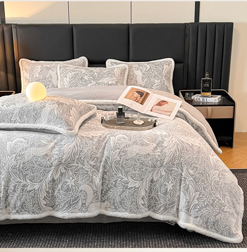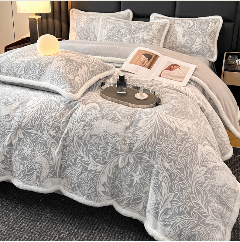 畅畅家纺 2025新款兔毛绒大包边雕花牛奶绒绒四件套 香缇娜-灰