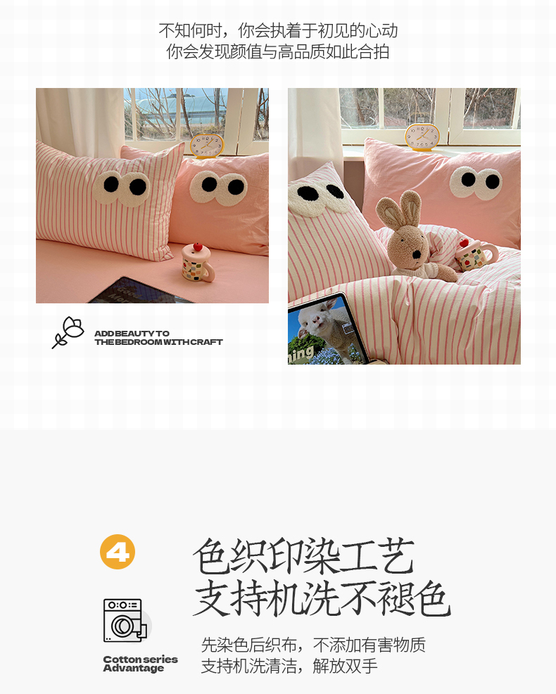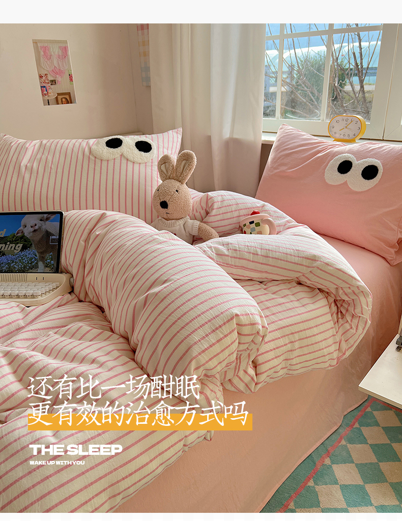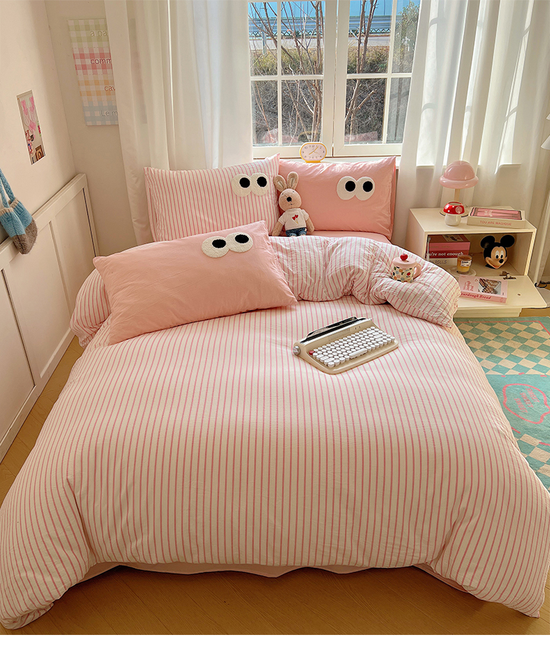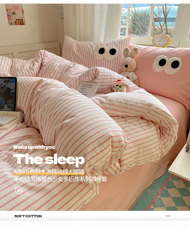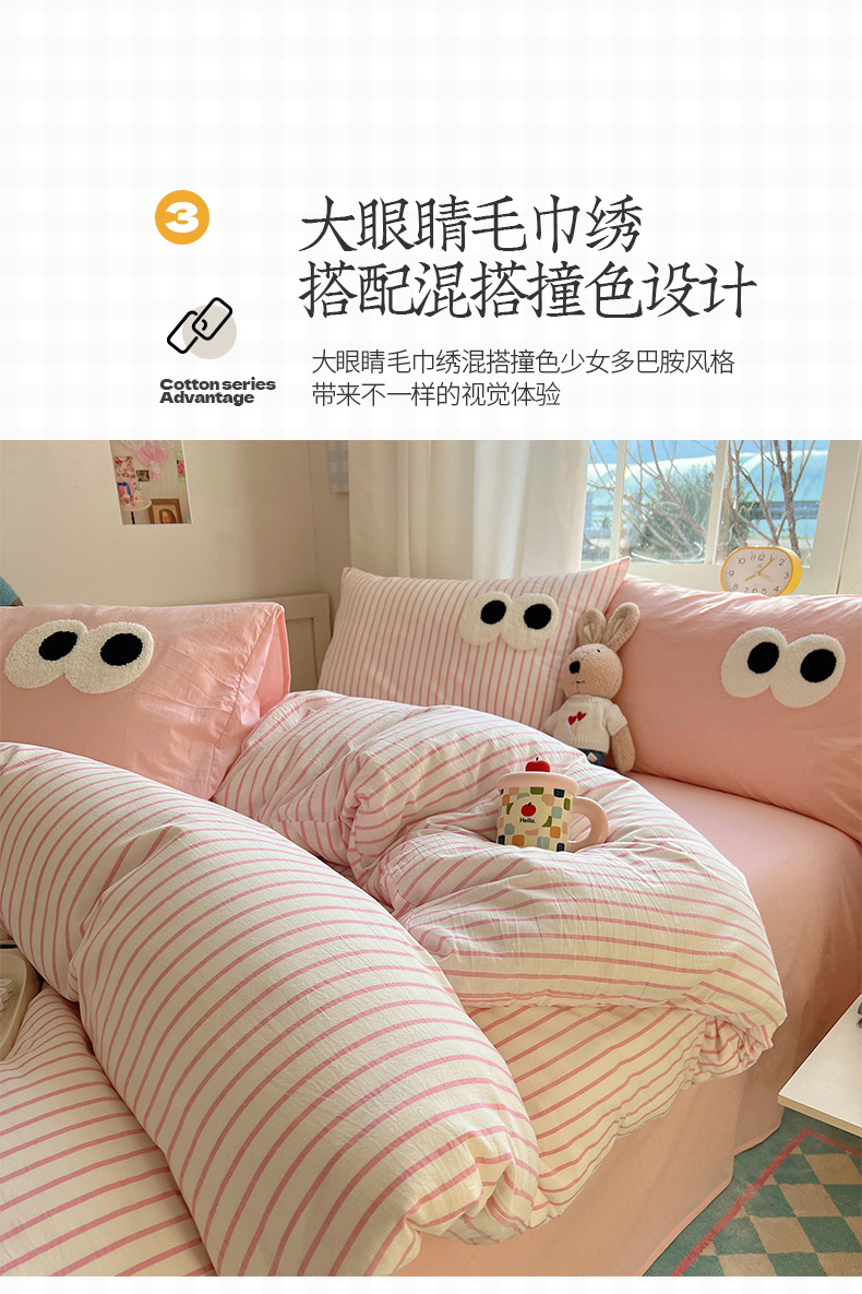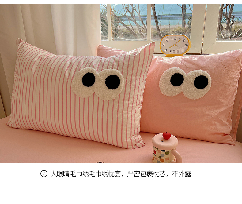 当前位置: 91家纺网 > 商品网购 > 床品套件 > 四件套 > 水洗棉四件套 > 桃子家居 2026新款A类ins色织水洗棉纯棉大眼睛毛巾绣混搭撞色少女多巴胺系列四件套 色织水洗棉-大眼粉条粉粉