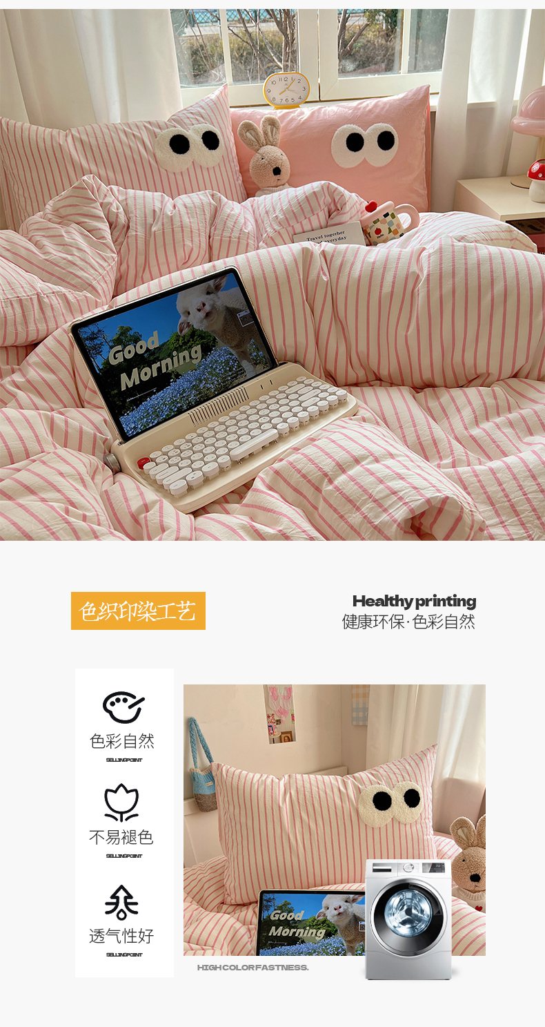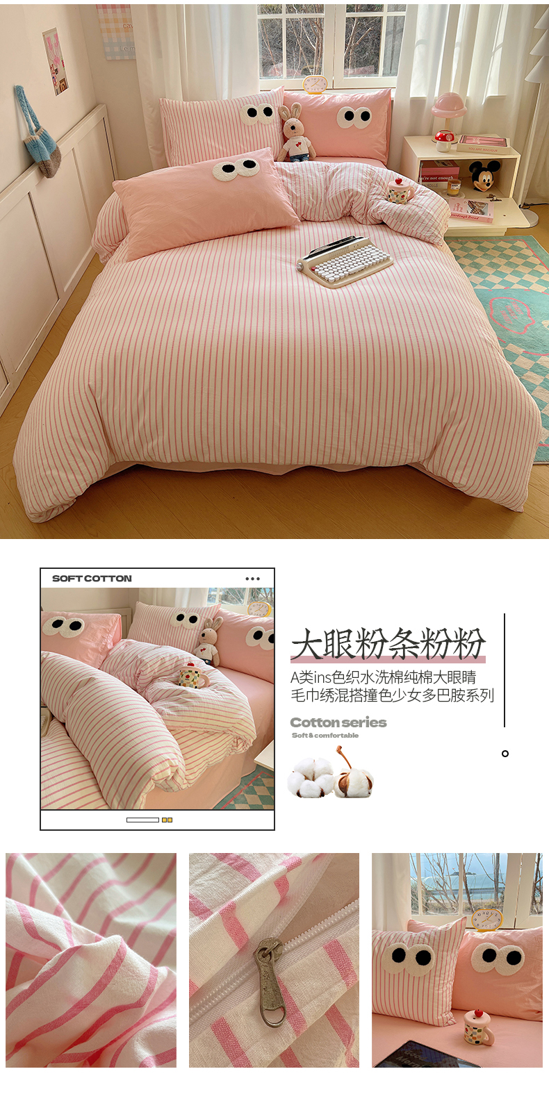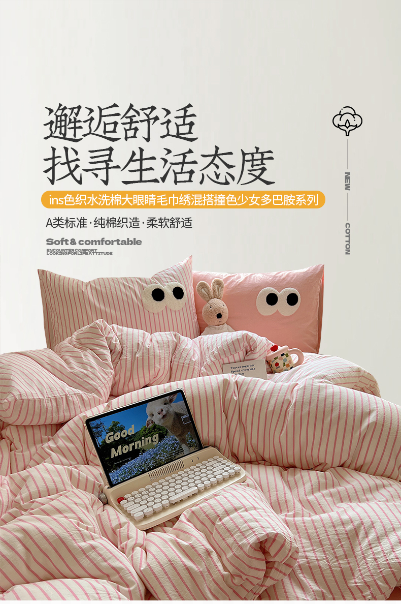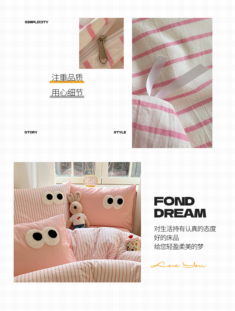 当前位置: 91家纺网 > 商品网购 > 床品套件 > 四件套 > 水洗棉四件套 > 桃子家居 2026新款A类ins色织水洗棉纯棉大眼睛毛巾绣混搭撞色少女多巴胺系列四件套 色织水洗棉-大眼粉条粉粉