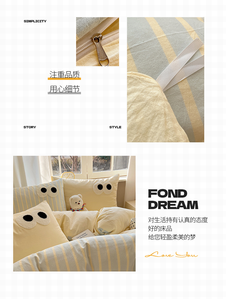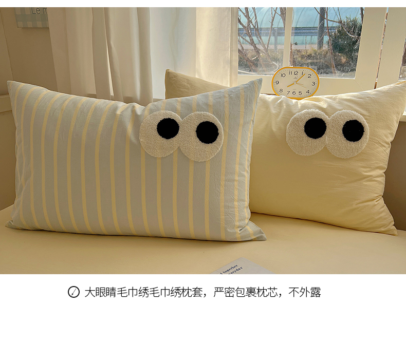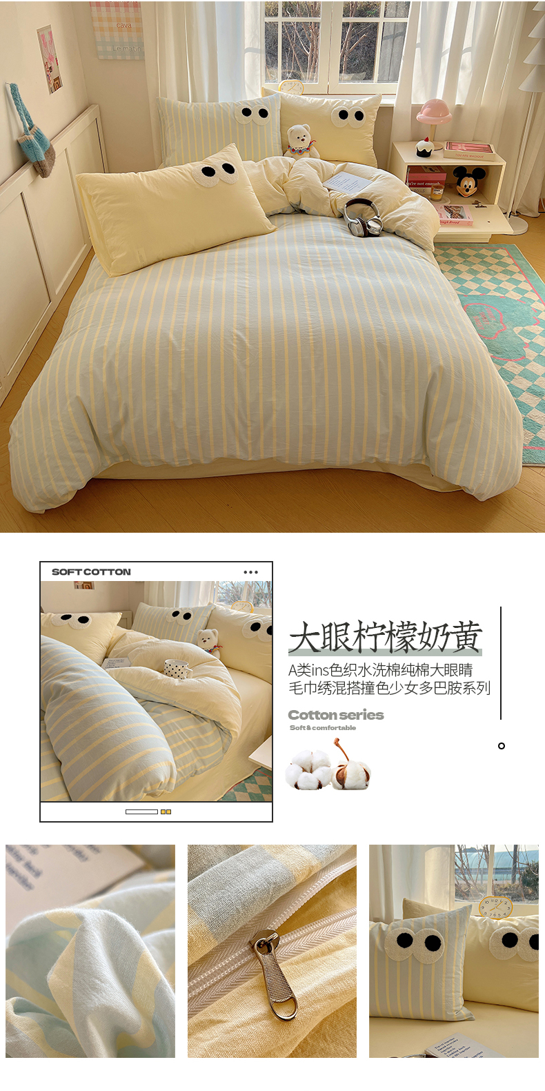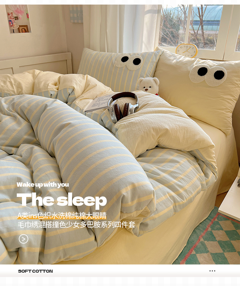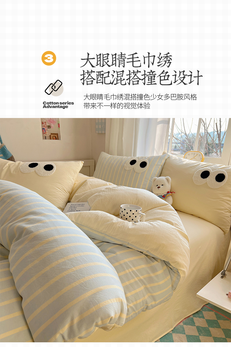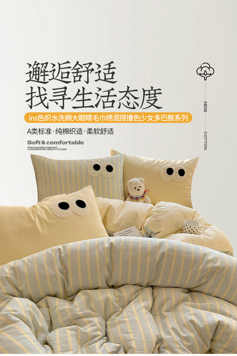 当前位置: 91家纺网 > 商品网购 > 床品套件 > 四件套 > 水洗棉四件套 > 桃子家居 2026新款A类ins色织水洗棉纯棉大眼睛毛巾绣混搭撞色少女多巴胺系列四件套 色织水洗棉-大眼柠檬奶黄