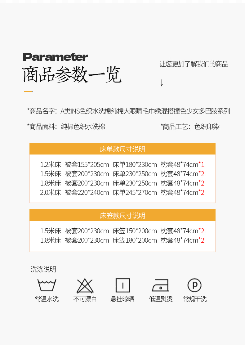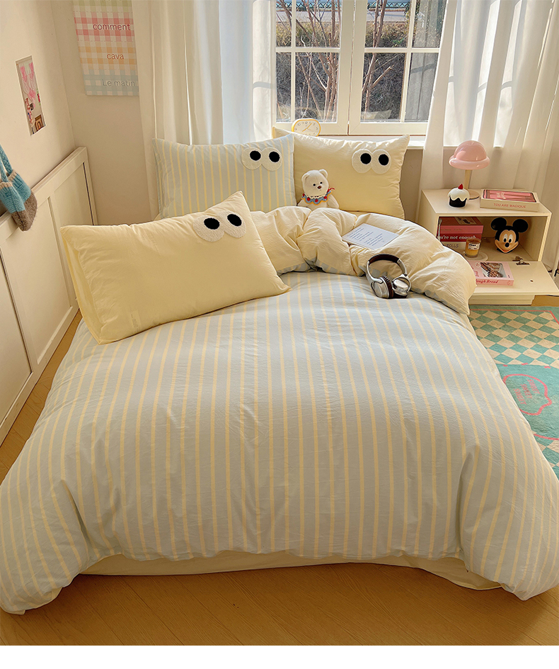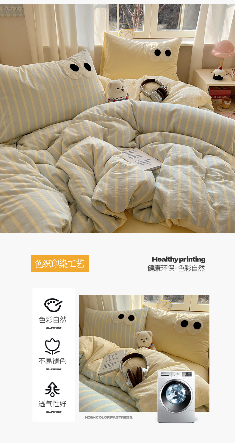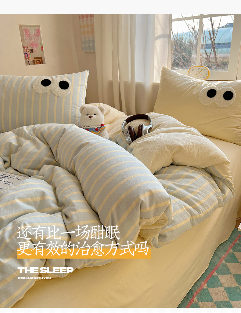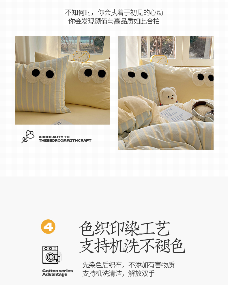 当前位置: 91家纺网 > 商品网购 > 床品套件 > 四件套 > 水洗棉四件套 > 桃子家居 2026新款A类ins色织水洗棉纯棉大眼睛毛巾绣混搭撞色少女多巴胺系列四件套 色织水洗棉-大眼柠檬奶黄