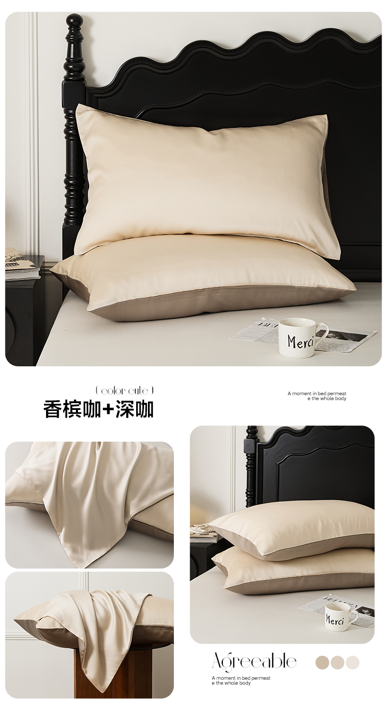 EH家居 2025春夏天丝纯色单枕套 香槟咖+深咖