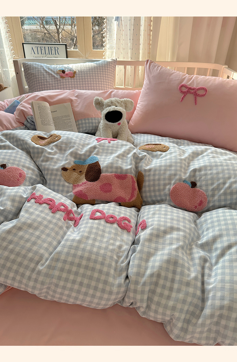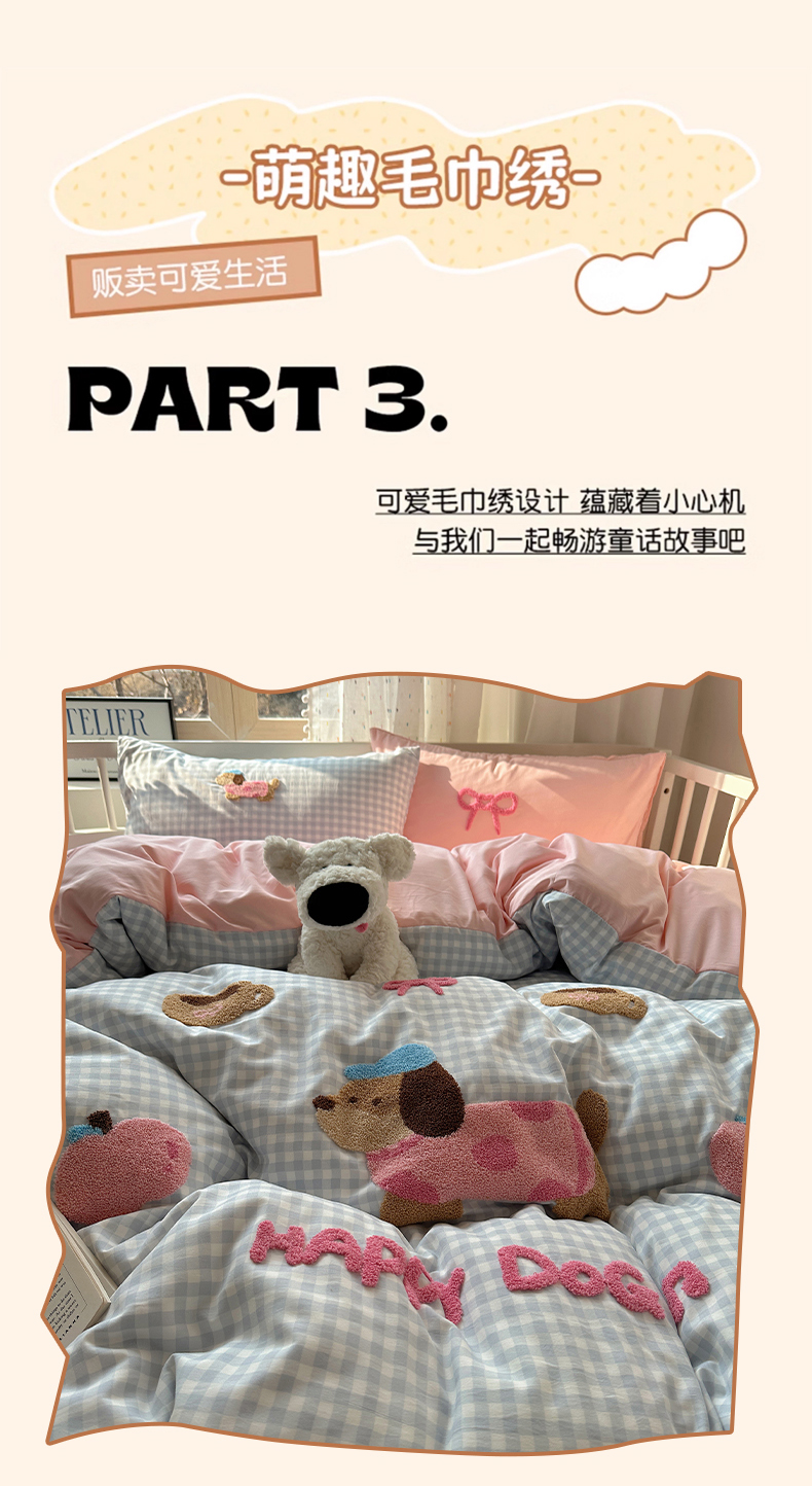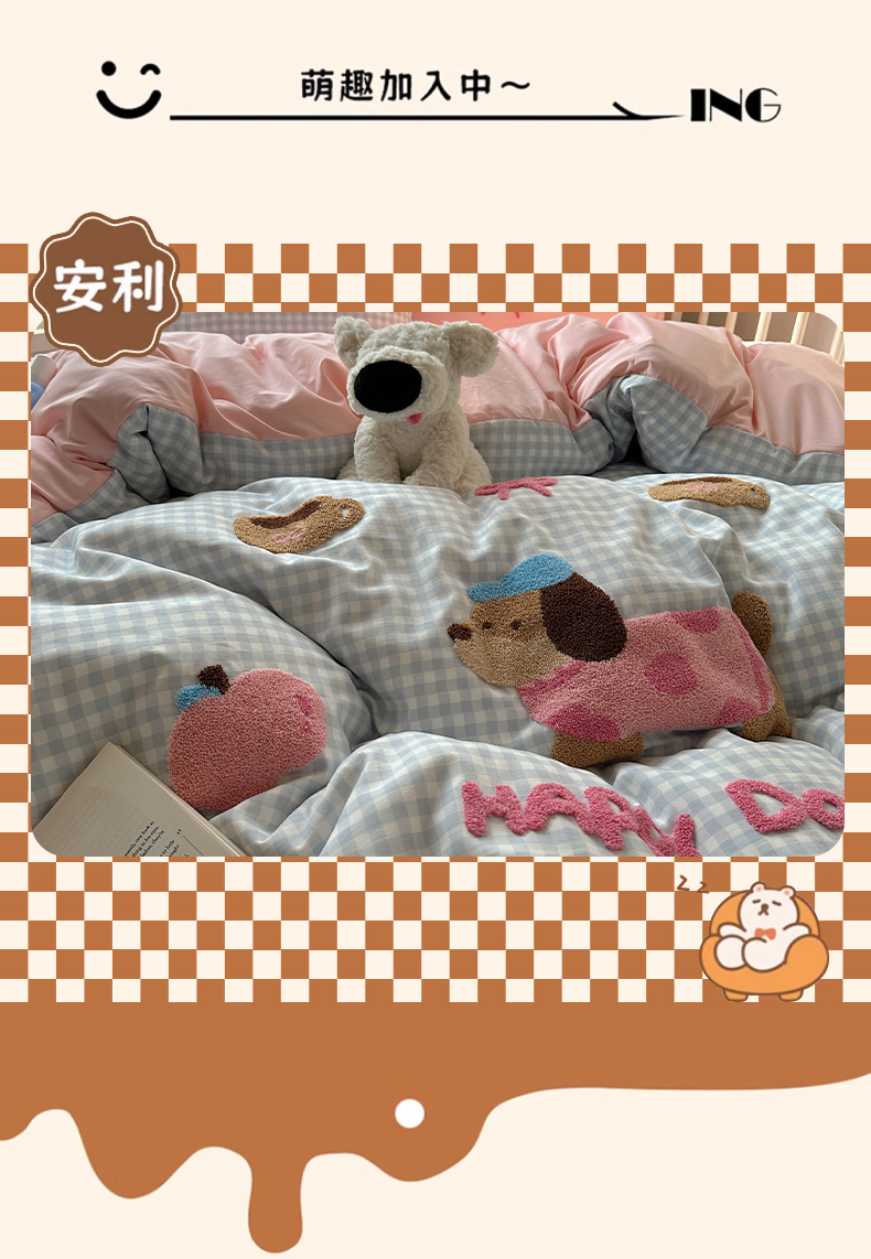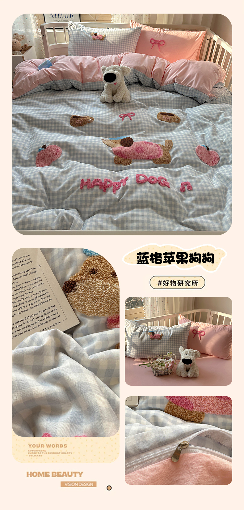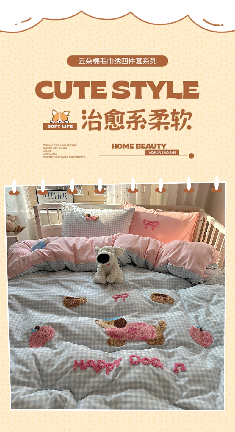 当前位置: 91家纺网 > 商品网购 > 床品套件 > 四件套 > 红嘴企鹅 2025新款水洗棉毛巾绣四件套 蓝格苹果狗狗