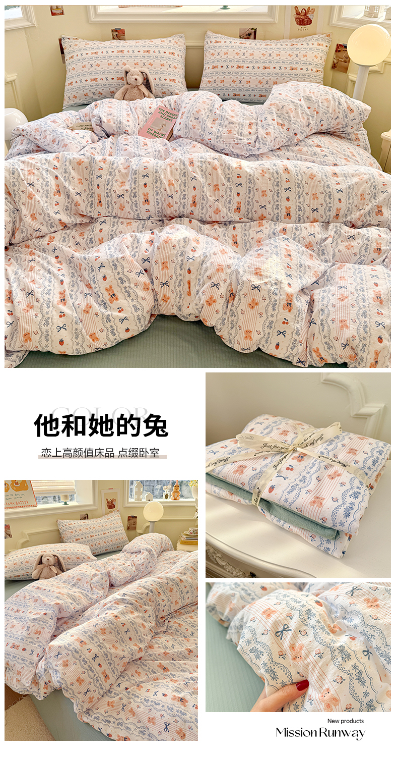 当前位置: 91家纺网 > 商品网购 > 床品套件 > 四件套 > 双层纱四件套 > 罗亿家纺 2025新款云感提花双层纱裸睡四件套 他和她的兔