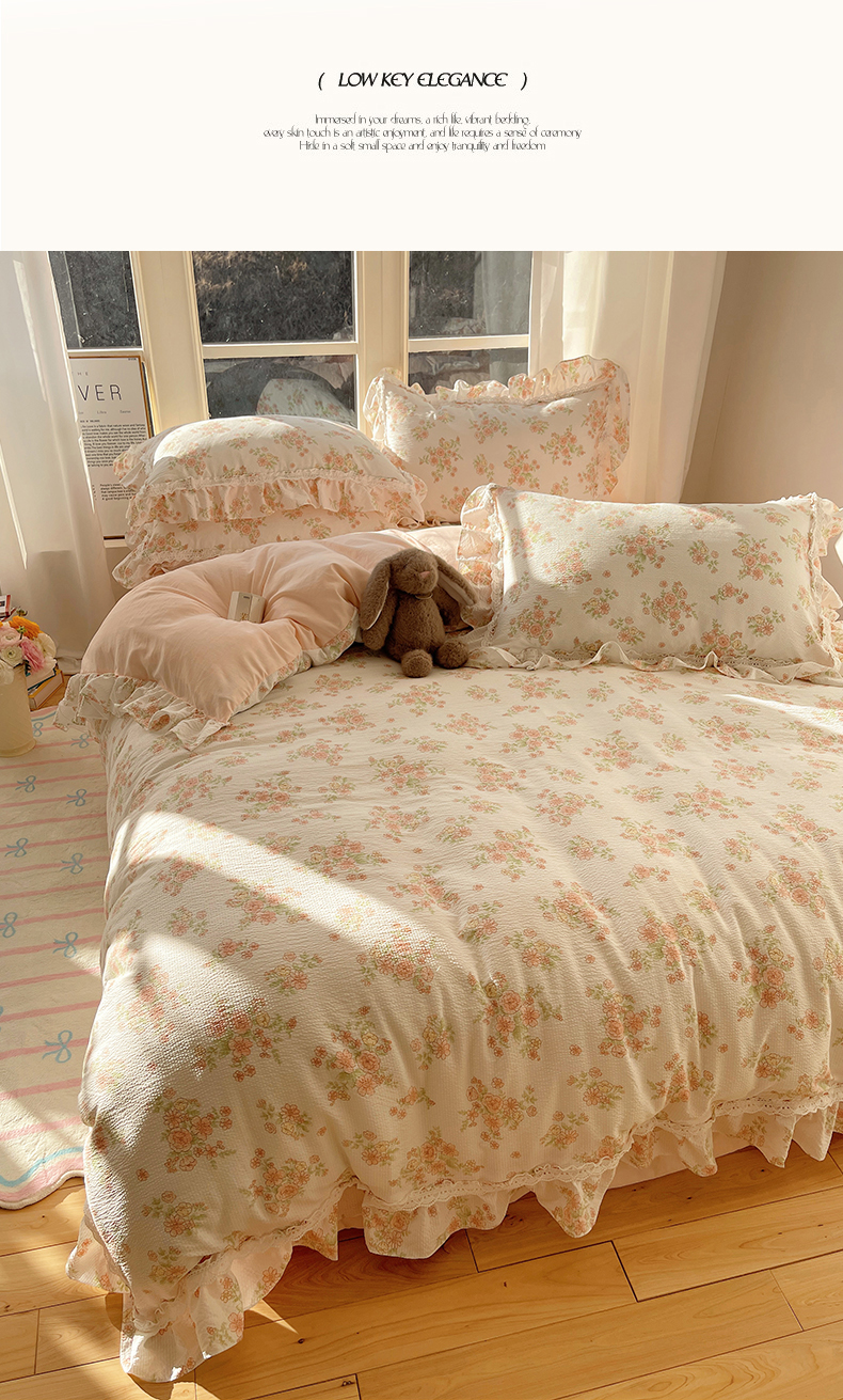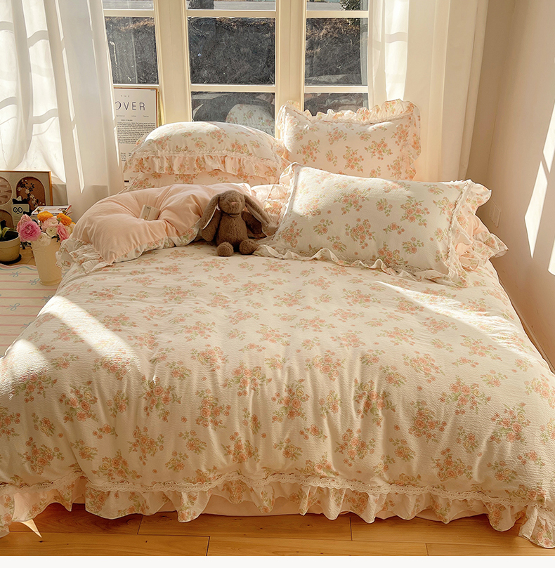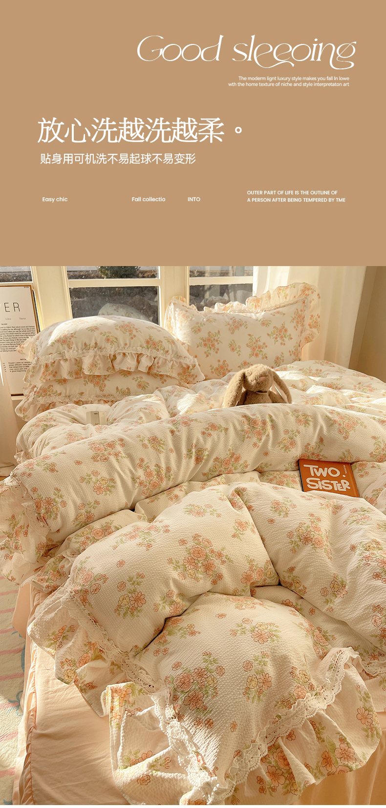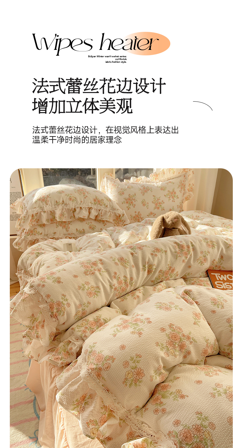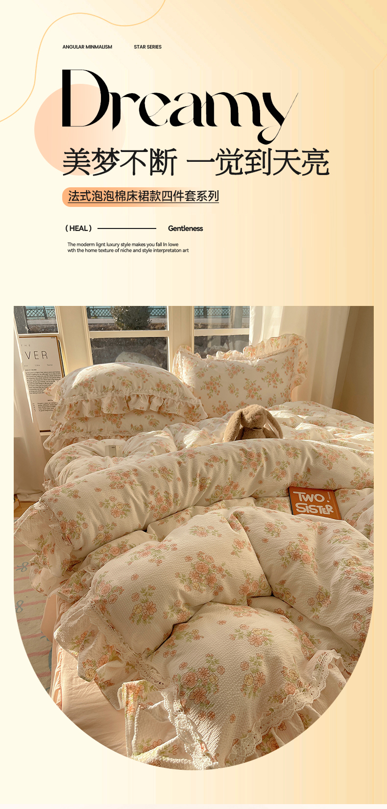 当前位置: 91家纺网 > 商品网购 > 床品套件 > 四件套 > 其它四件套 > 轻奢坊 2025新款法式泡泡棉床裙款四件套 花蕾粉