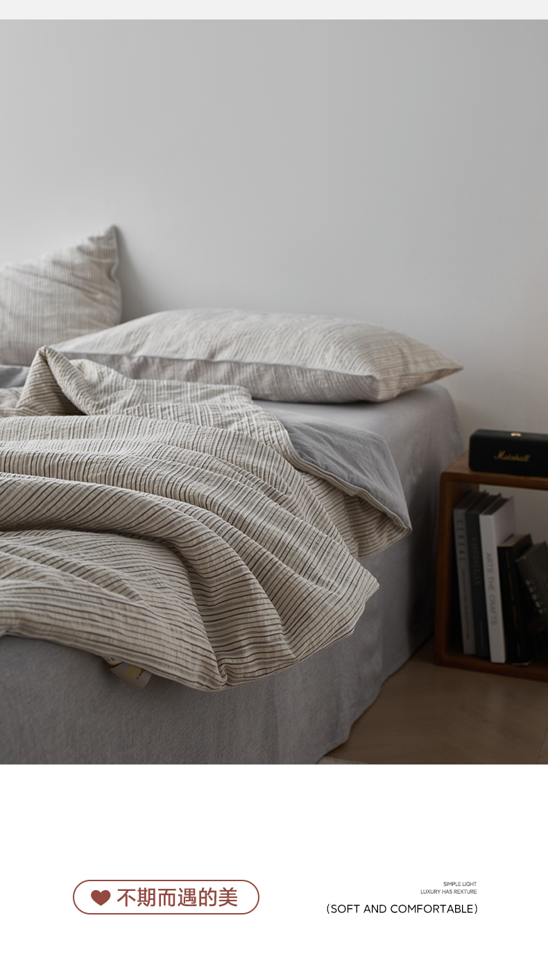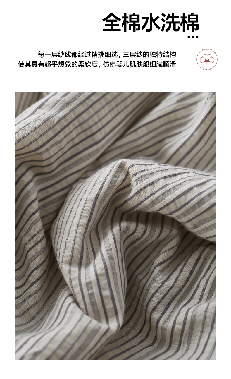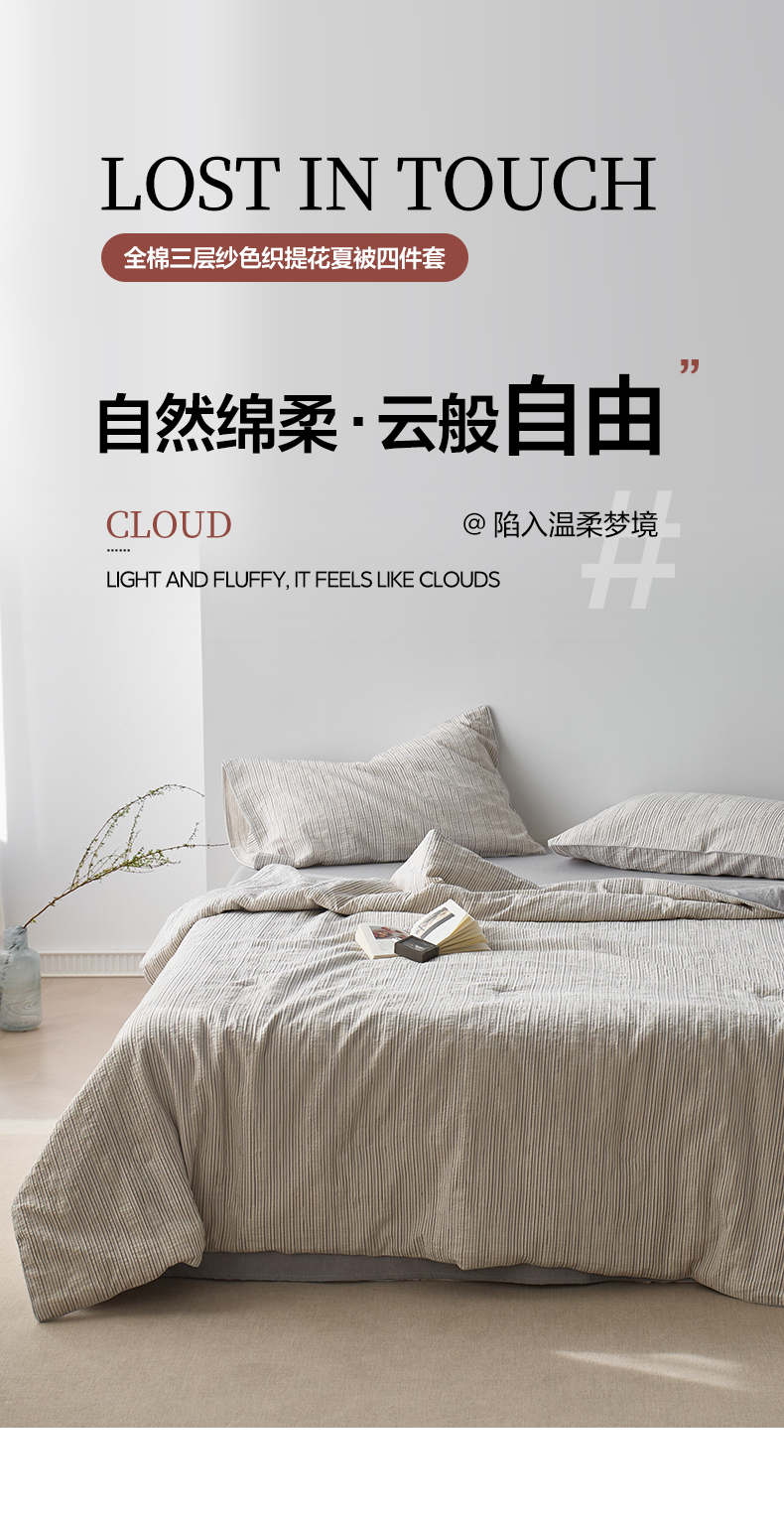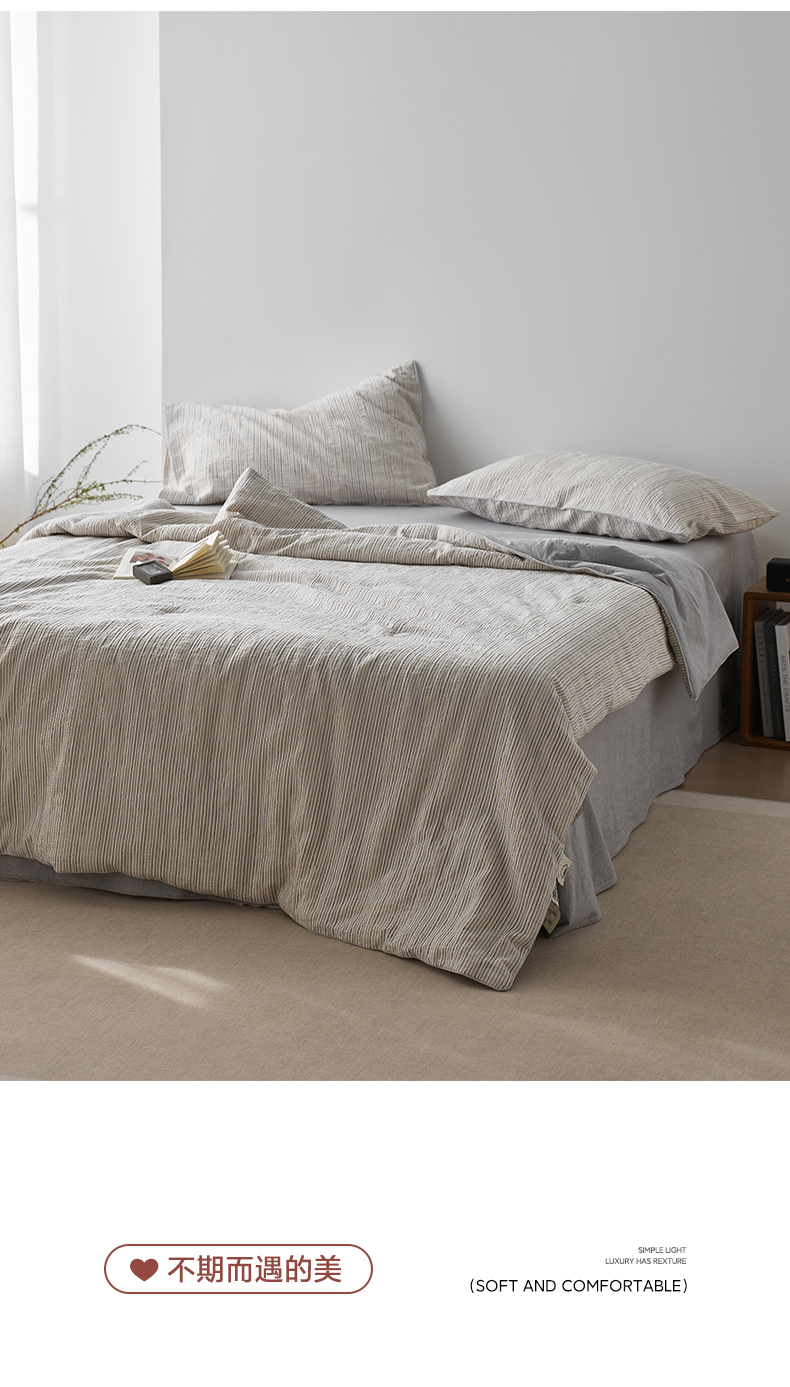 • 91家纺网 家纺一手货源 找家纺 一加一 2025新款水洗色织提花全棉三层纱无印风蚕蛹蛋白夏被四件套 元气蒙蒙灰