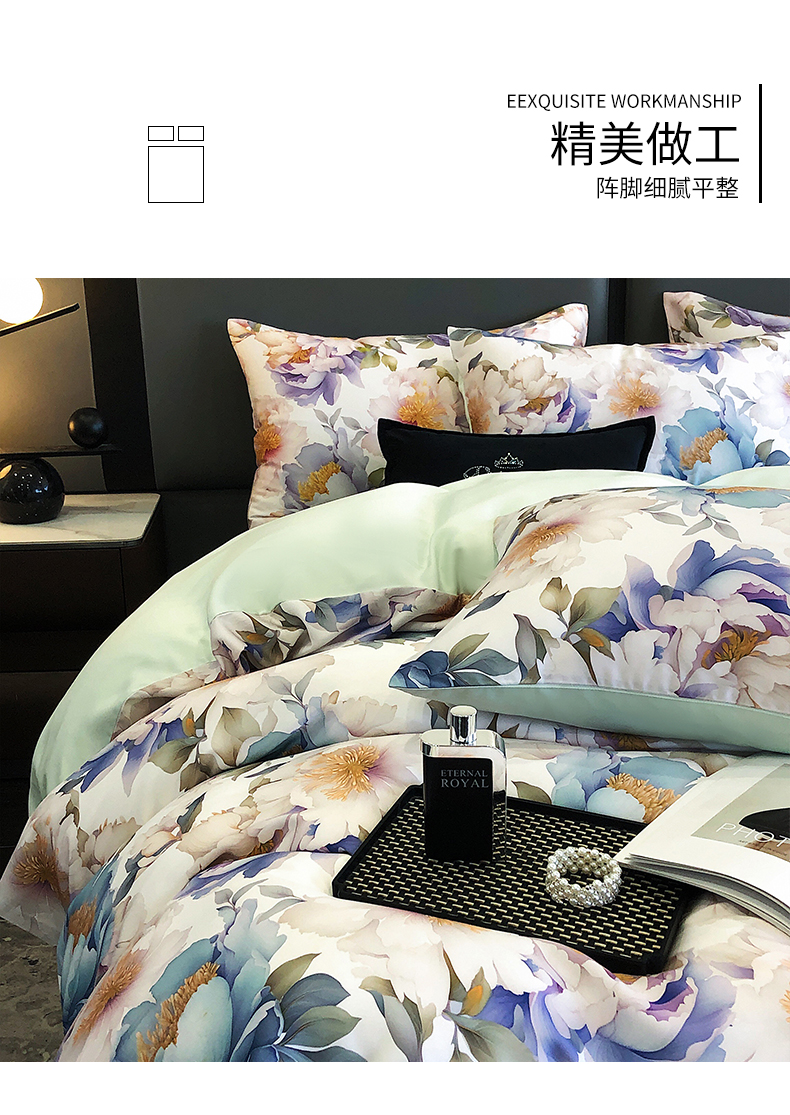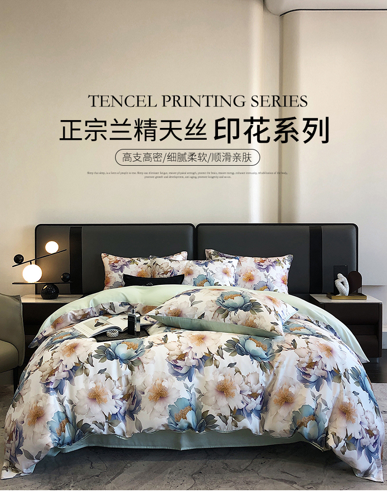 立奥被业 2025年新款100%兰精天丝四件套天丝数码印花四件套 牡丹绿