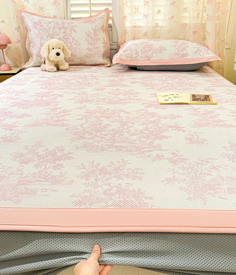 • 91家纺网 家纺一手货源 找家纺 2025新款小清新数码印花床笠款冰藤席 床笠油画庄园-粉