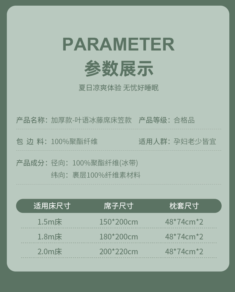 当前位置: 91家纺网 > 商品网购 > 床上用品 > 凉席 > 藤席 > 小牛席业 2025新款加厚款-叶语冰藤席系列(床笠款)凉席藤席冰藤席冰丝席竹席草席空调席乳胶席豆豆席 加厚款-叶语冰藤席系列床笠款-墨绿
