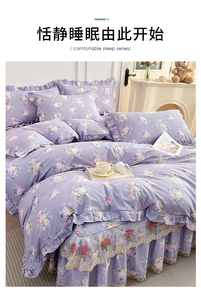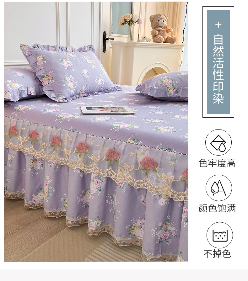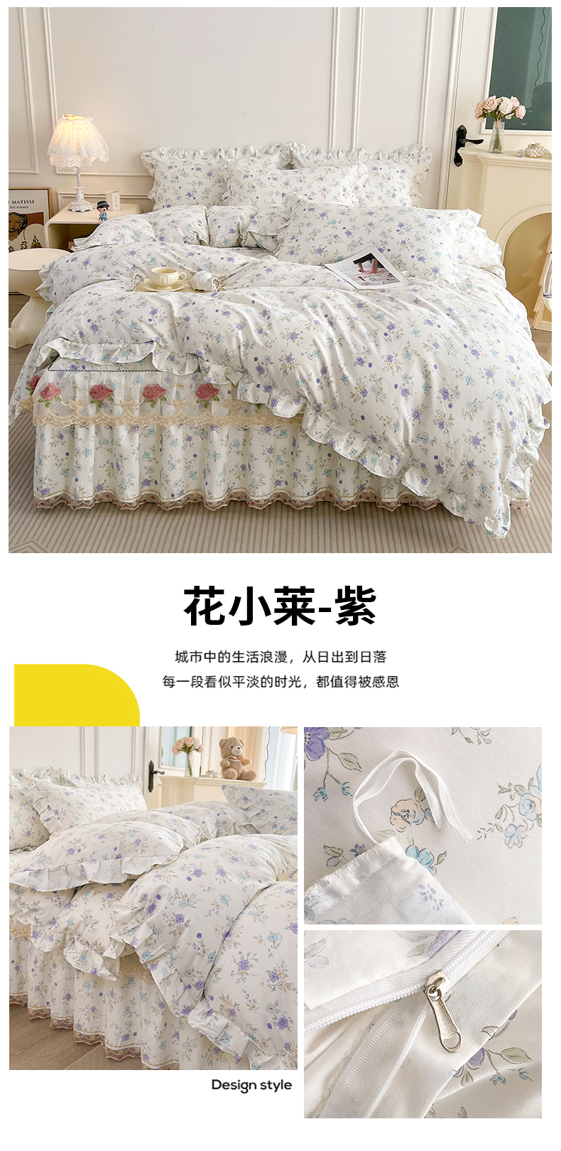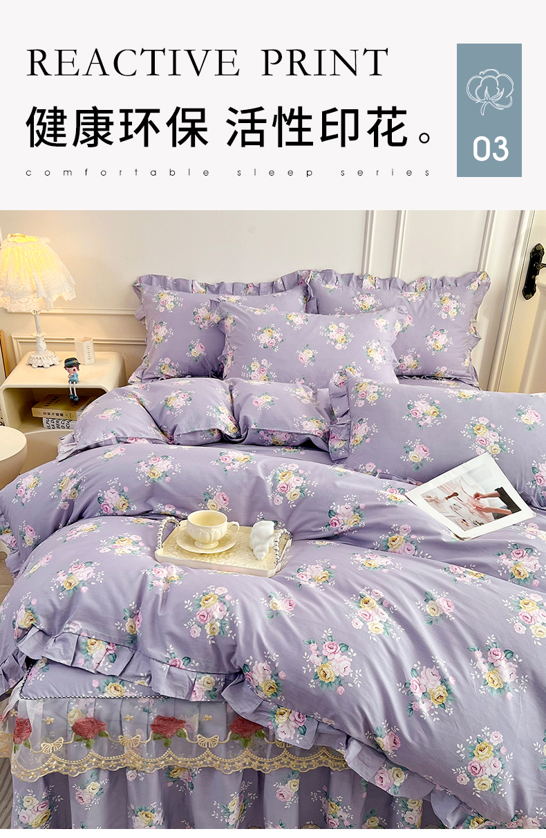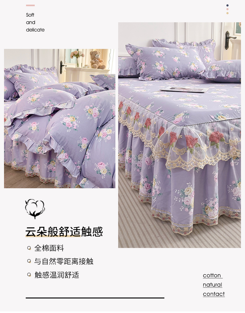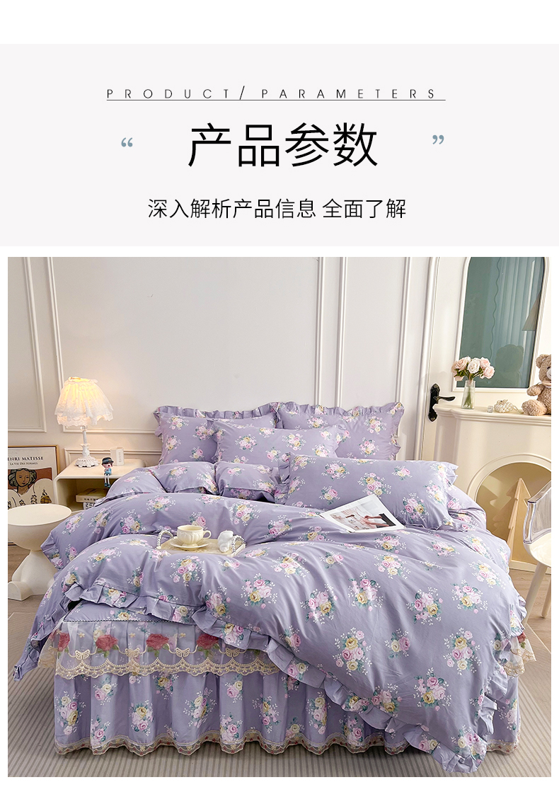 当前位置: 91家纺网 > 商品网购 > 床品套件 > 四件套 > 全棉普通四件套 > 十个点 2025新款全棉纯棉蕾丝花边床裙四件套 花小莱-紫