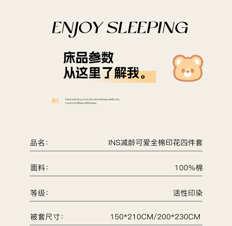 1.5/1.8米床四件套:被套200*230cm 床单230*245cm 枕套48*74cm | ¥90.00 |