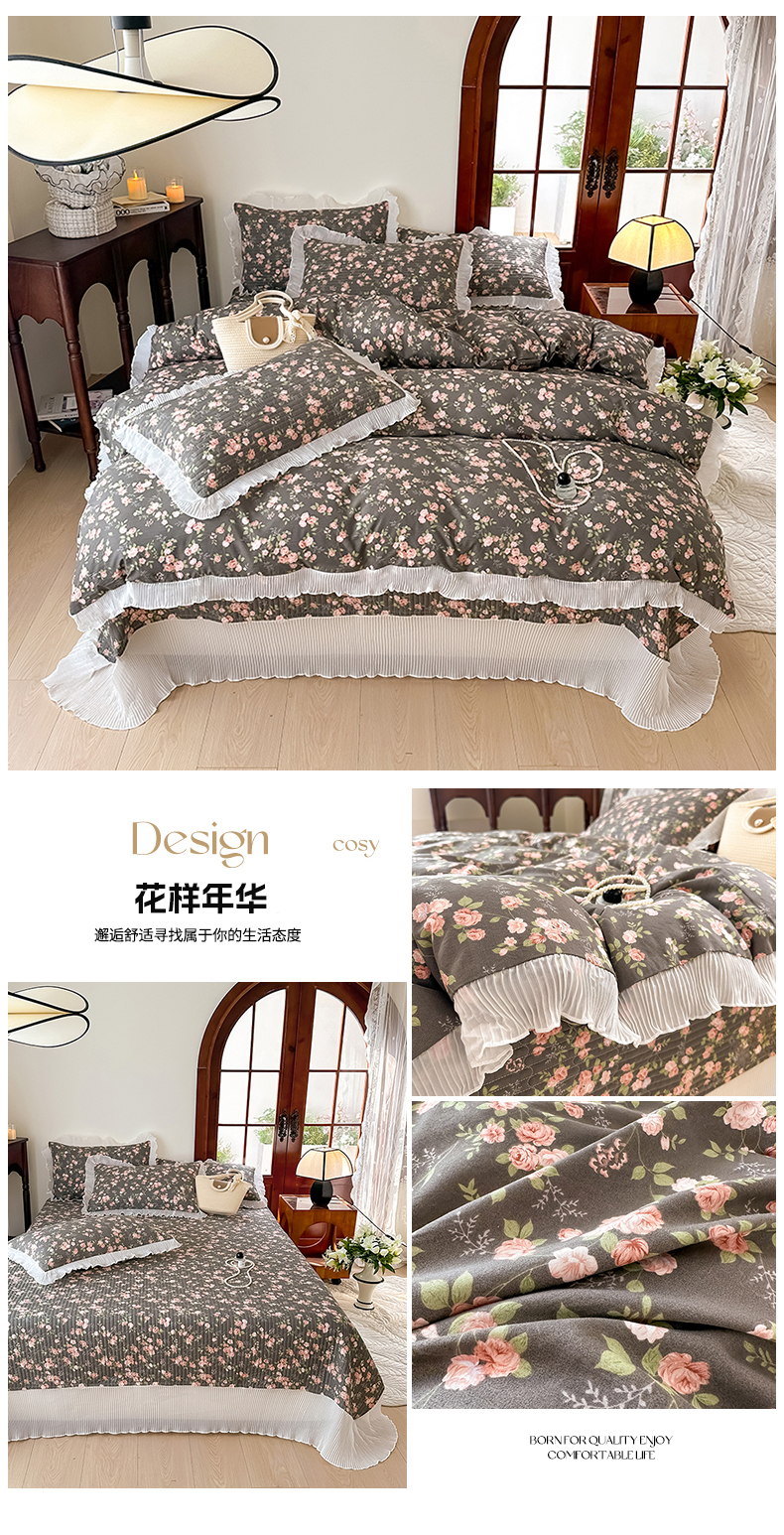 商品名称:赫本家纺 2025新款水洗棉花边款夹棉床盖三件套四件套 花样年华
