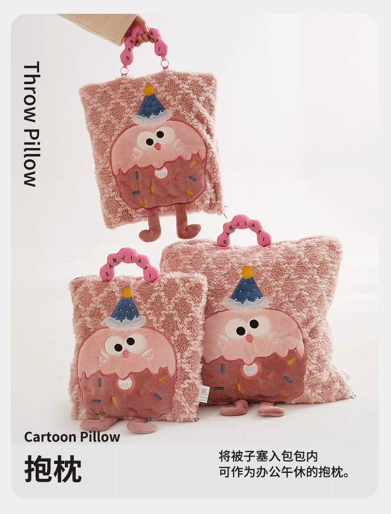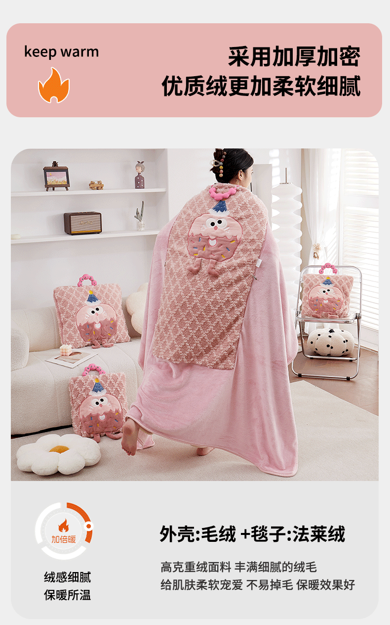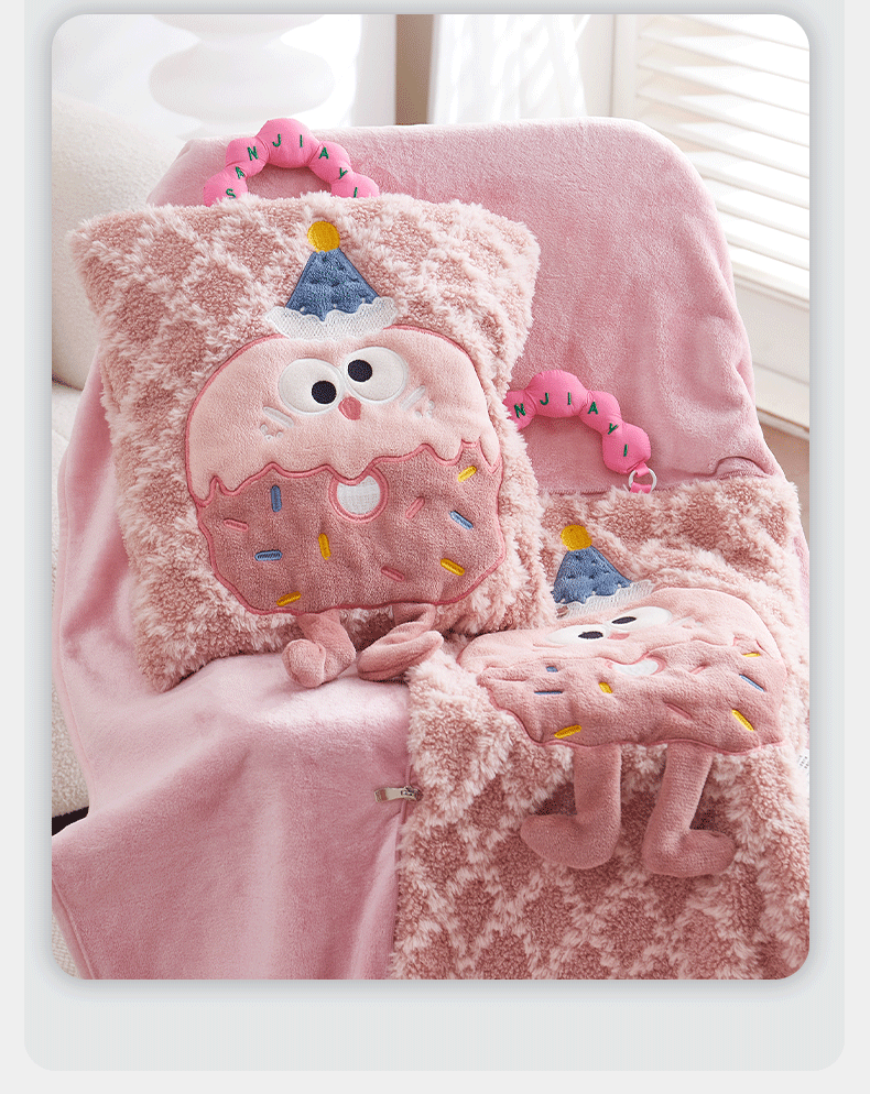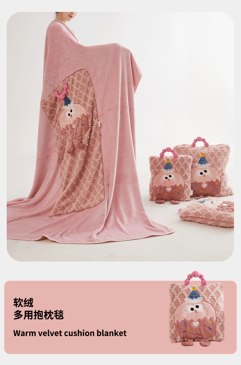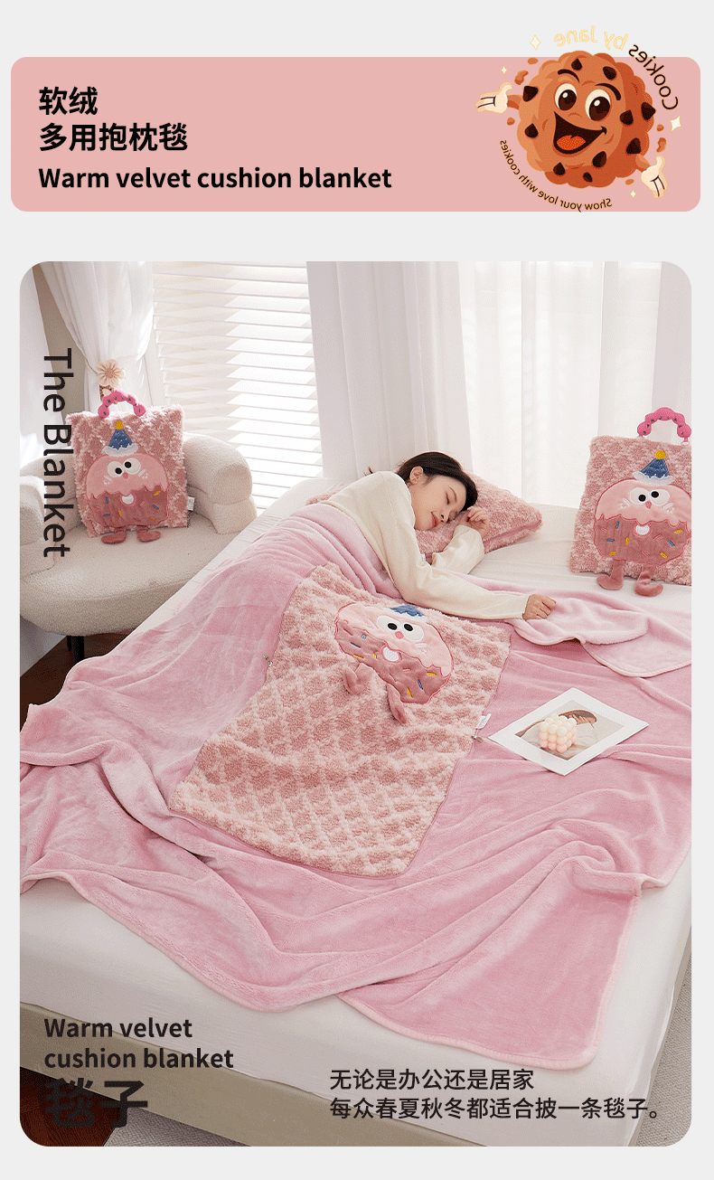 商品名称:古本家居 2025新款贴布立体卡通刺绣曲奇抱枕毯抱枕被 曲奇毛毯-嫩粉