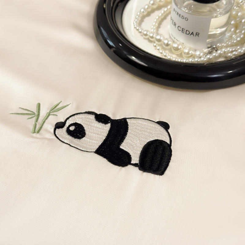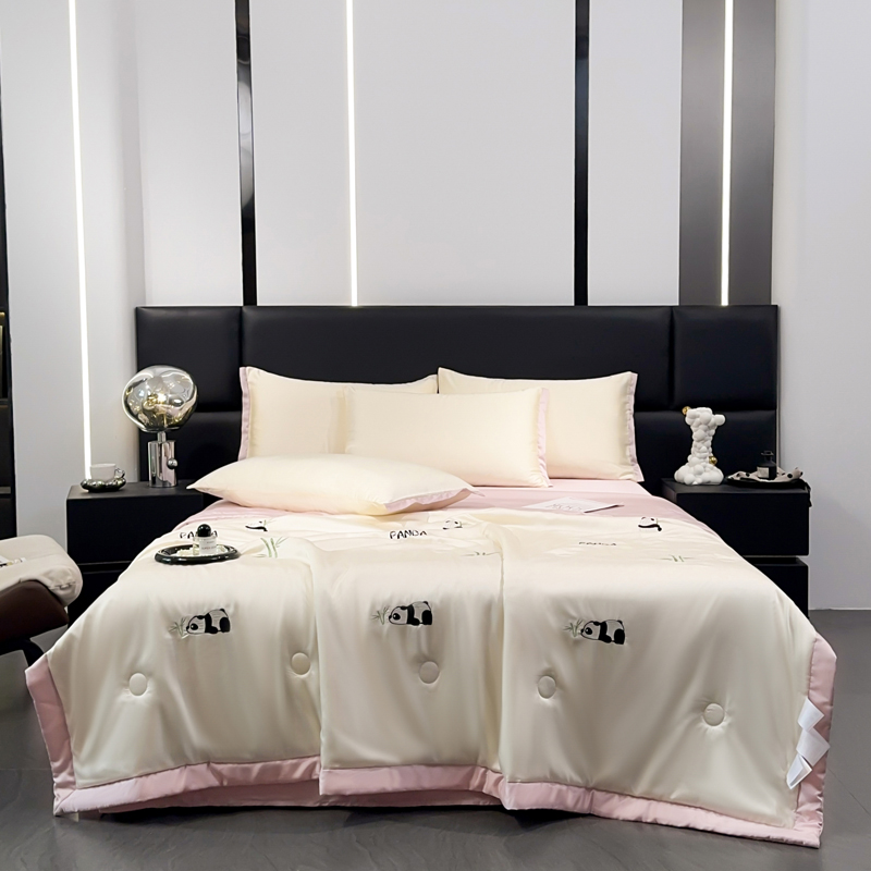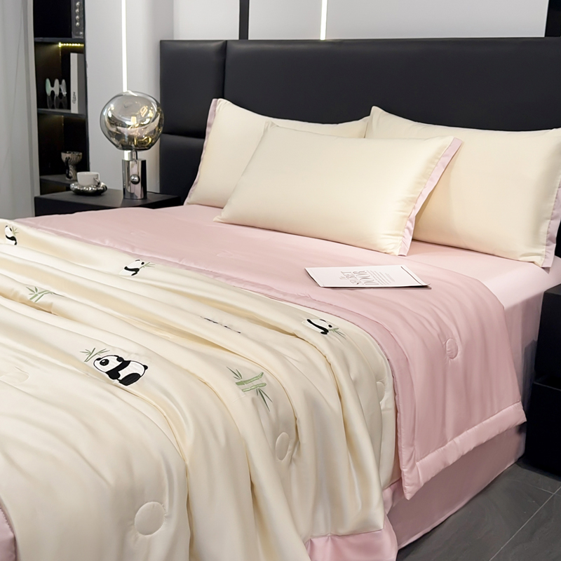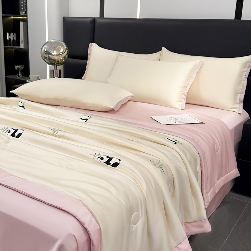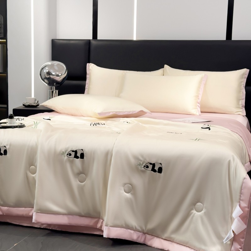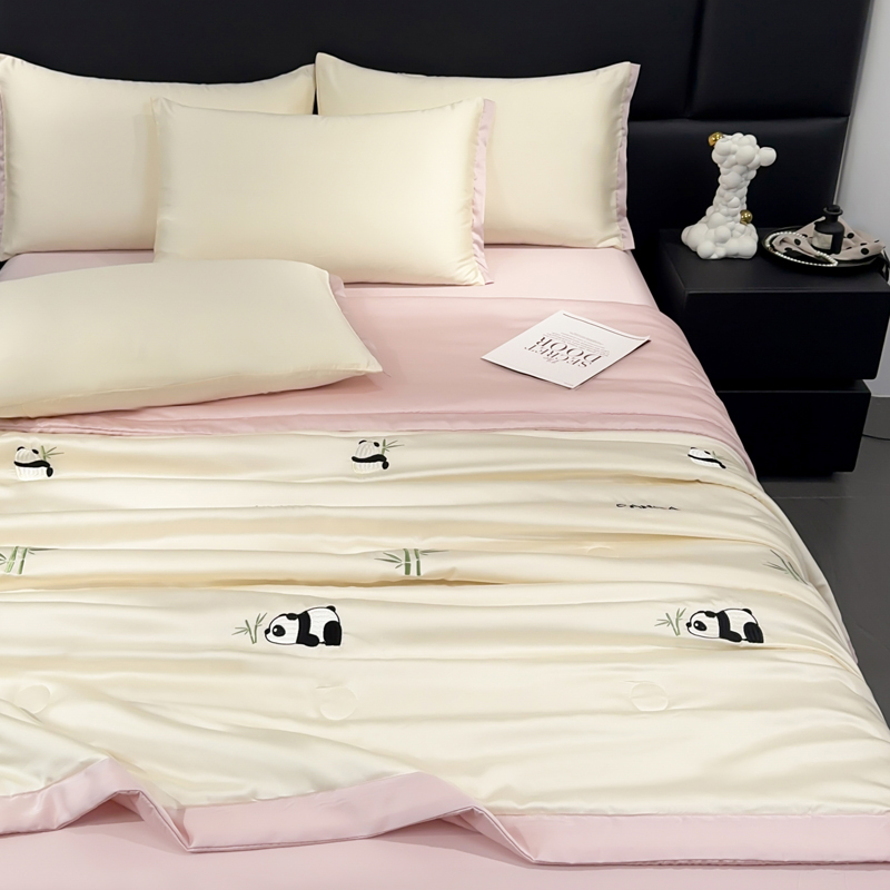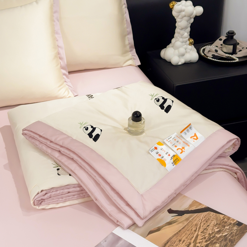 2025新款清凉舒适水洗冰丝刺绣夏被四件套 熊猫-奶白粉