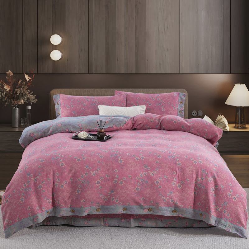 2025新款全棉色织双层纱纽扣款四件套 织梦-粉