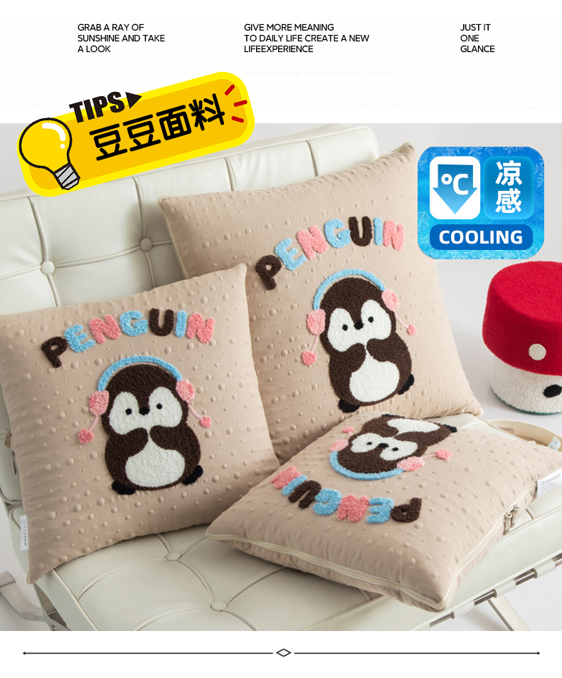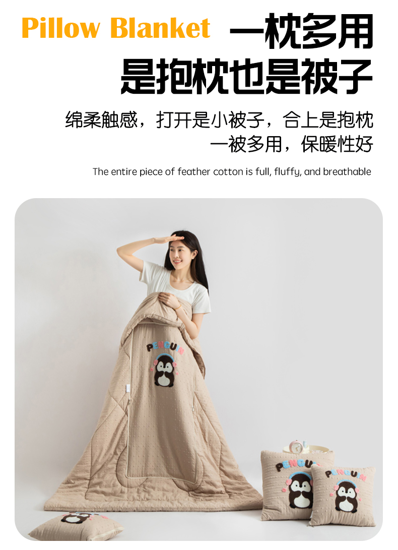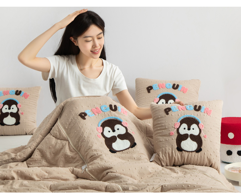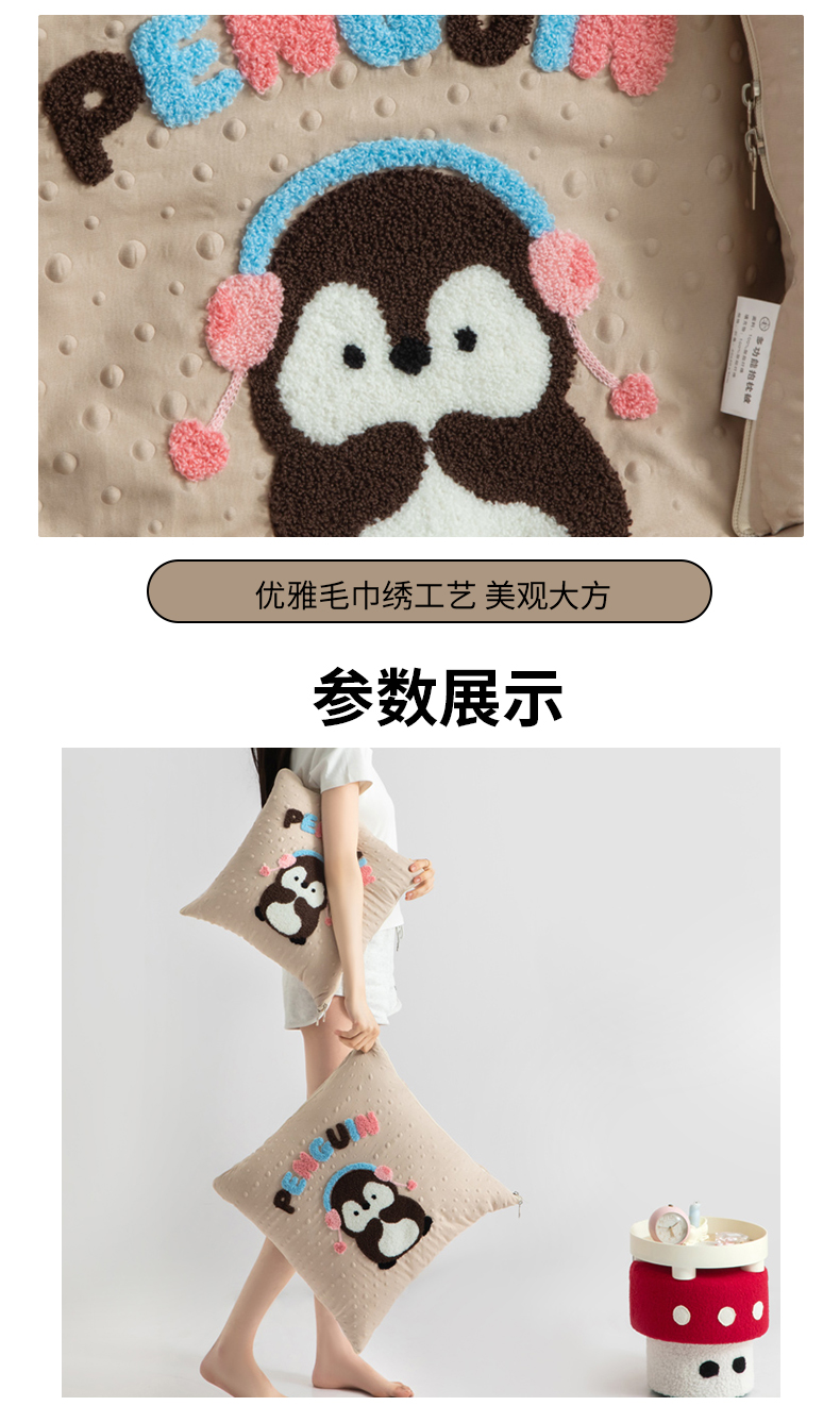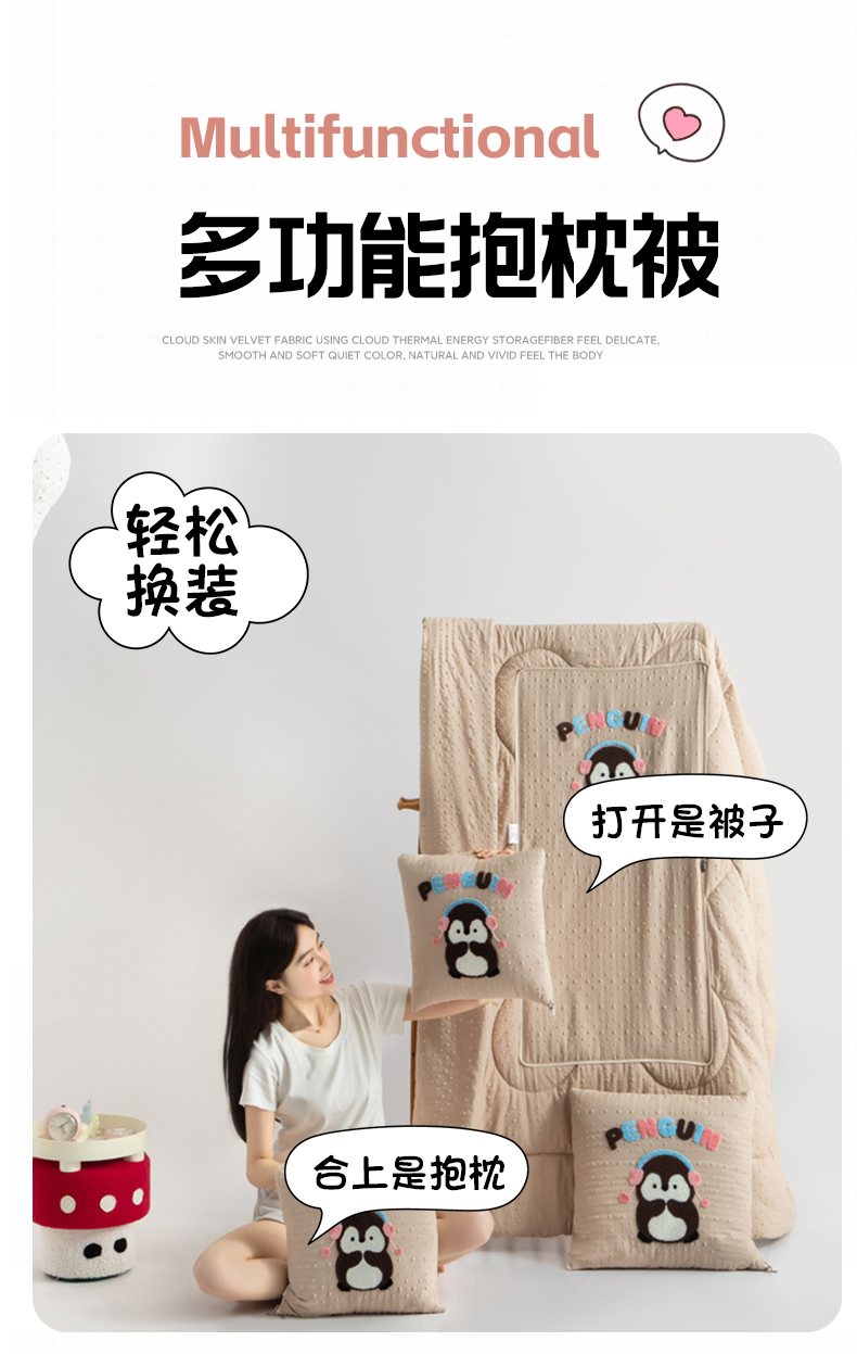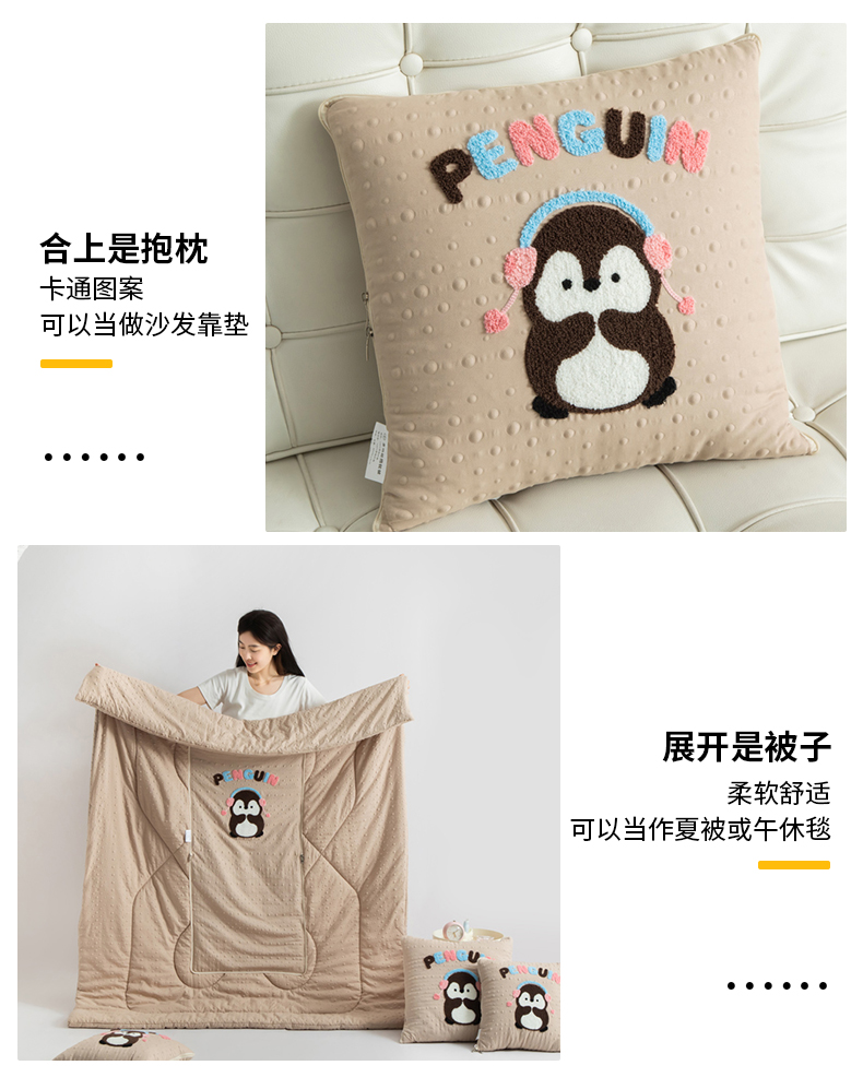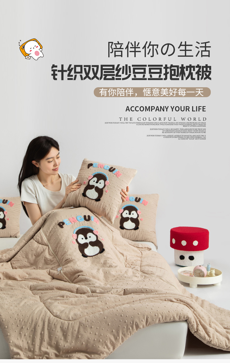 商品名称:雷娜家居 2025新款针织双层纱系列豆豆抱枕被-音乐企鹅 卡其色