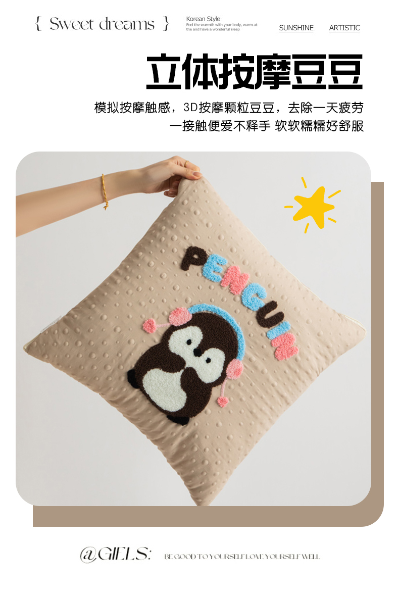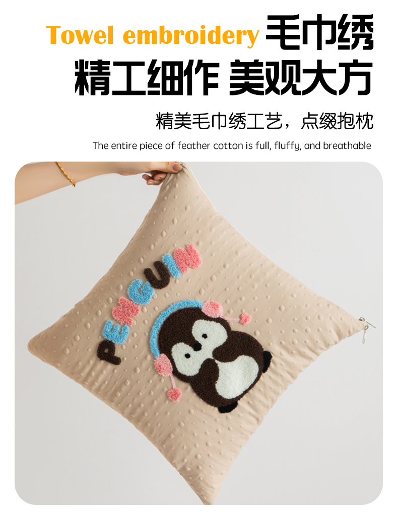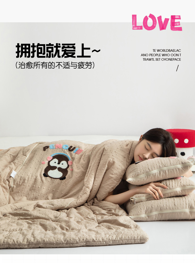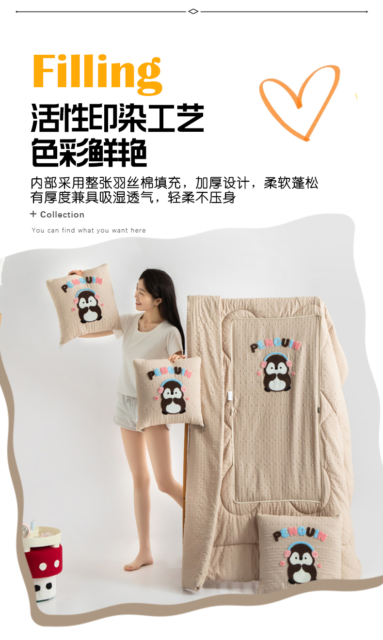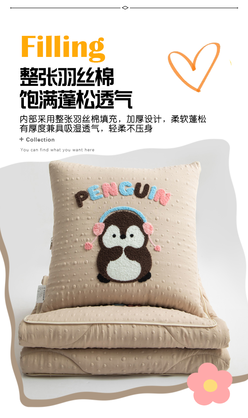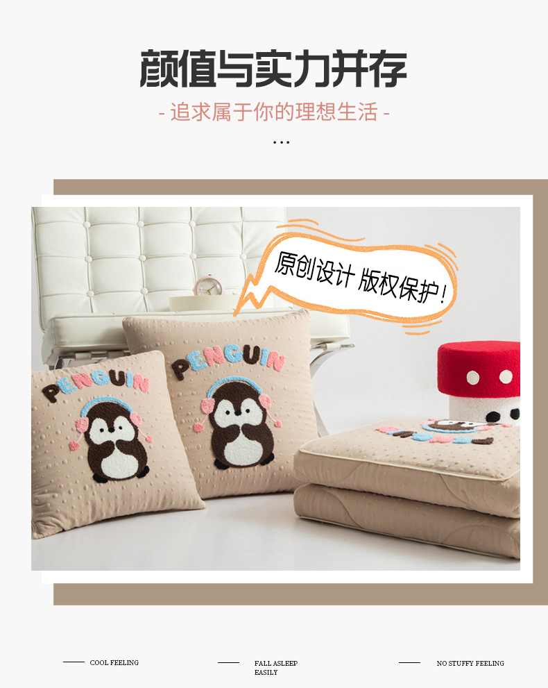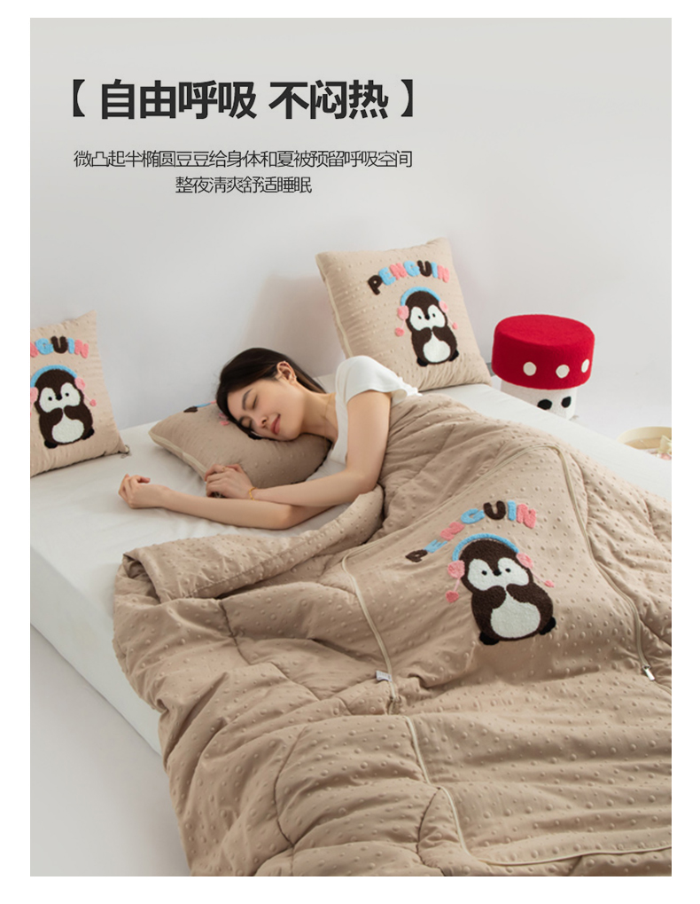 商品名称:雷娜家居 2025新款针织双层纱系列豆豆抱枕被-音乐企鹅 卡其色