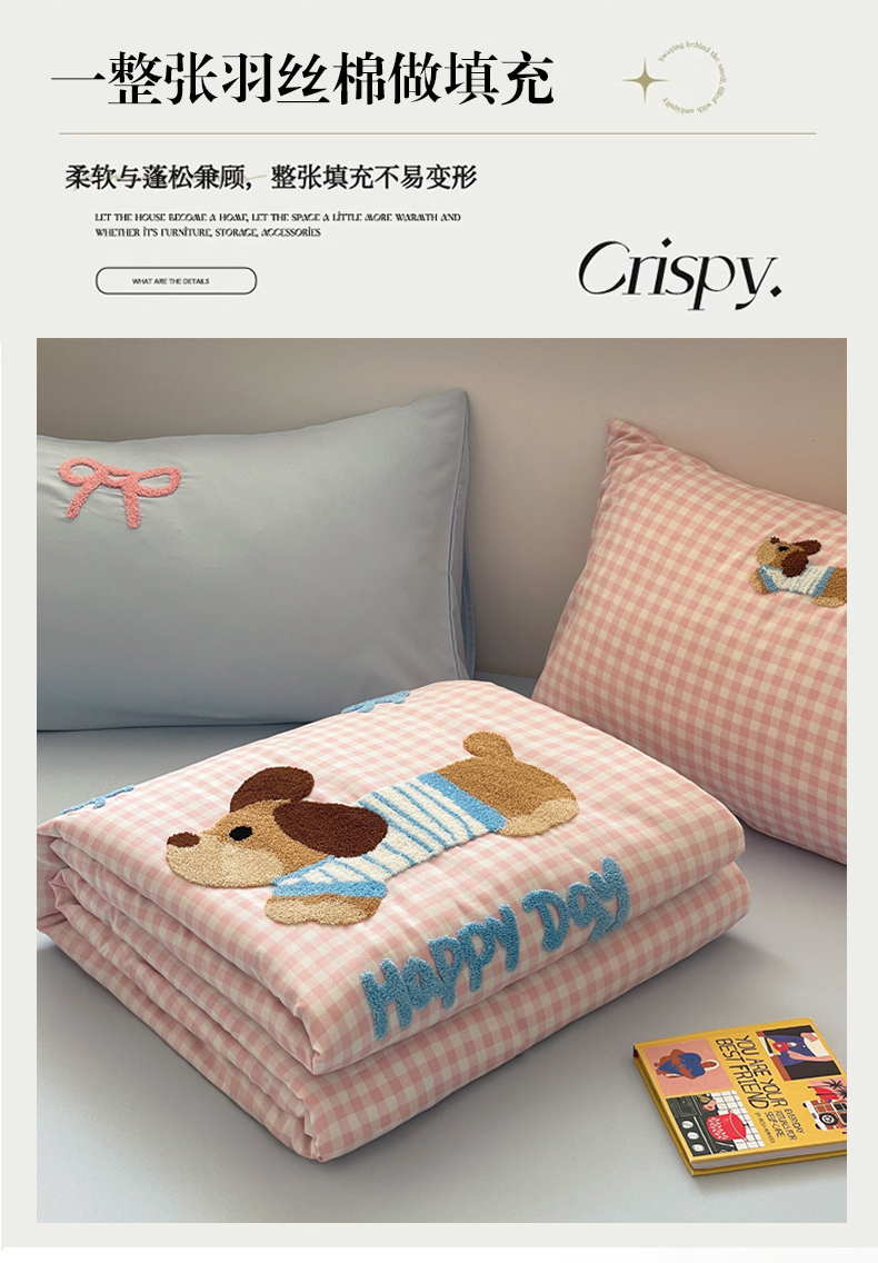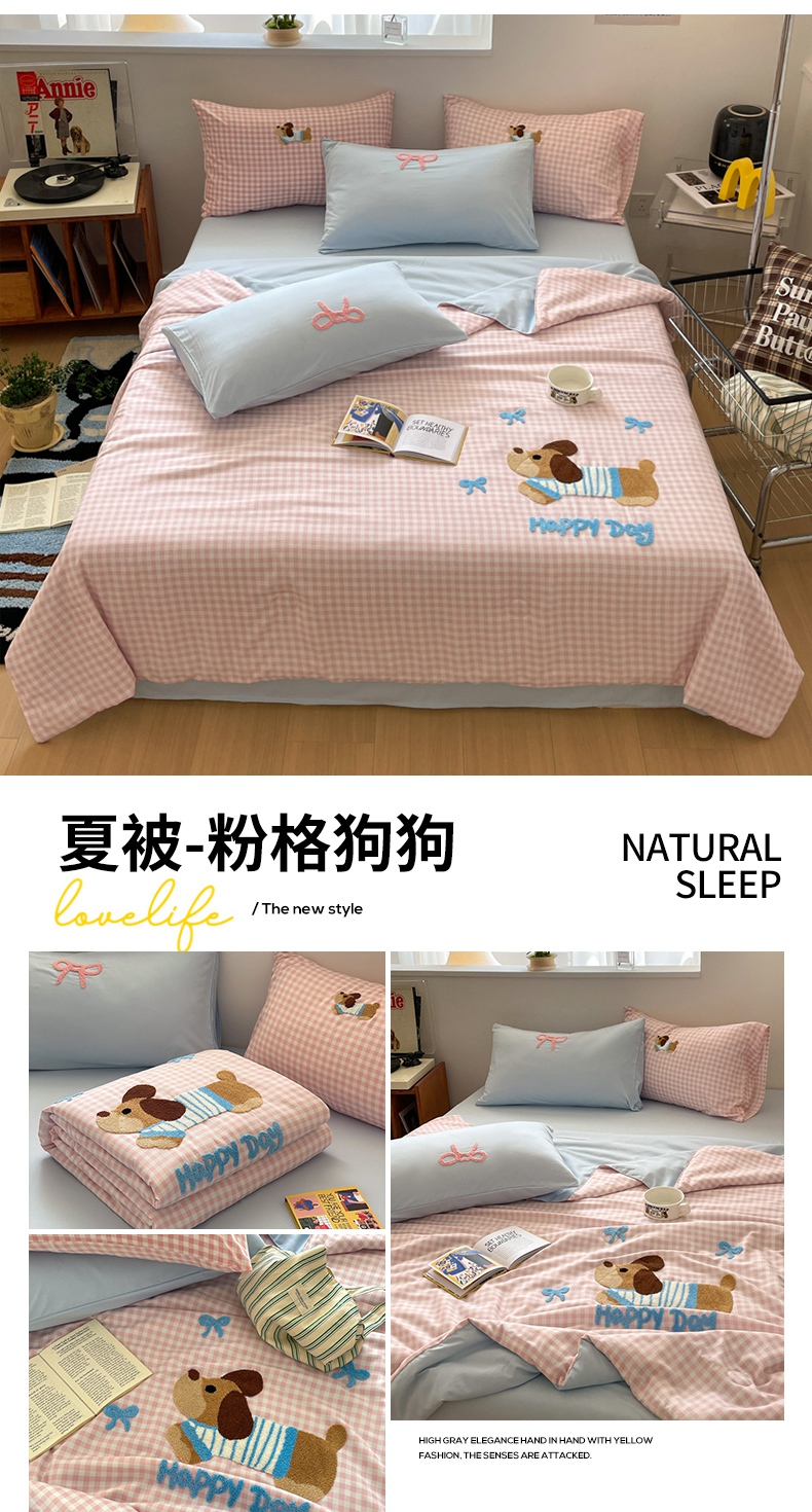 • 91家纺网 家纺一手货源 找家纺 红嘴企鹅 2025新款卡通毛巾绣空调被夏被四件套 夏被-粉格狗狗