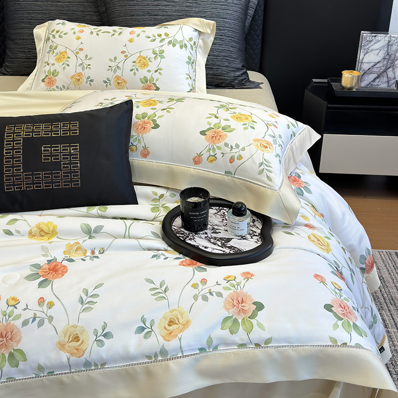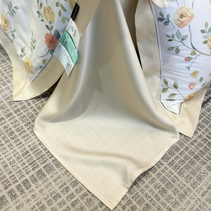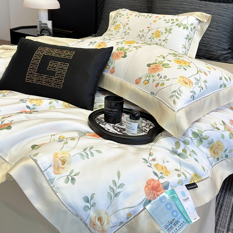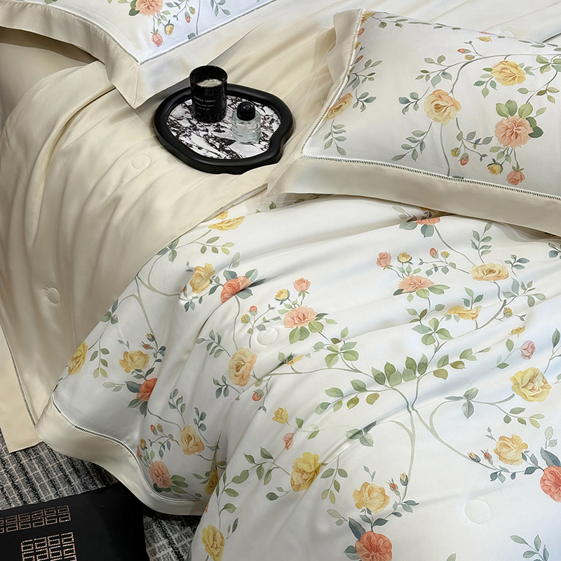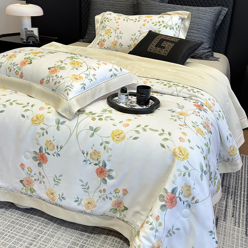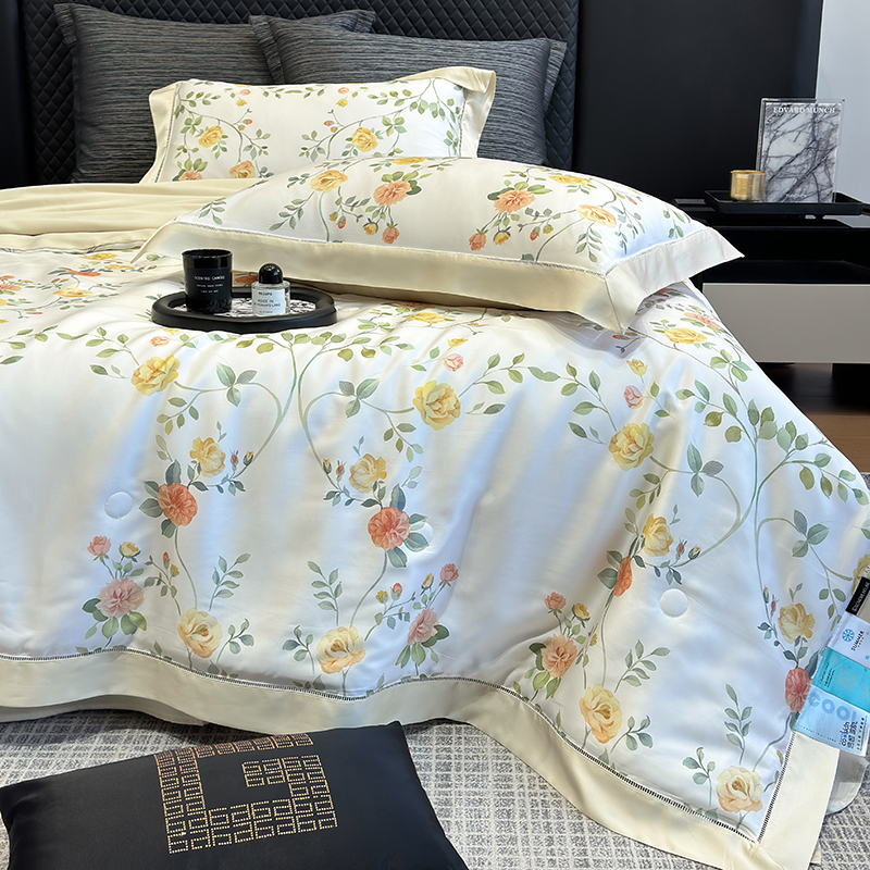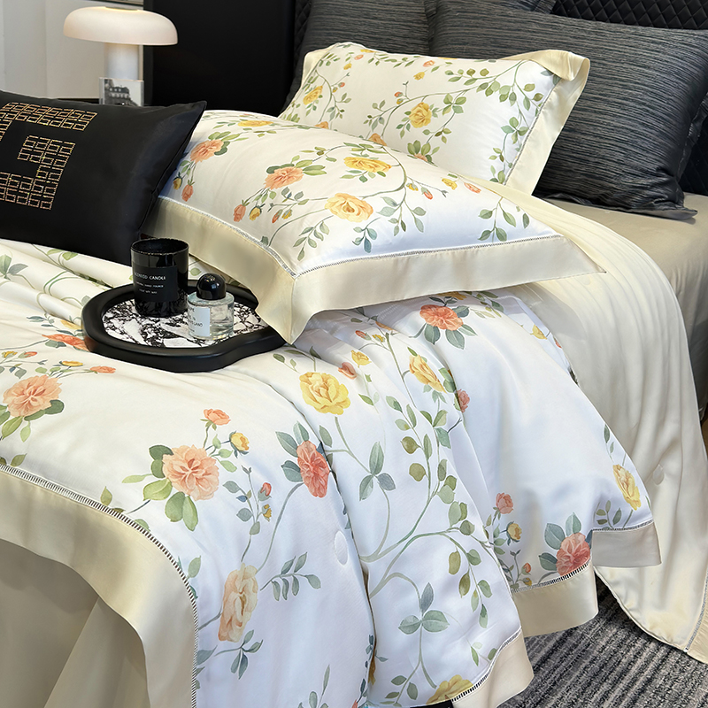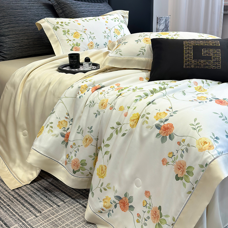 • 91家纺网 家纺一手货源 找家纺 若未家居 LOVEWE HOUSE 2025新款兰精天丝印花夏被及夏被四件套 奶酪玫瑰(床单款+床盖款)