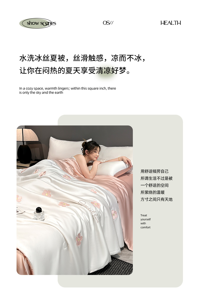 当前位置: 91家纺网 > 商品网购 > 被子 > 普通夏被 > 满羽家纺 2025新款凉感水洗冰丝夏被夏凉被被子被芯夏被四件套 五瓣花-奶白蓝