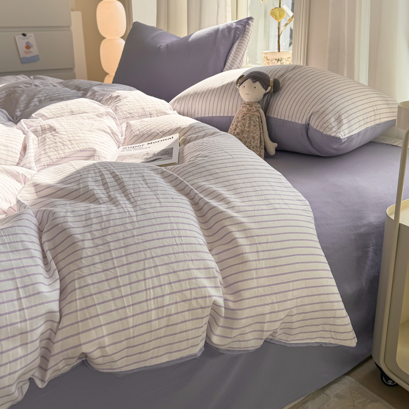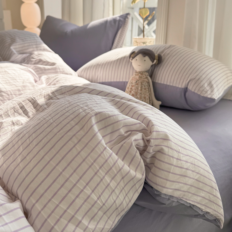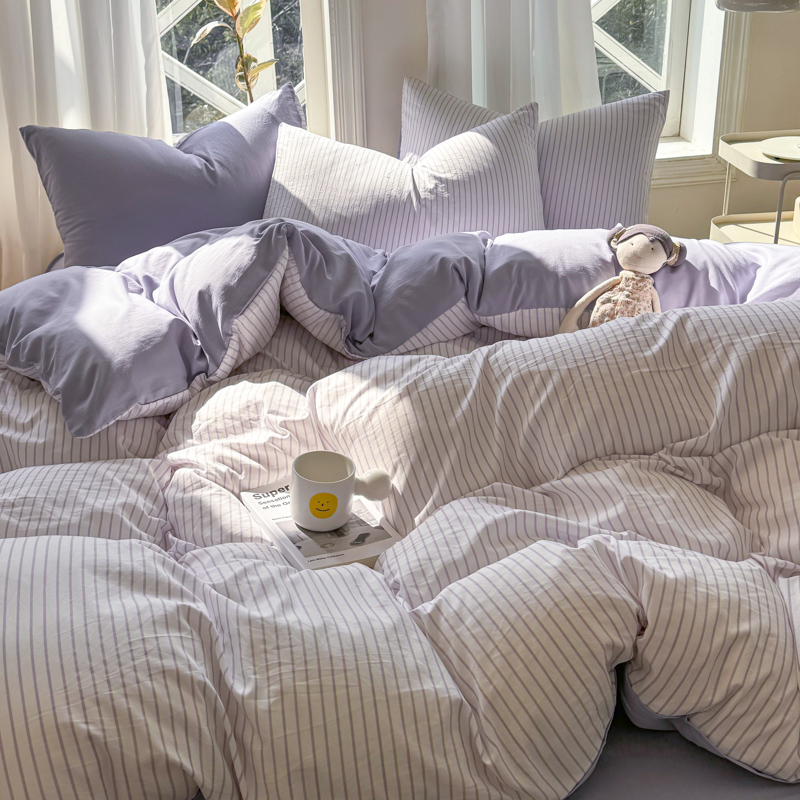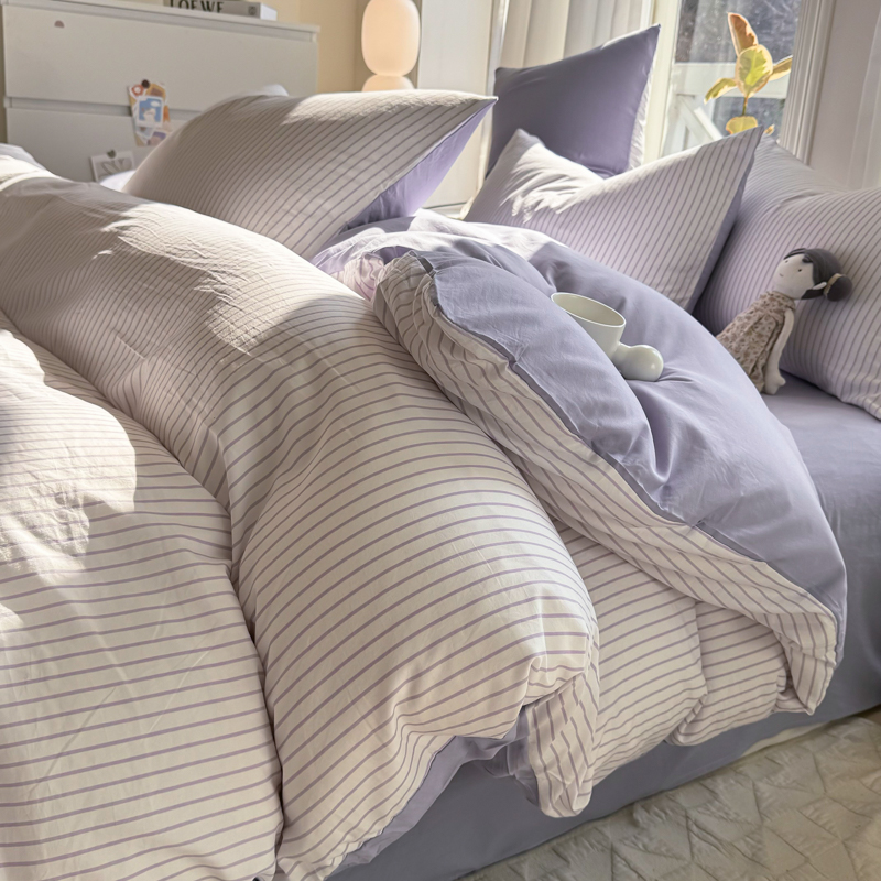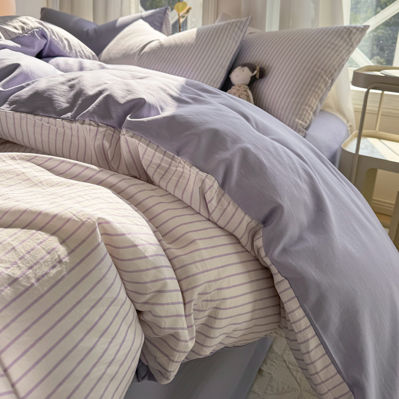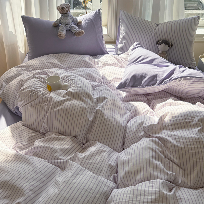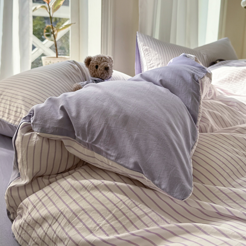 商品名称:缦绣阁家纺 2025新款无印风条纹水洗磨毛四件套简约风4件套学生宿舍三件套 良品条纹紫
