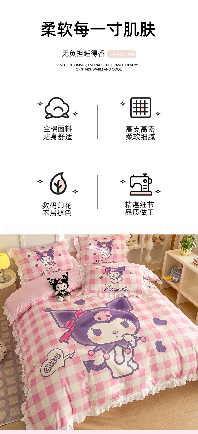 当前位置: 91家纺网 > 商品网购 > 床品套件 > 四件套 > 全棉普通四件套 > 玉元坊 2025新款三丽鸥白花边被套数码印花大版全棉纯棉卡通三四件套 大版花边-格子库洛米