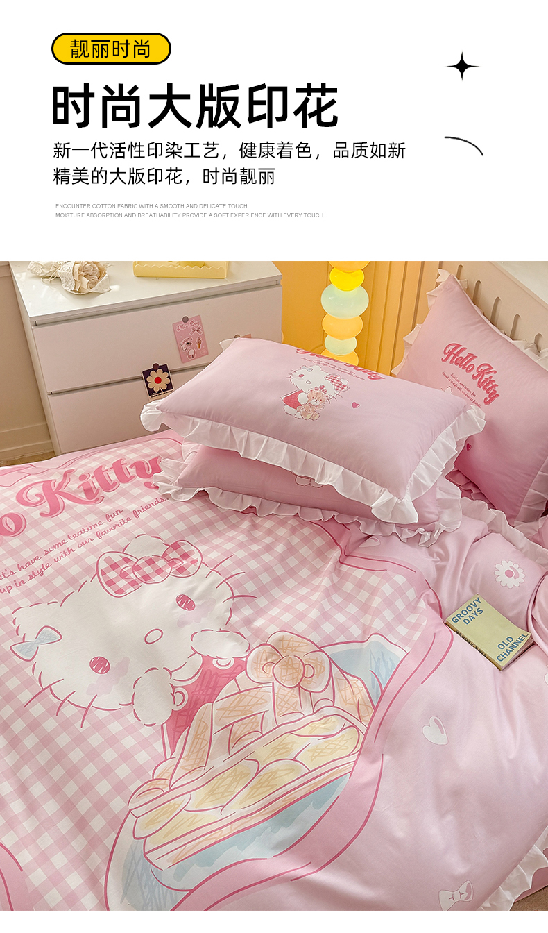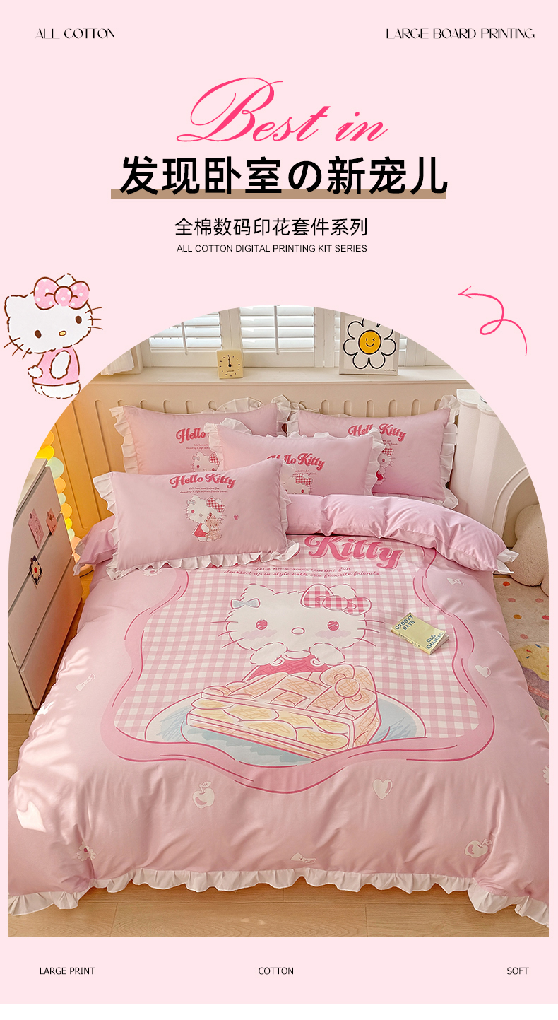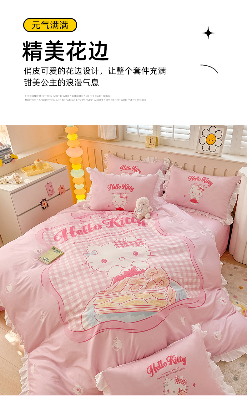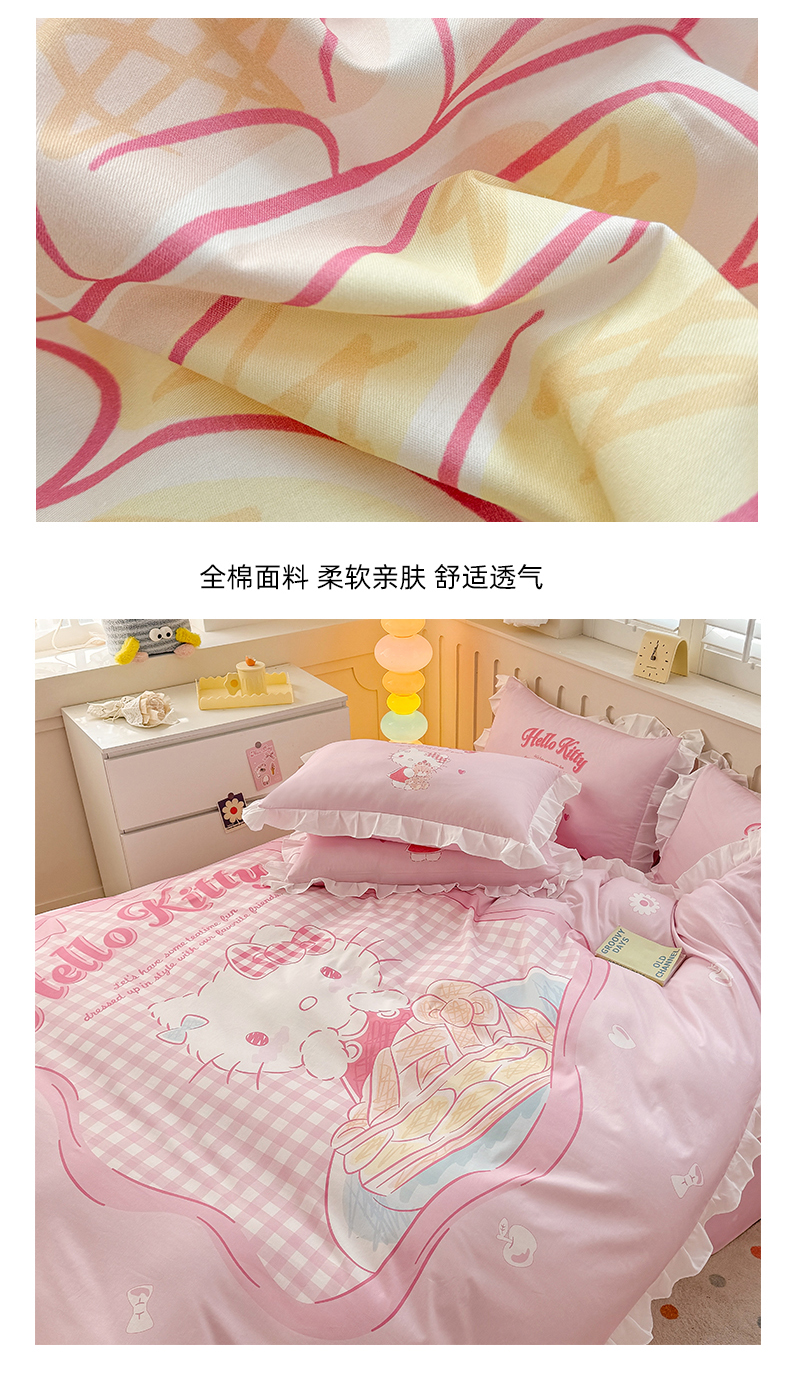 当前位置: 91家纺网 > 商品网购 > 床品套件 > 四件套 > 全棉普通四件套 > 玉元坊 2025新款三丽鸥白花边被套数码印花大版全棉纯棉卡通三四件套 花边款-心动凯蒂