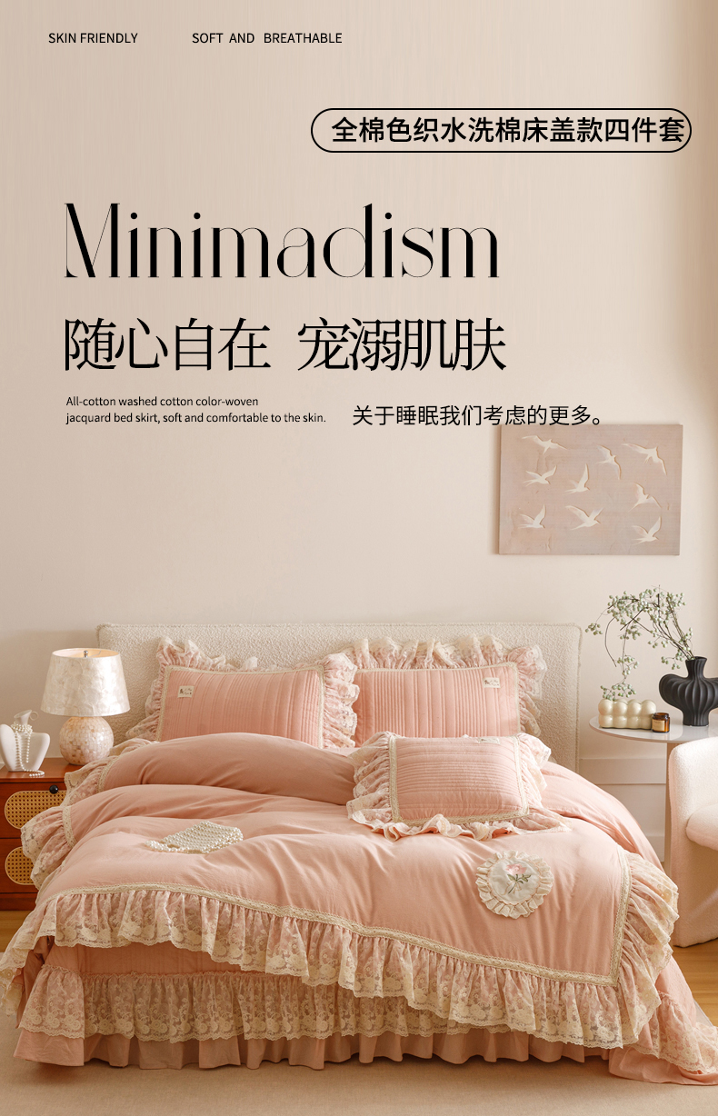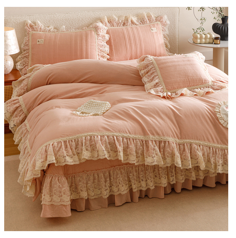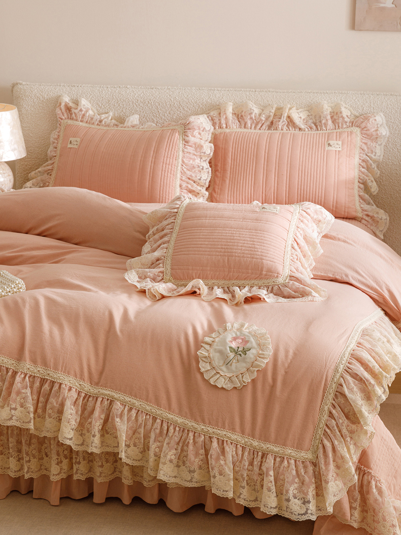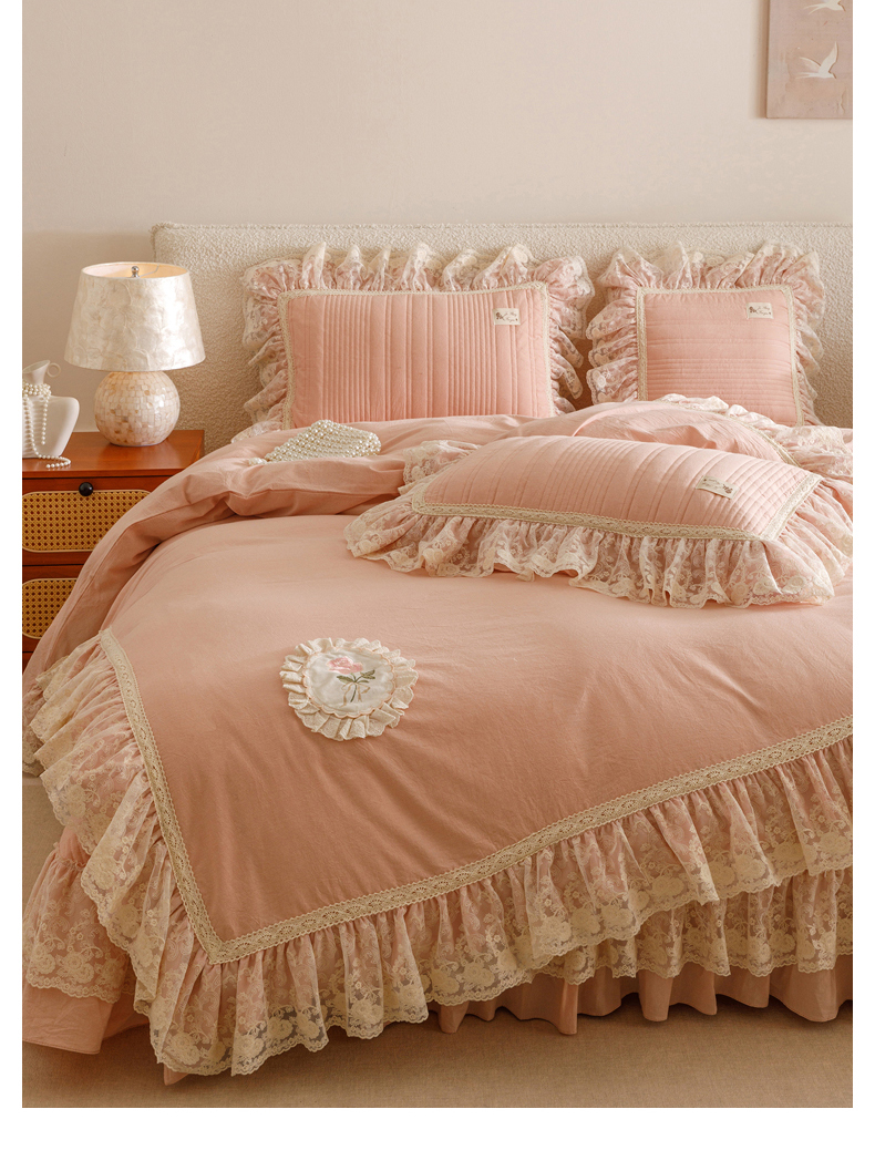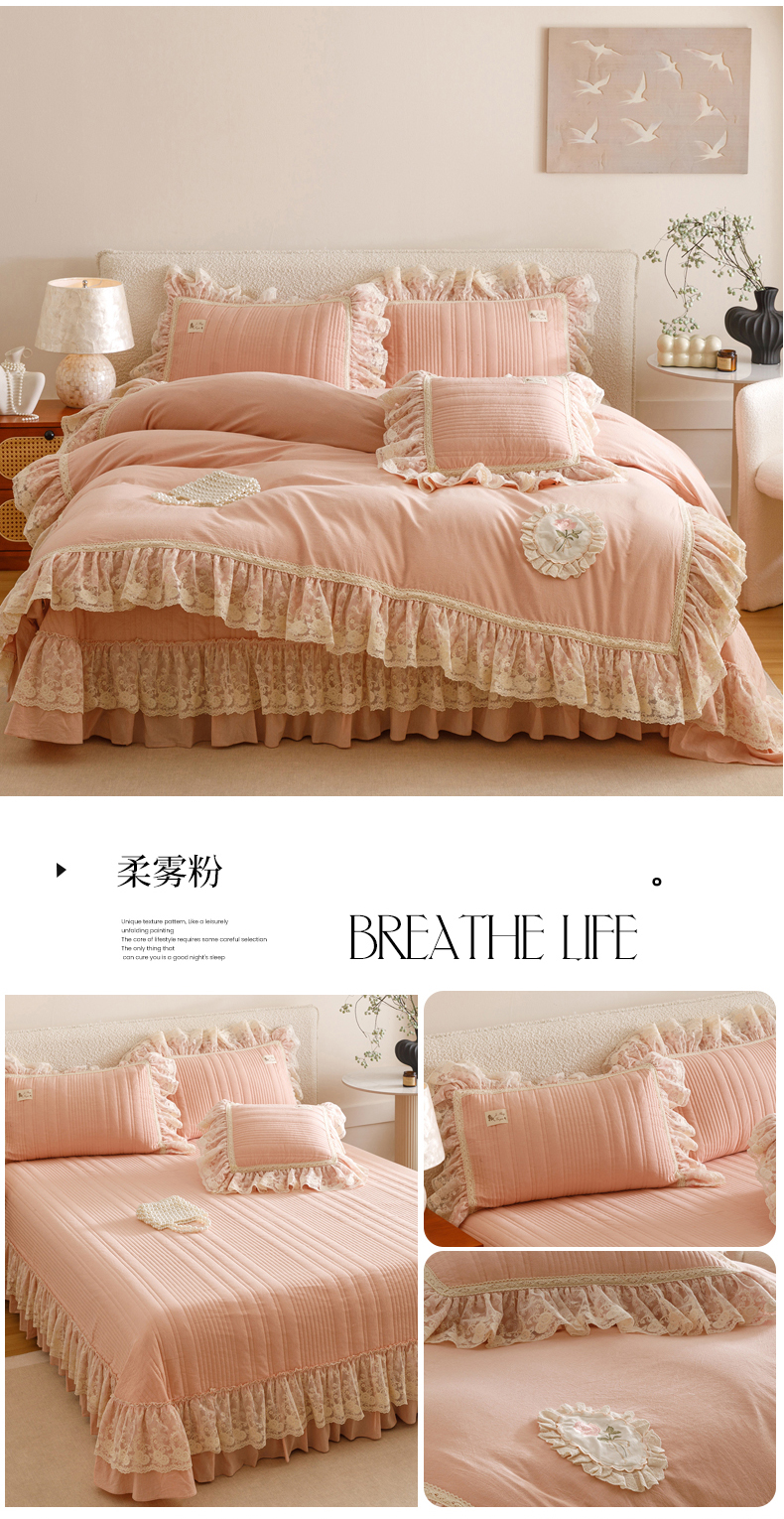 当前位置: 91家纺网 > 商品网购 > 床品套件 > 四件套 > 全棉普通四件套 > 菊上家纺 2025新款全棉色织水洗棉洛丽塔公主床盖款四件套 柔雾粉