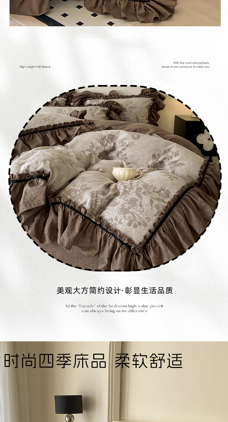 (总)大麦家纺 2025新款高克重牛奶绒花边床盖四件套,玫瑰故事,豹纹,复古樱桃,蝴蝶结紫色,玫瑰之约,美拉德猫,织梦空间