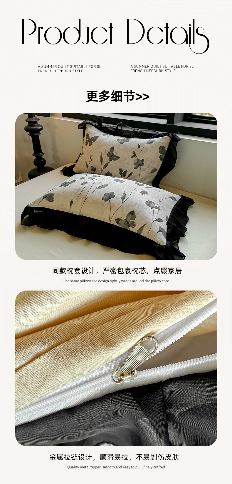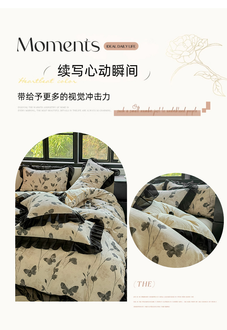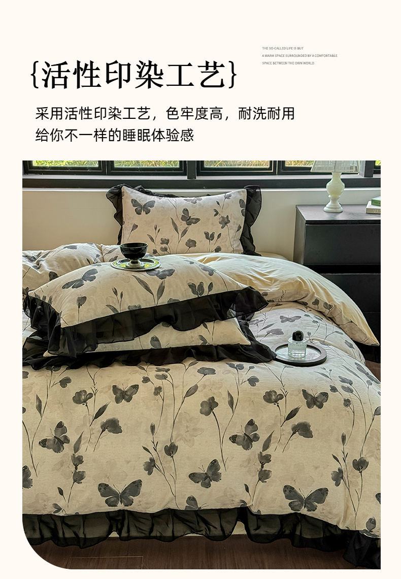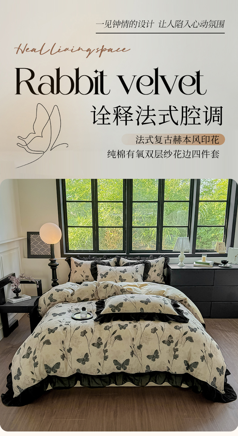 商品名称:(总)宅家居 2025新款A类轻法式复古赫本风全棉纯棉有氧双层纱花边四件套黑色韩式花边三件套