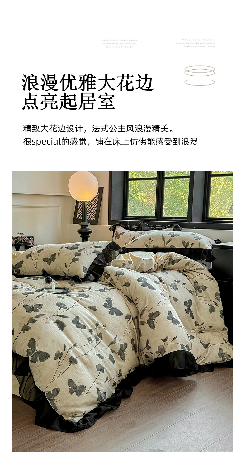 (总)宅家居 2025新款A类轻法式复古赫本风全棉纯棉有氧双层纱花边四件套黑色韩式花边三件套