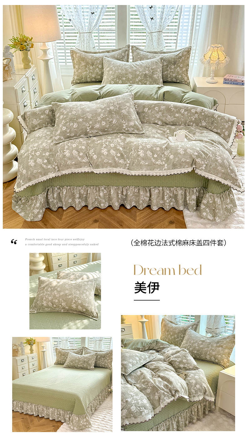 韩约家纺 2025新款全棉纯棉镂空双色刺绣花边法式床盖款棉麻四件套 波波绿