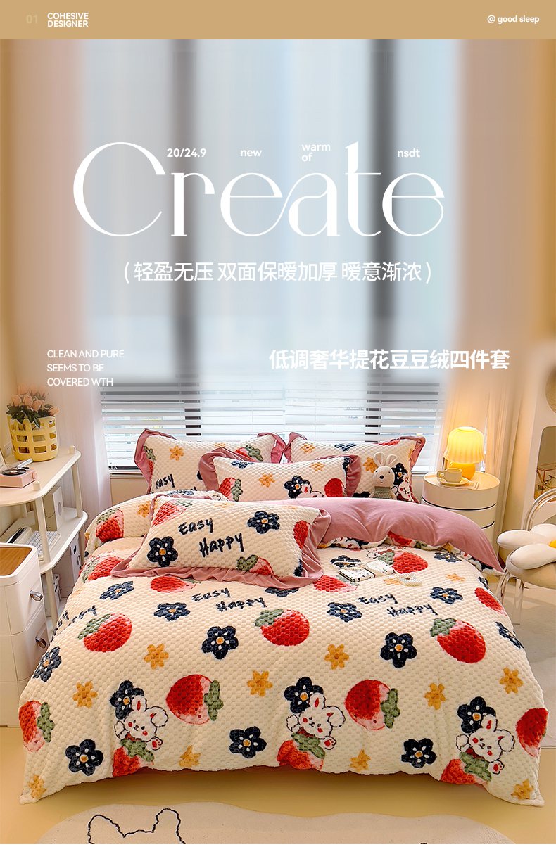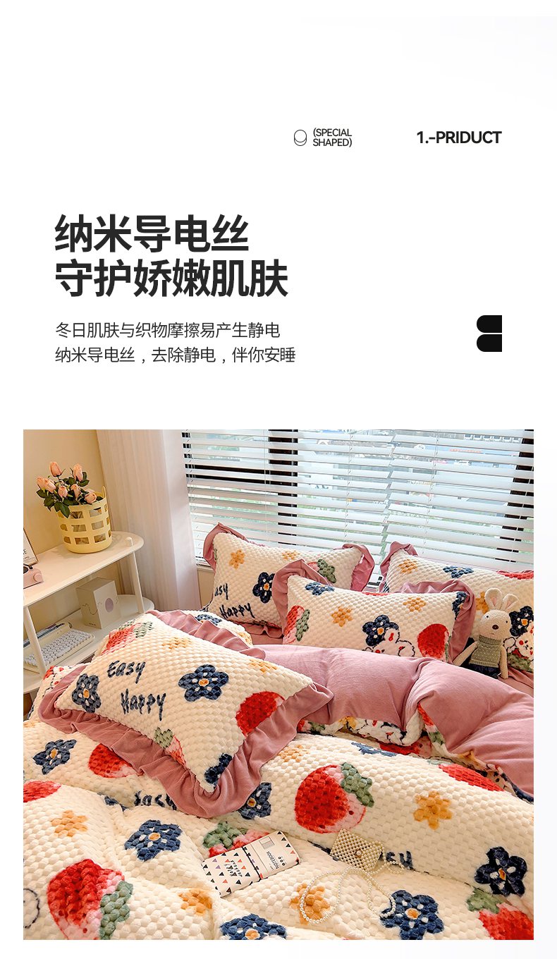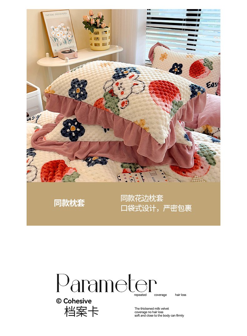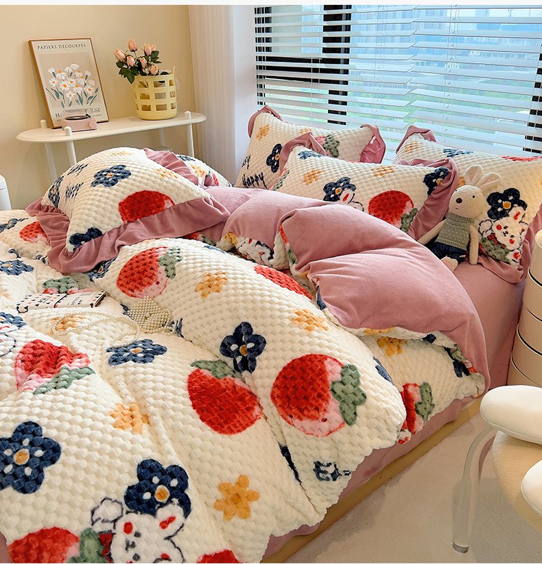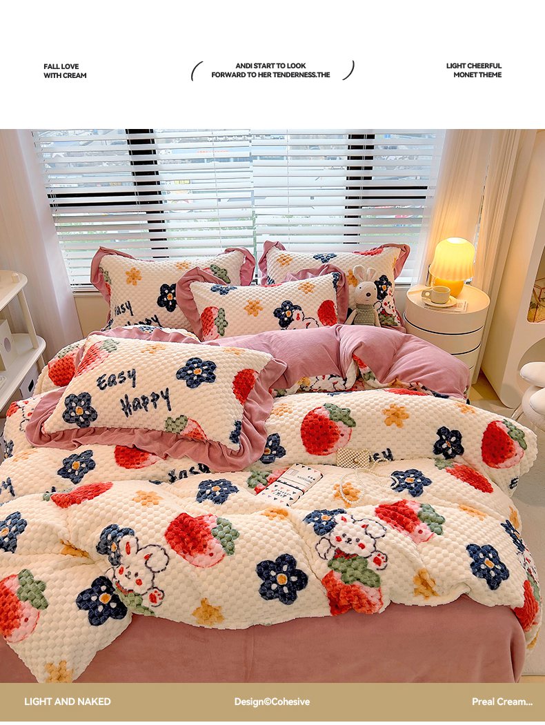 商品名称:摩妮卡 2025新款提花豆豆绒卡通印花牛奶绒四件套 草莓兔