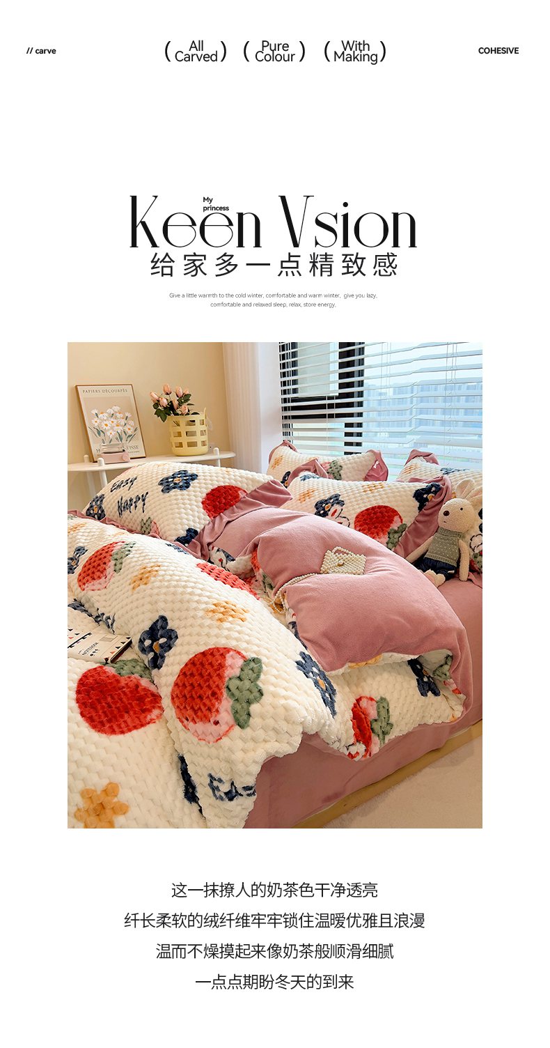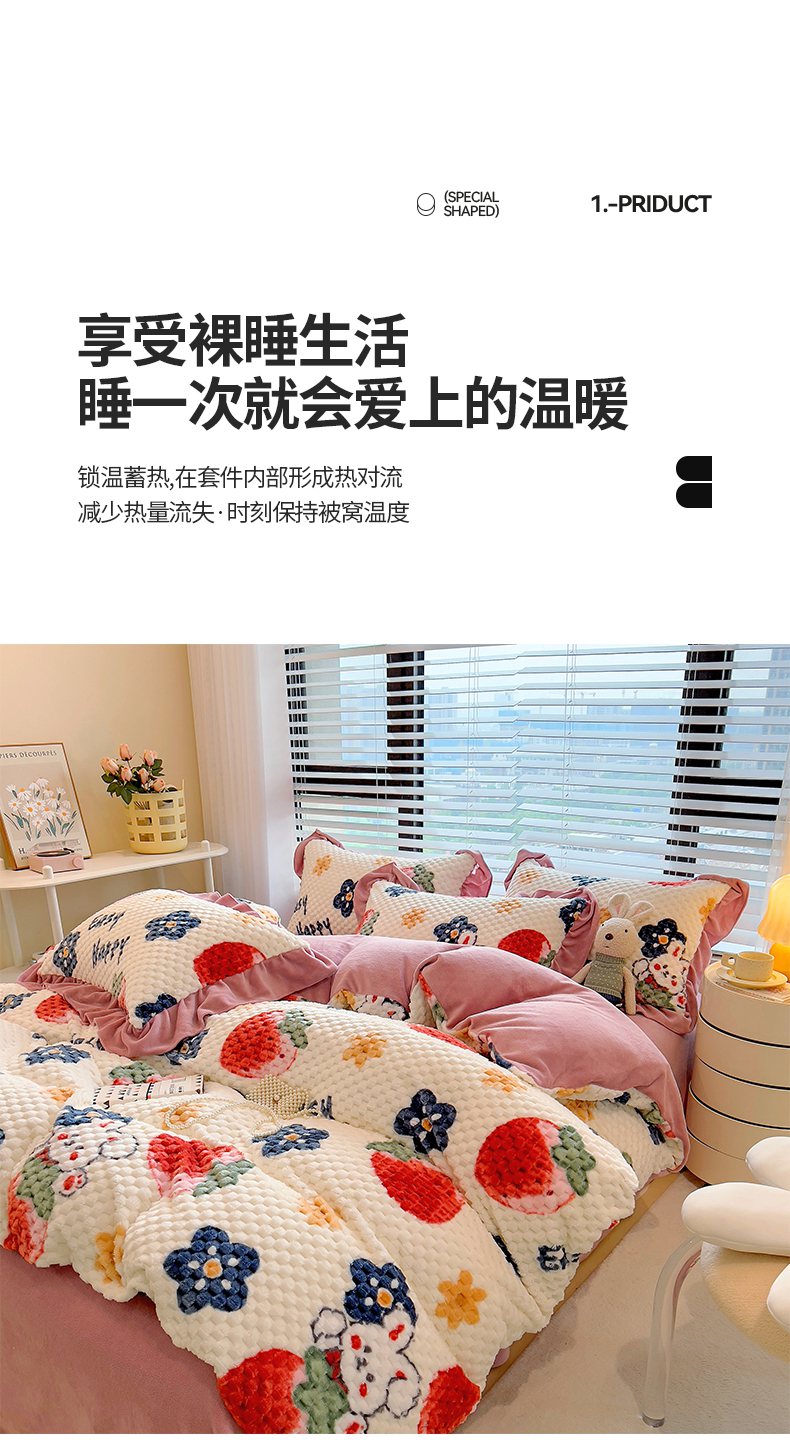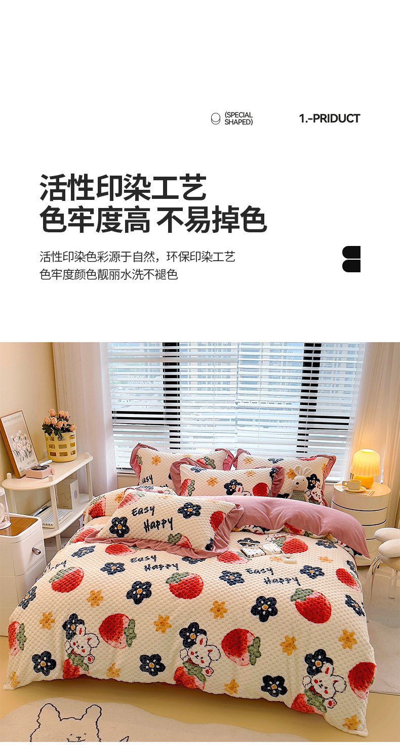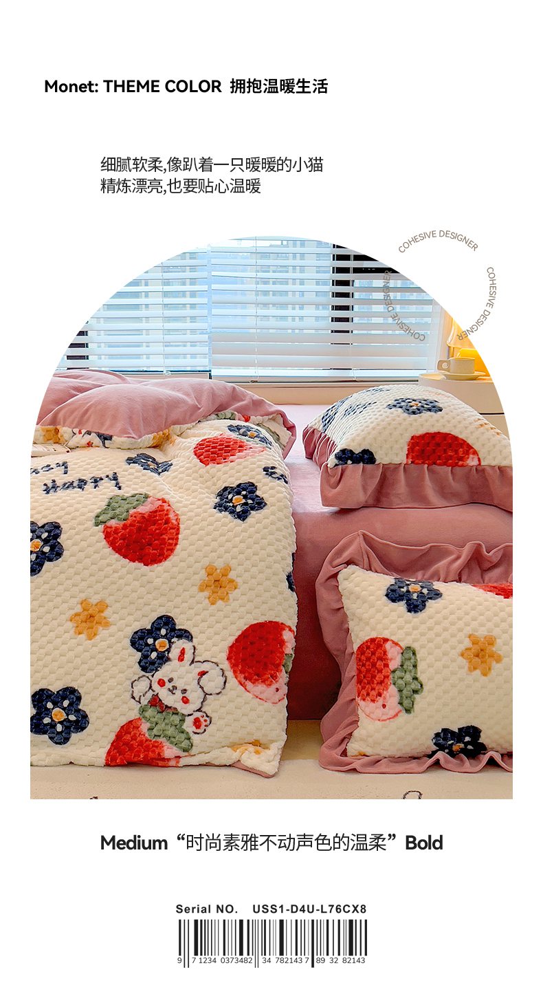 商品名称:摩妮卡 2025新款提花豆豆绒卡通印花牛奶绒四件套 草莓兔