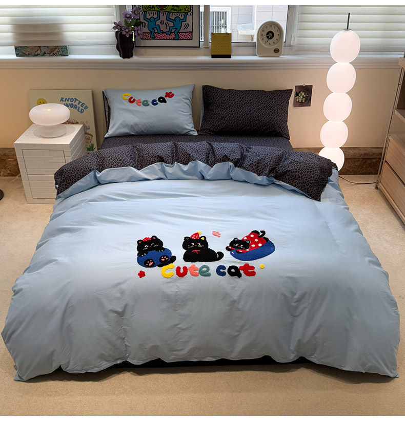 (总)2025新款全棉印花加绣花四件套,斑点狗,举手兔-咖,举手兔-蓝,快乐黑猫,猫小乐,小旺仔,熊小萌