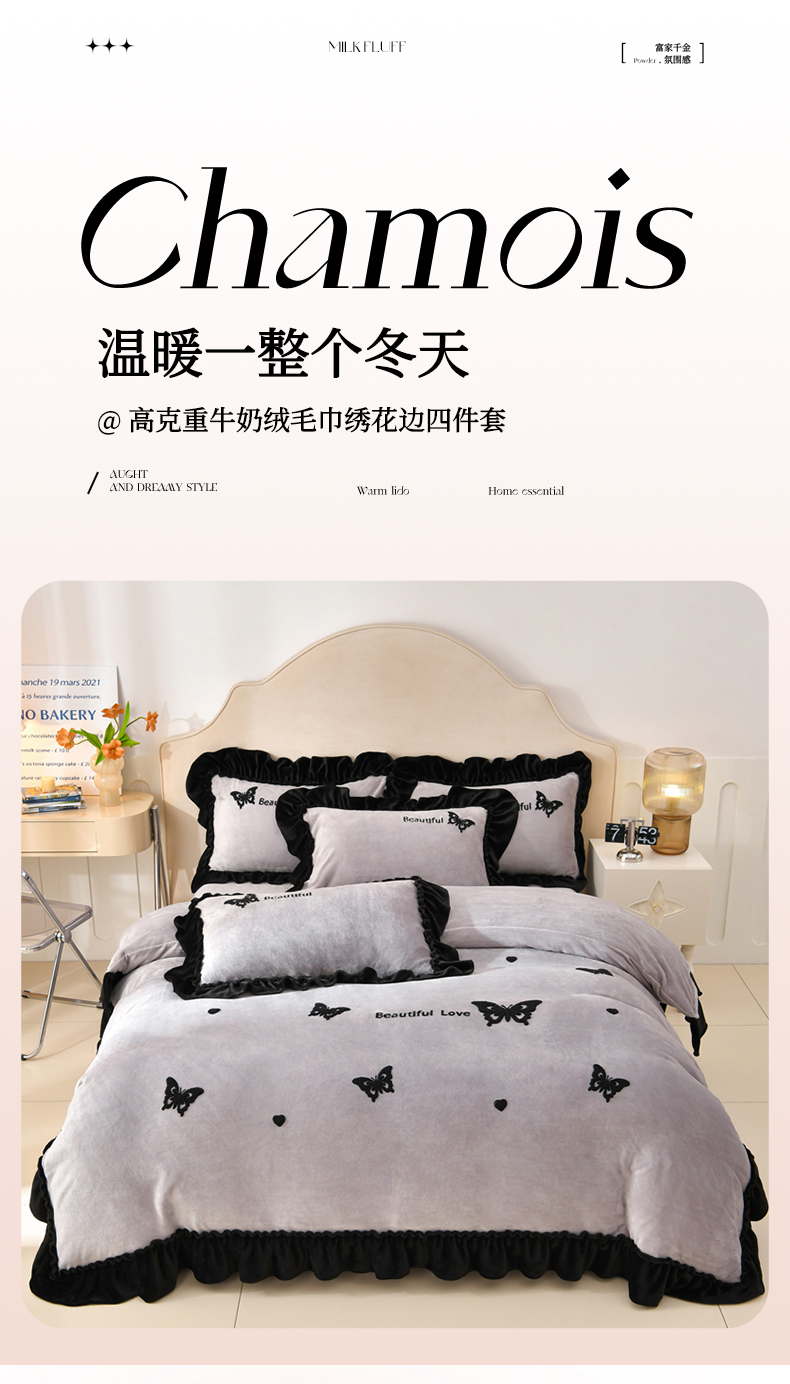 (总)梦之星 2025新款雕花绒赫本风牛奶绒花边四件套 加厚8.5斤,花边蝴蝶-粉,花边蝴蝶-灰,花边蝴蝶-棕,花边玫瑰-粉,花边玫瑰-灰,花边玫瑰-绿