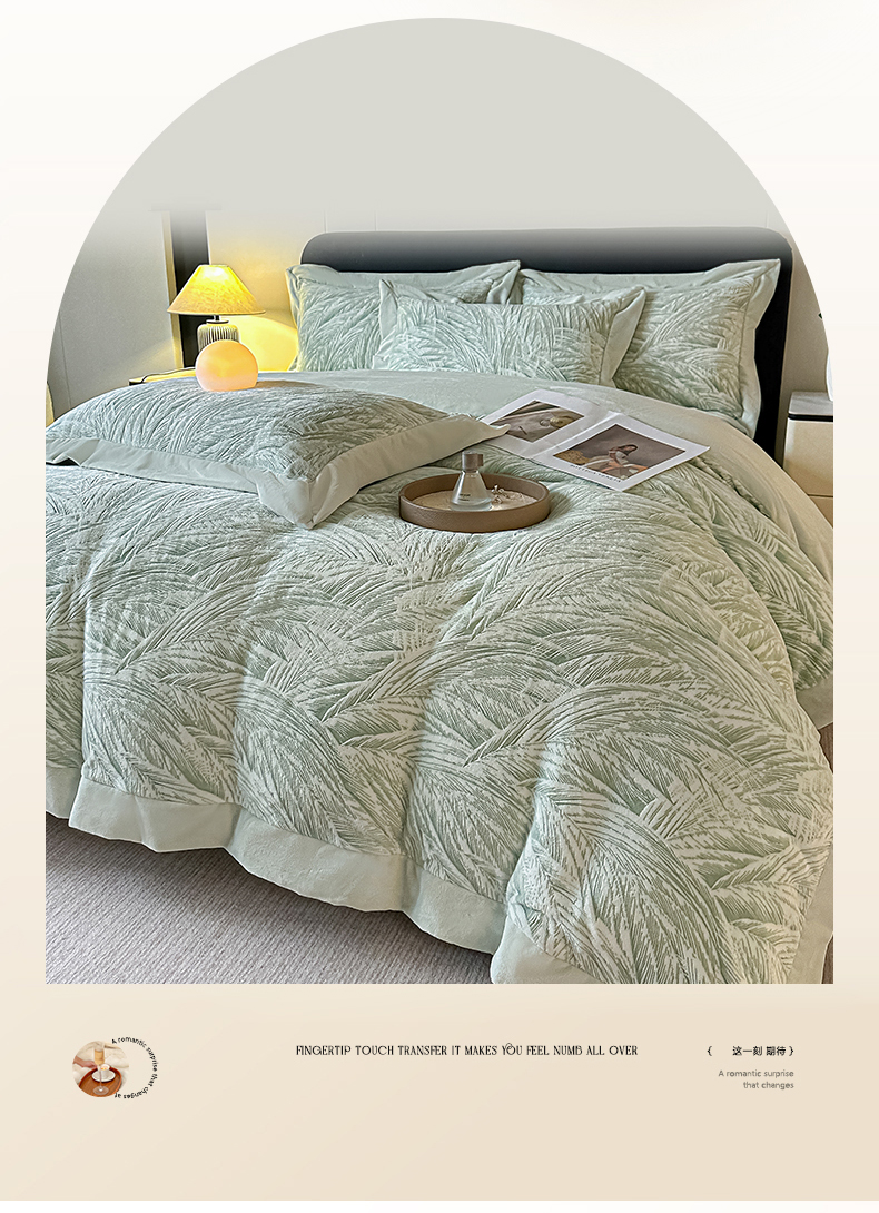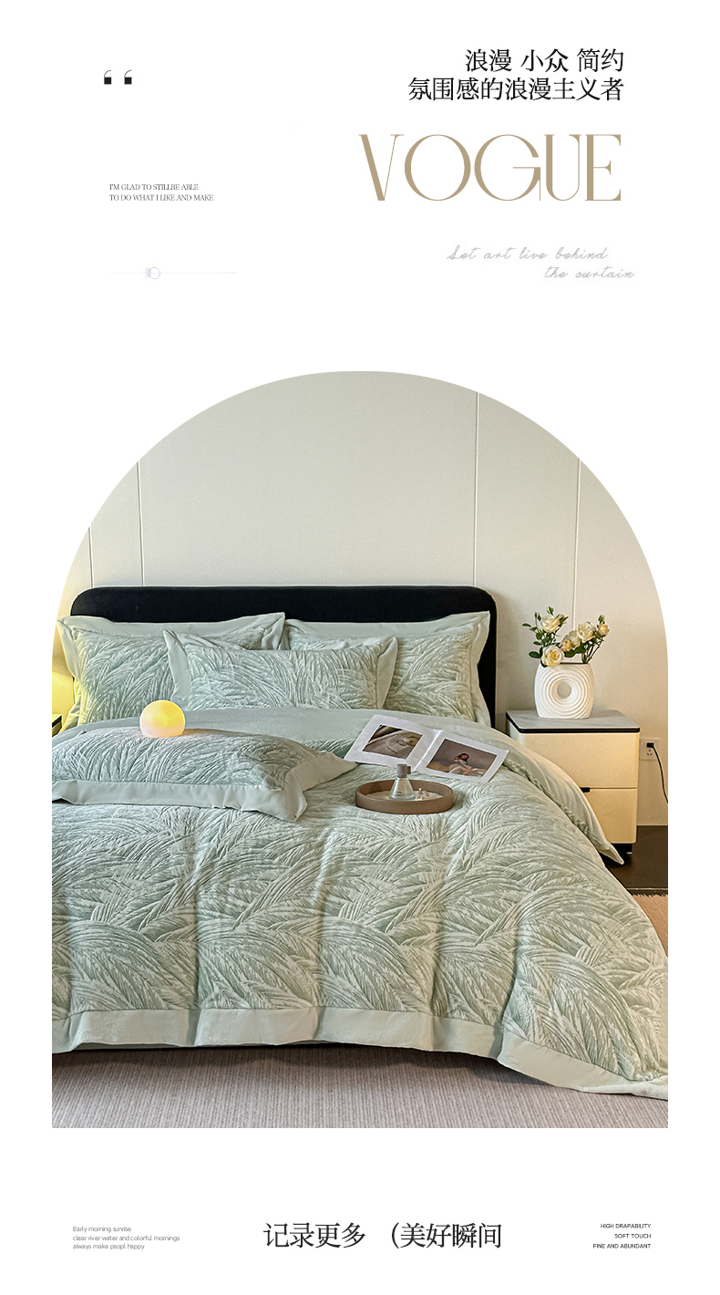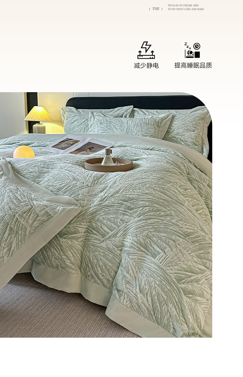商品名称:锦铭源家纺 2025新款烂花75D全消光超柔樱花绒牛奶绒四件套拼角四件套【有买家秀】 芦影摇波-浅绿