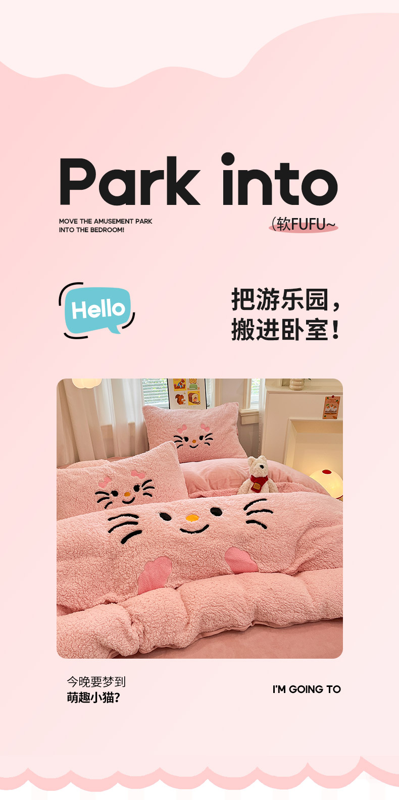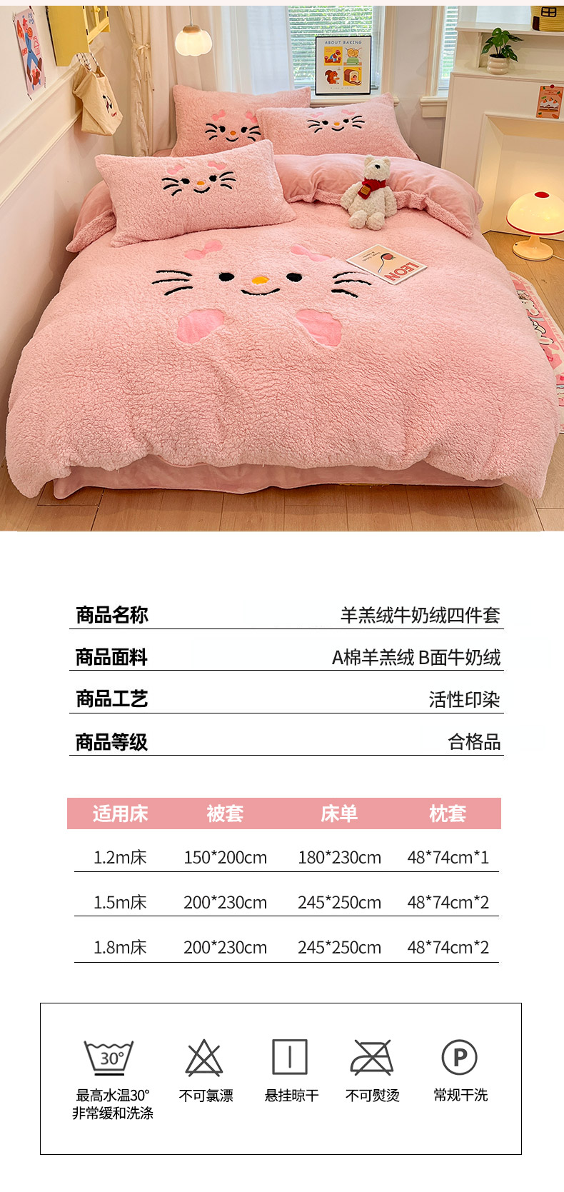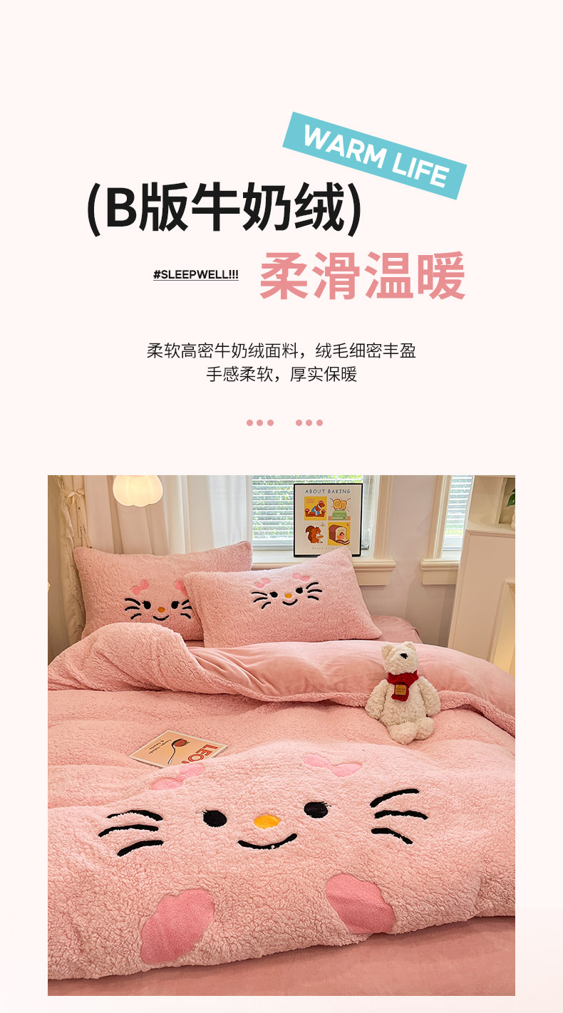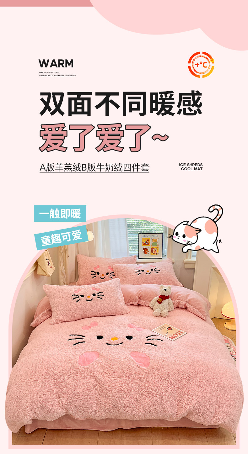 商品名称:乐坊 2025新款大阪羊羔绒牛奶绒卡通四件套冬季加厚保暖 可爱猫咪-粉