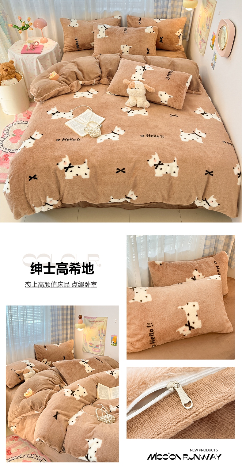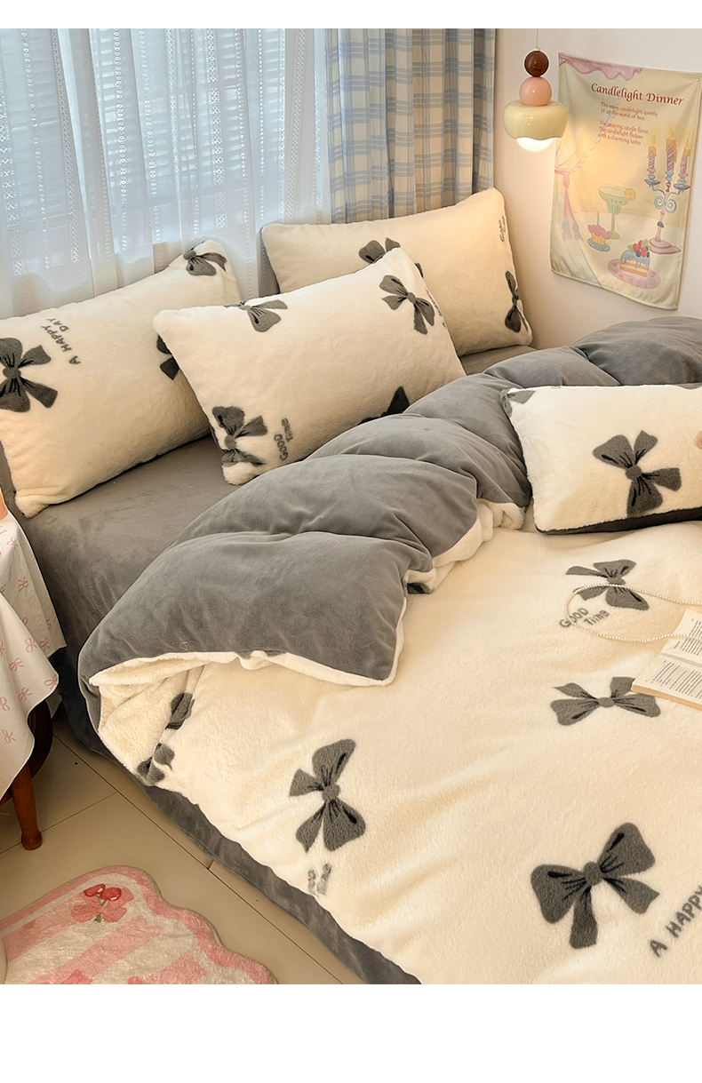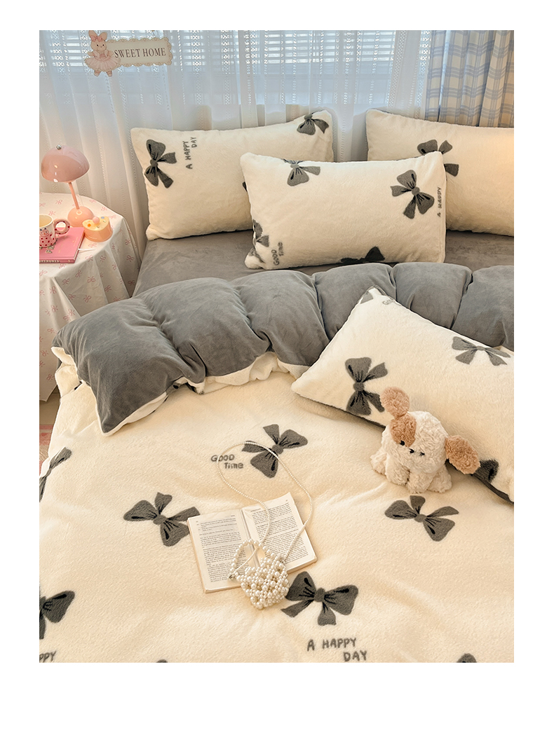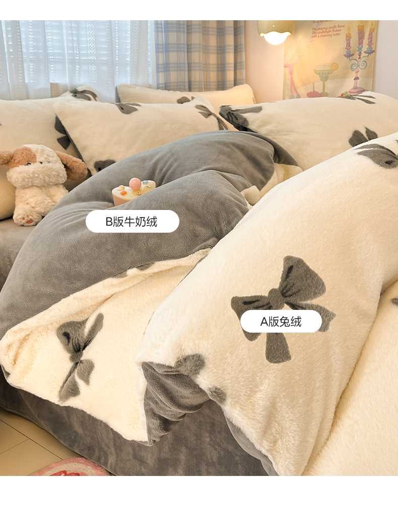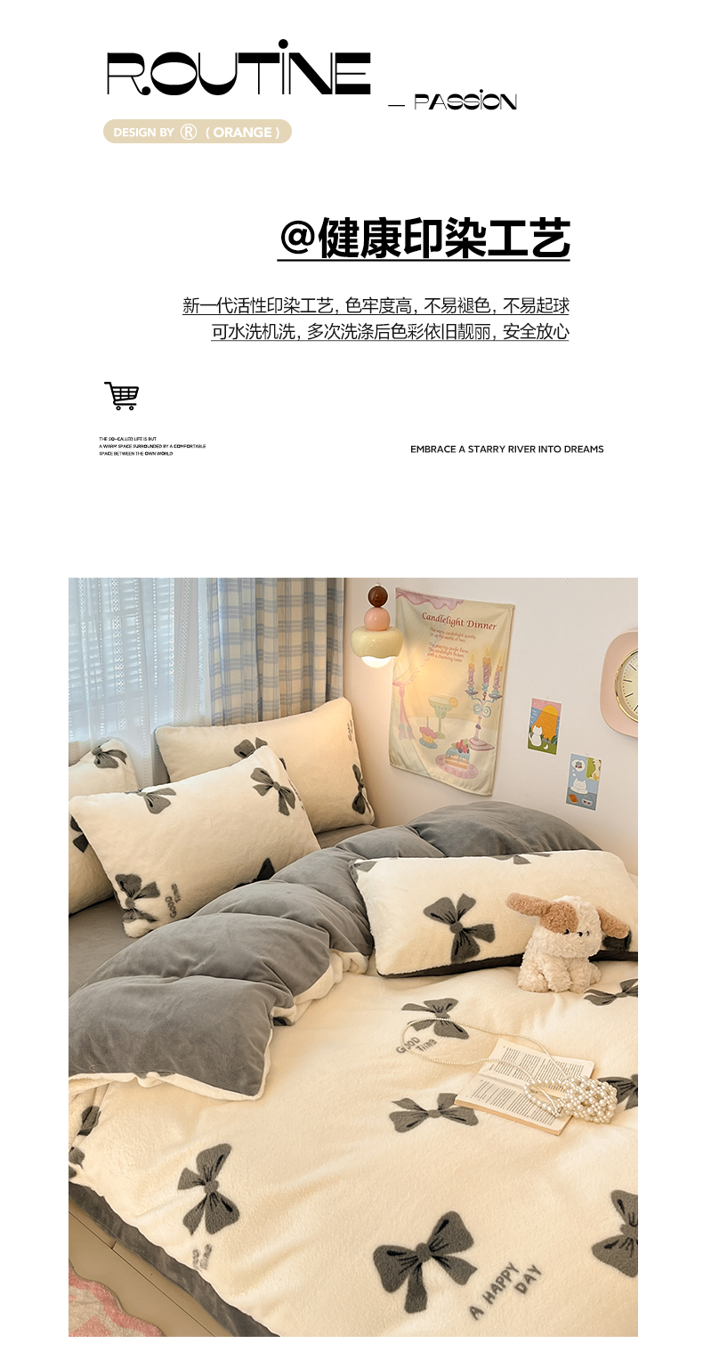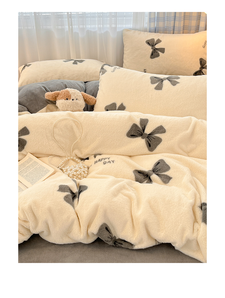 雅居纺家纺 2025新款保暖舒适兔绒印花四件套 快乐蝴蝶结