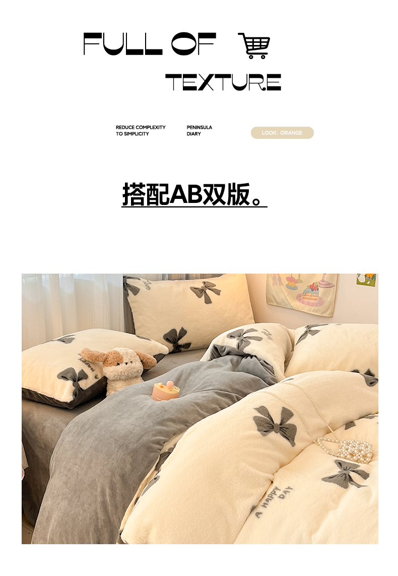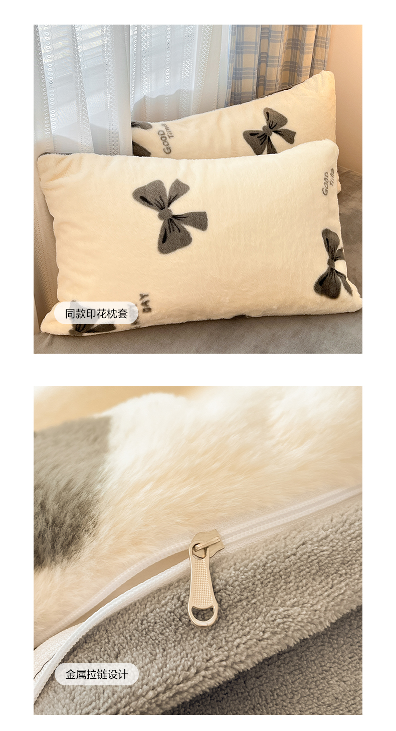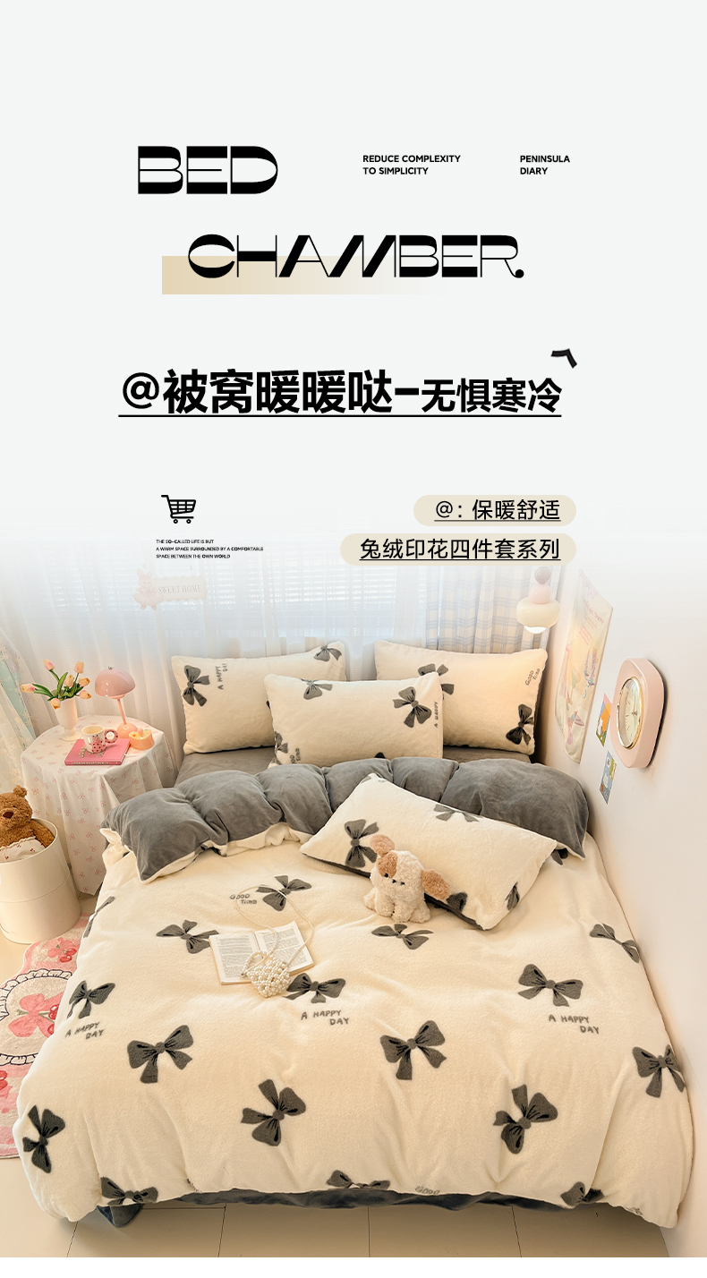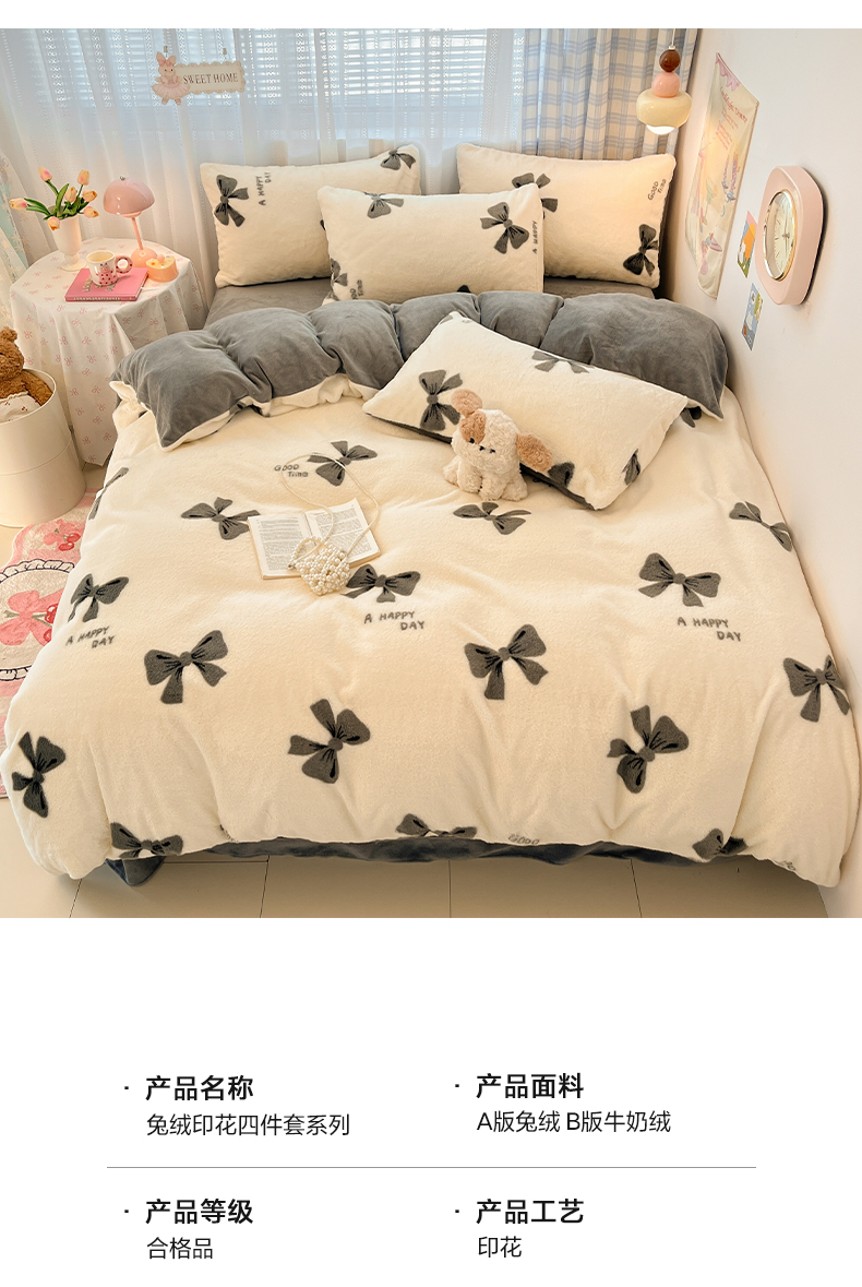 商品名称:雅居纺家纺 2025新款保暖舒适兔绒印花四件套 快乐蝴蝶结