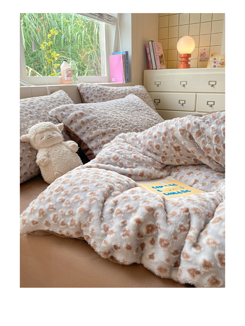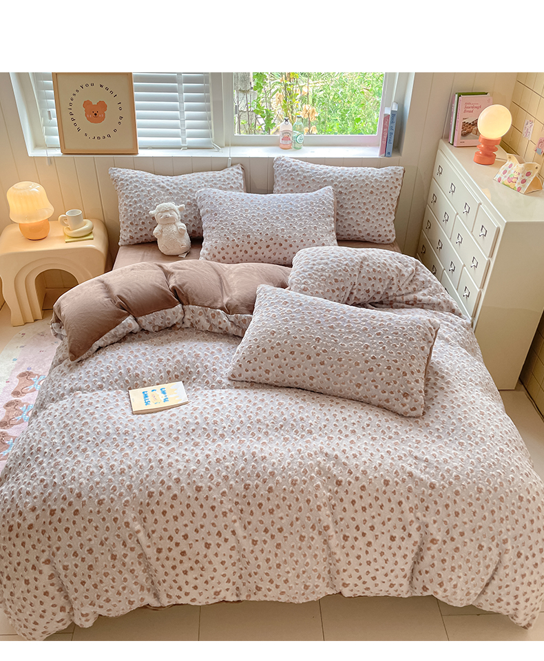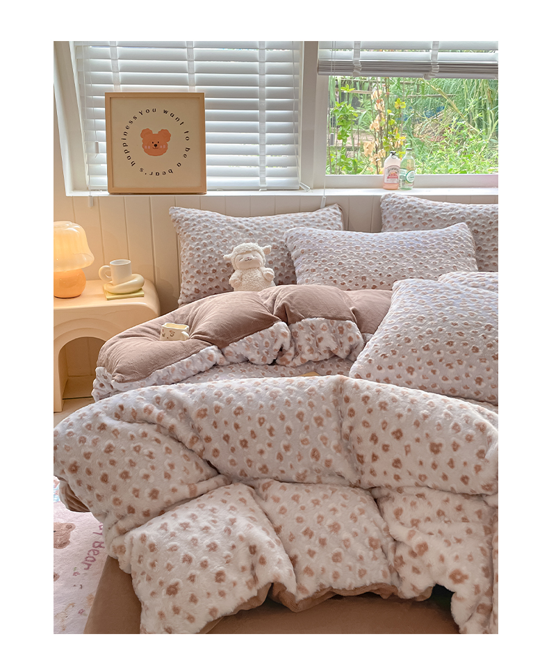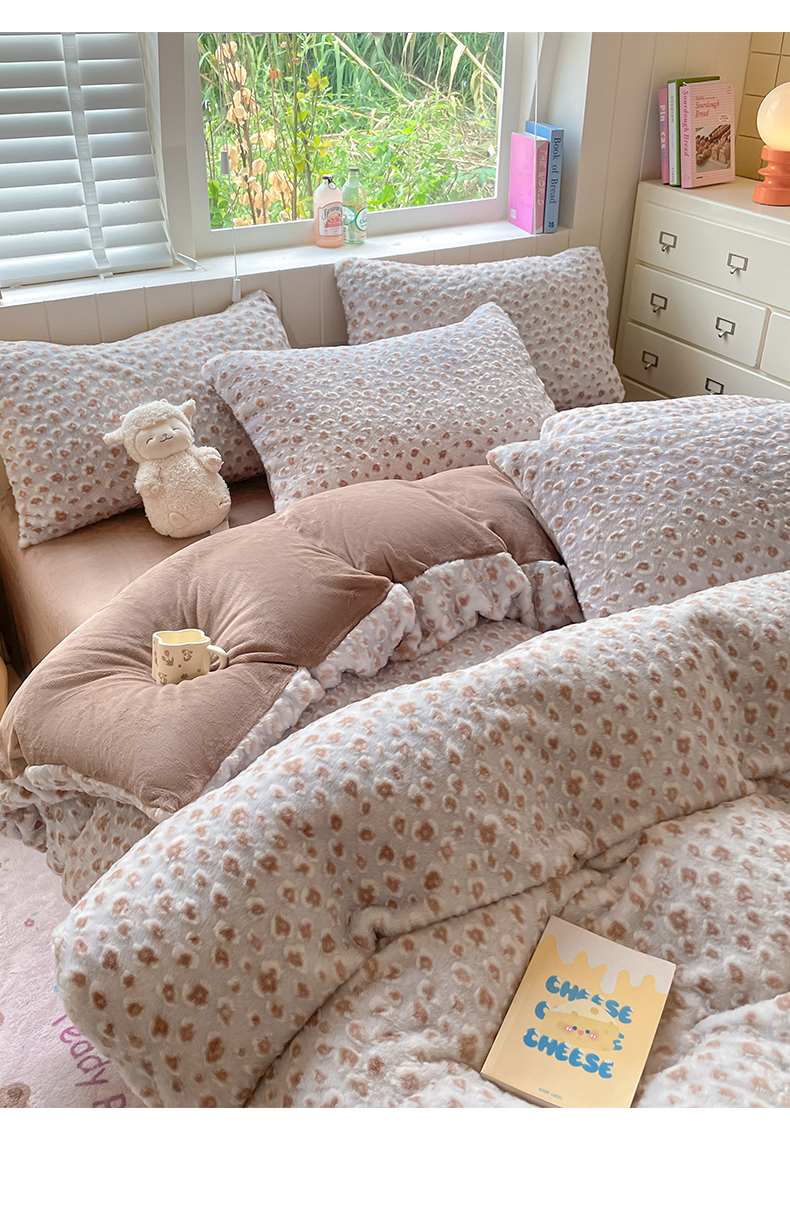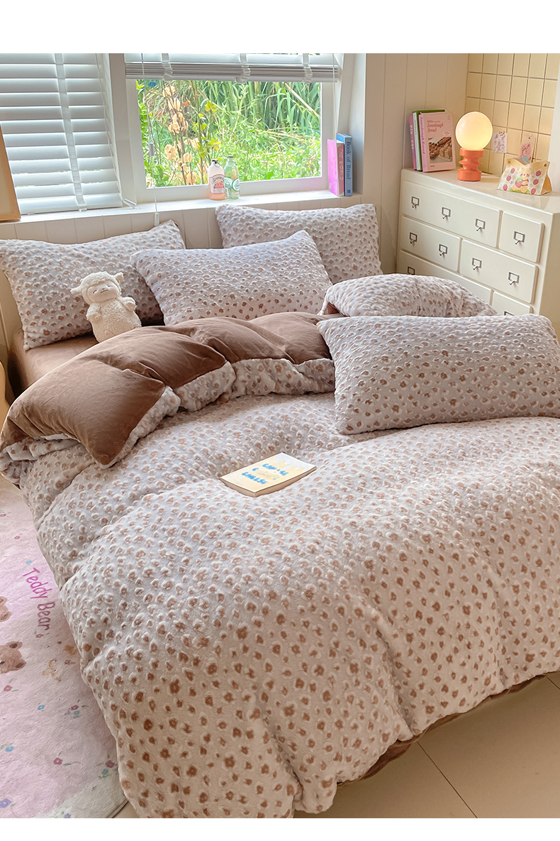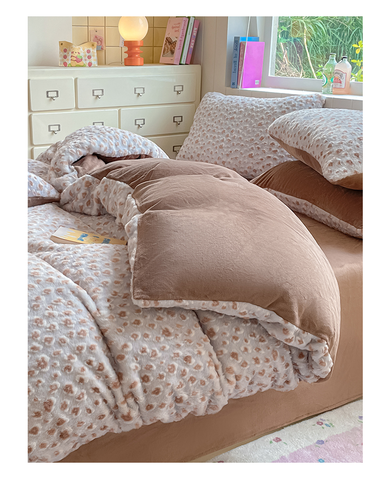 商品名称:雅居纺家纺 2025新款立体雕花兔绒牛奶绒四件套 豹纹-咖啡