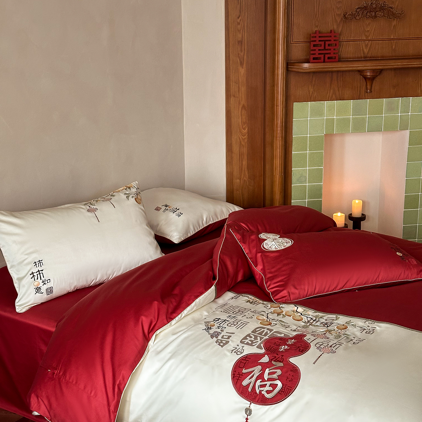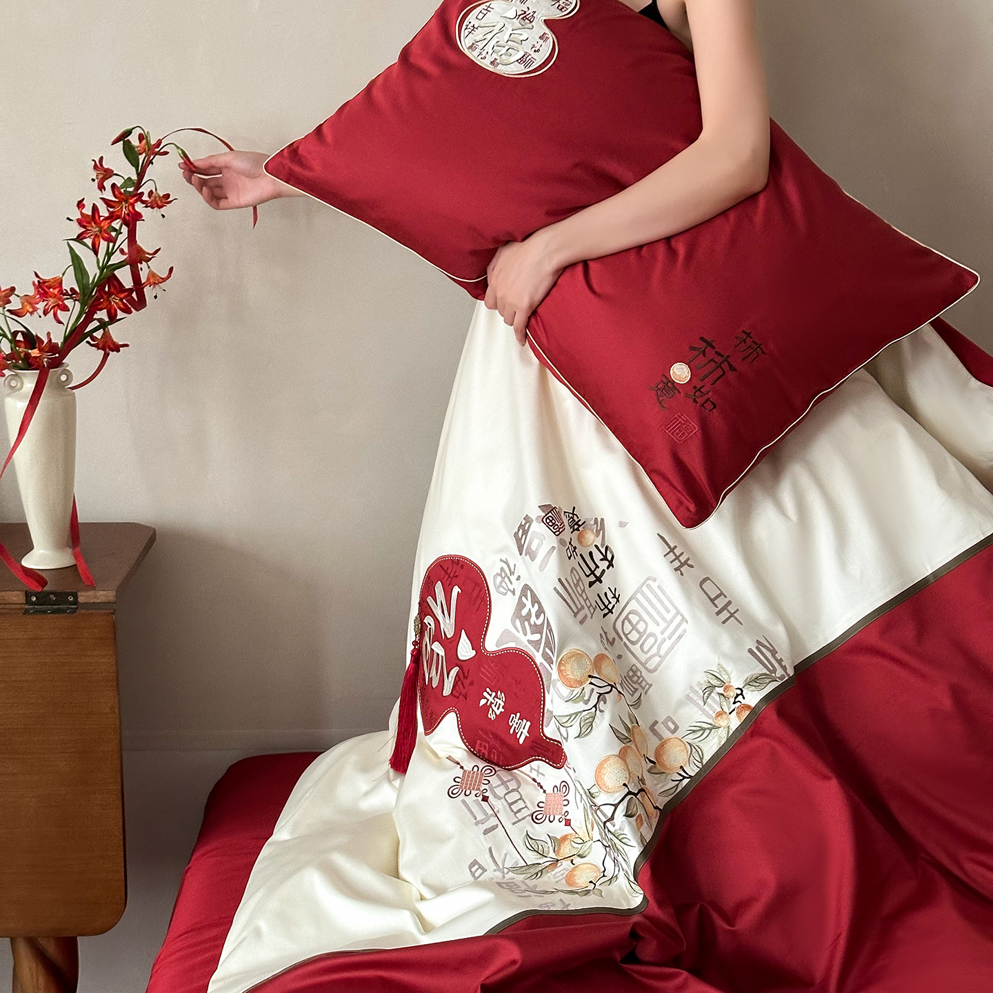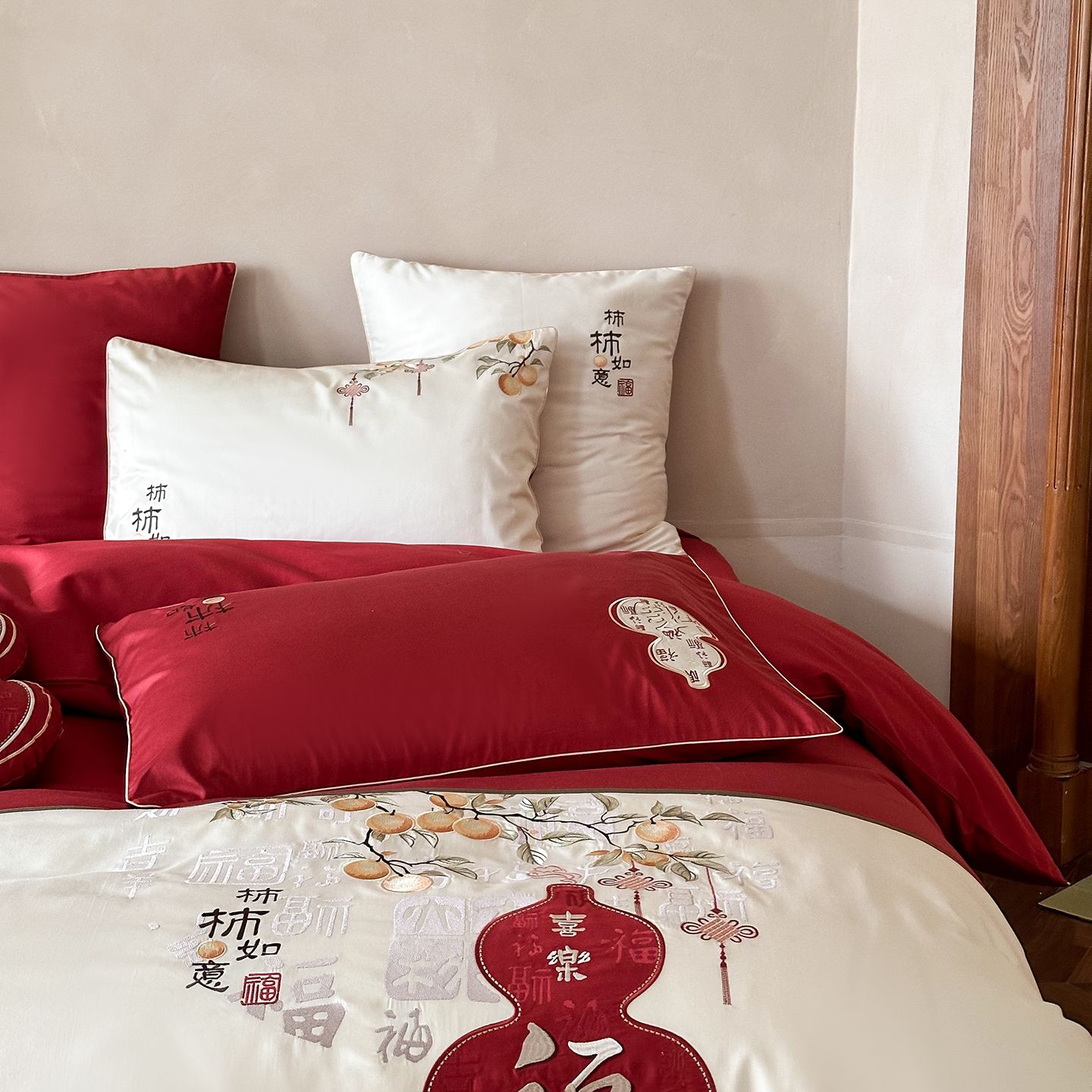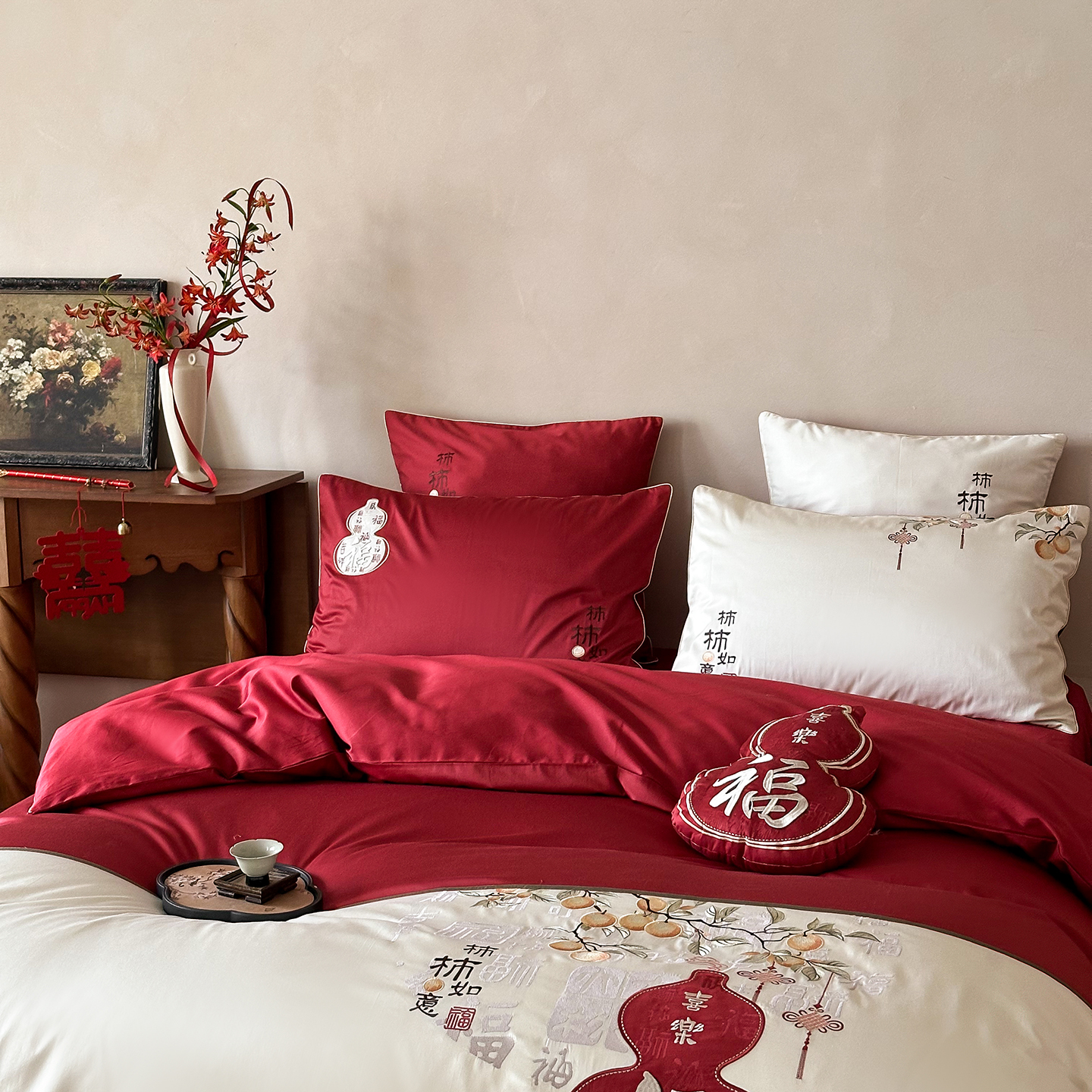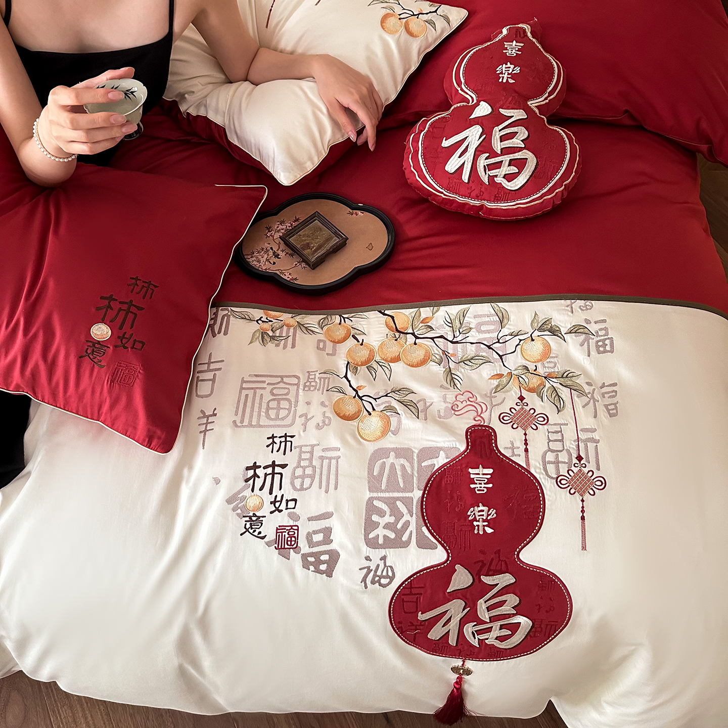 (总)西西家居 2025新款100支长绒棉大红婚庆四件套-柿柿如意
